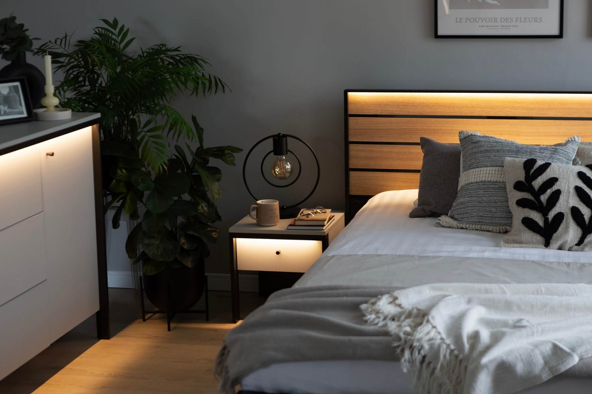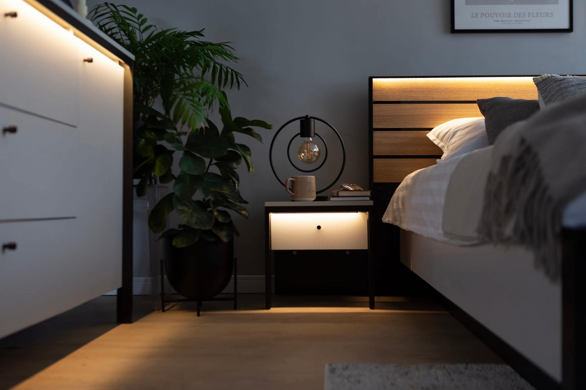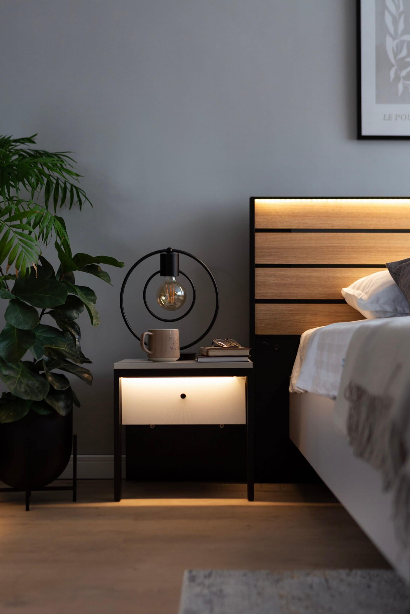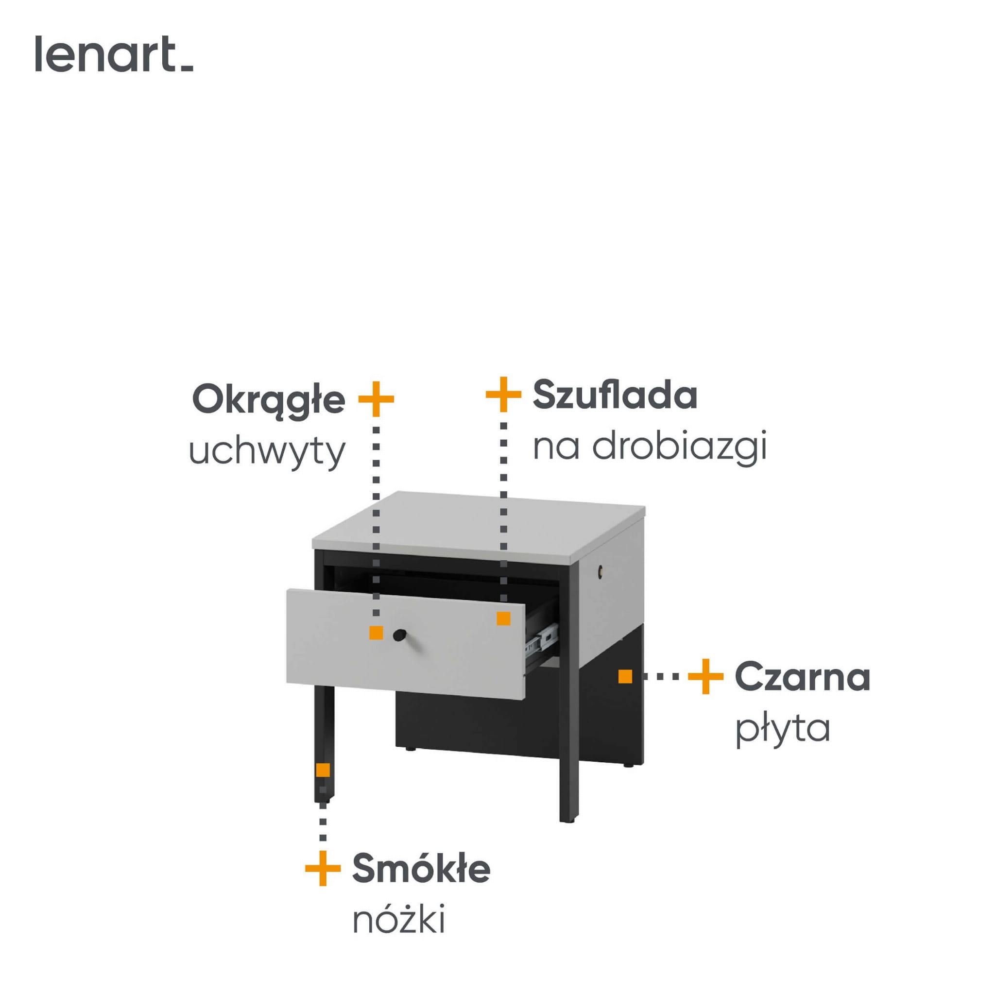 Odkryj magię nowoczesnej kolekcji GRIS z wbudowanym oświetleniem LED o ciepłej barwie i stwórz klimatyczny nastrój w swojej sypialni! To połączenie smukłych nóżek, szarości i czarnych detali, które będą wyróżniać się w każdym domu. Jedną z popularnych brył jest stolik nocny GS-05, który stanowi idealne dopełnienie przestrzeni przy łóżku. Solidna konstrukcja z płyt laminowanych zabezpieczona obrzeżami ABS to najskuteczniejszy sposób, by mebel charakteryzował się wysoką jakością, odpornością i starannym wykończeniem. Dodatkowo opiera się ona na dwóch smukłych nóżkach i tylnej stabilizującej płyty. Pojedyncza szufladka to świetne miejsce na drobiazgi, które chcemy mieć na wyciągnięcie ręki. Elementem, który podkreśla nowoczesny charakter jest z kolei wbudowane klimatyczne oświetlenie LED.