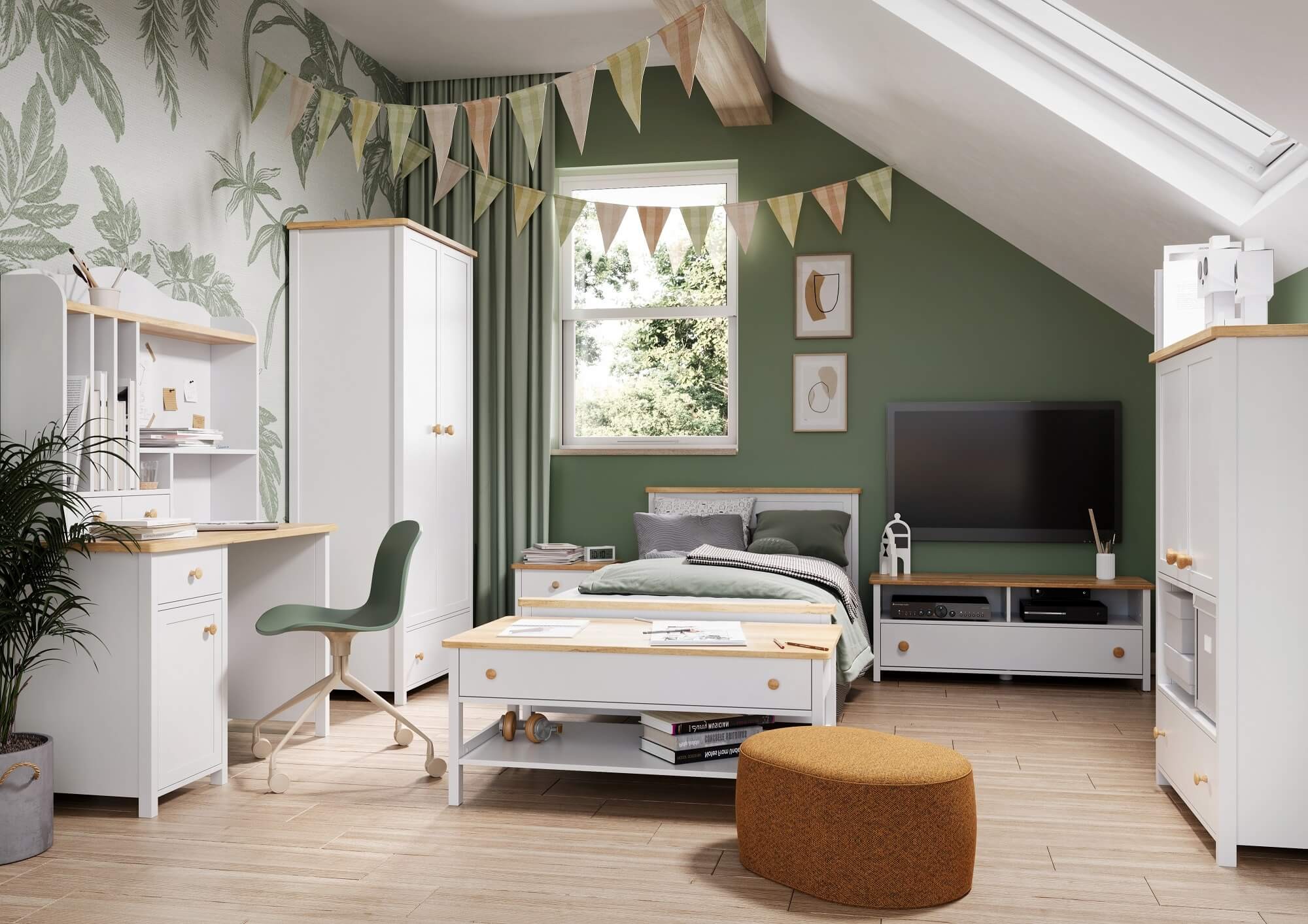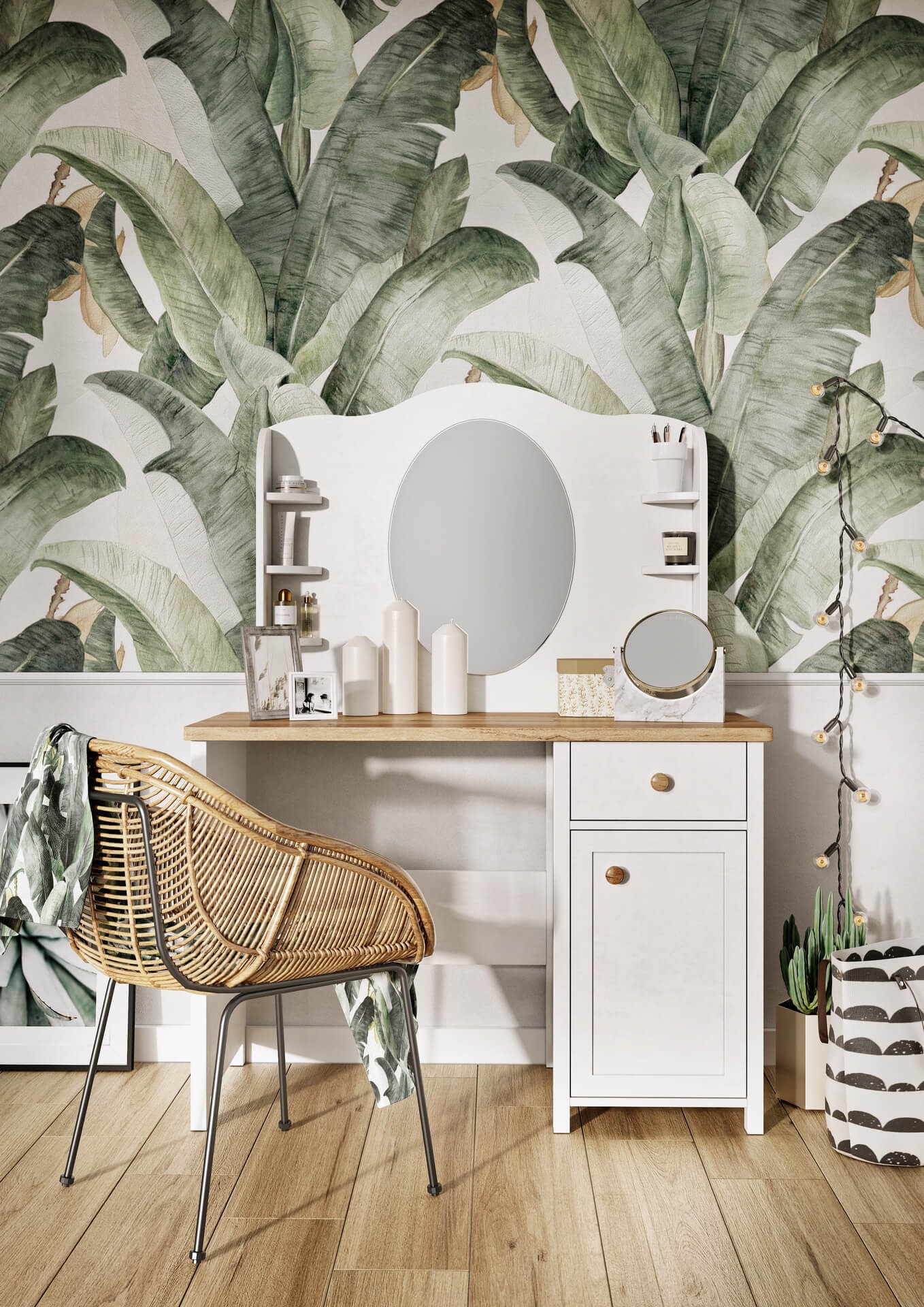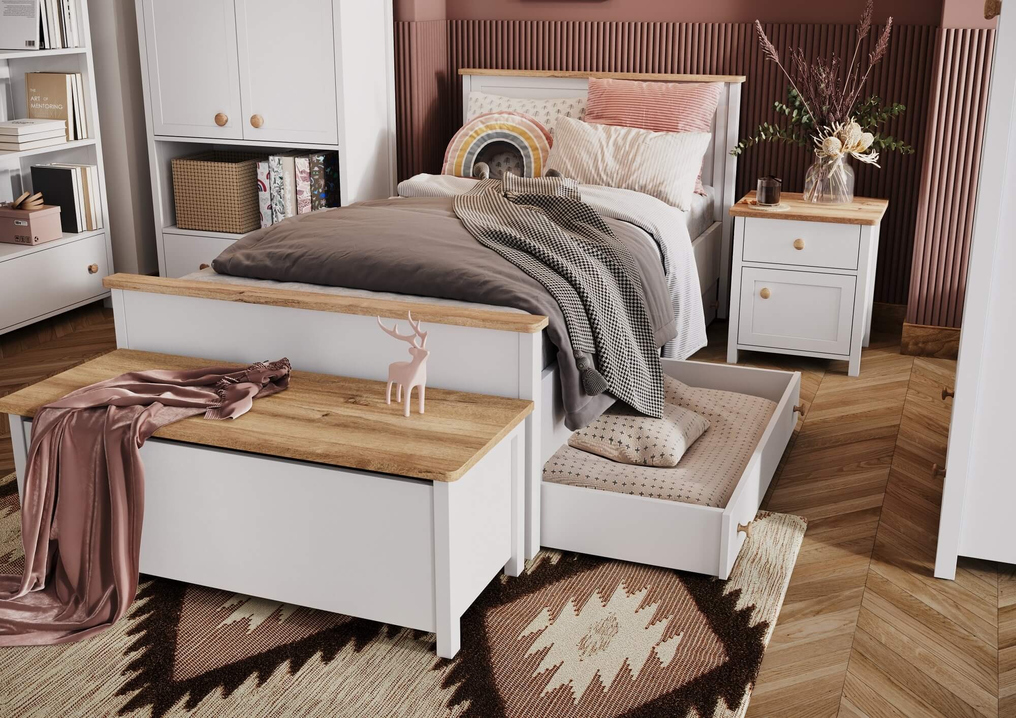 Biały stolik nocny w stylu skandynawskim to idealny pomysł na uzupełnienie sypialni z kolekcją STORY. Połączenie białego frontu z drewnianym blatem i subtelnymi uchwytami w ciepłym odcieniu dąb nash prezentuje się fantastycznie. Taki duet idealnie uzupełni przestrzeń w stylu skandynawskim, doda ciepłego i przytulnego uroku, a także podkreśli jasną i spójną estetykę. Idealne rozwiązanie do sypialni, w której szukamy ukojenia i spokojnych barw sprzyjających wypoczynkowi.