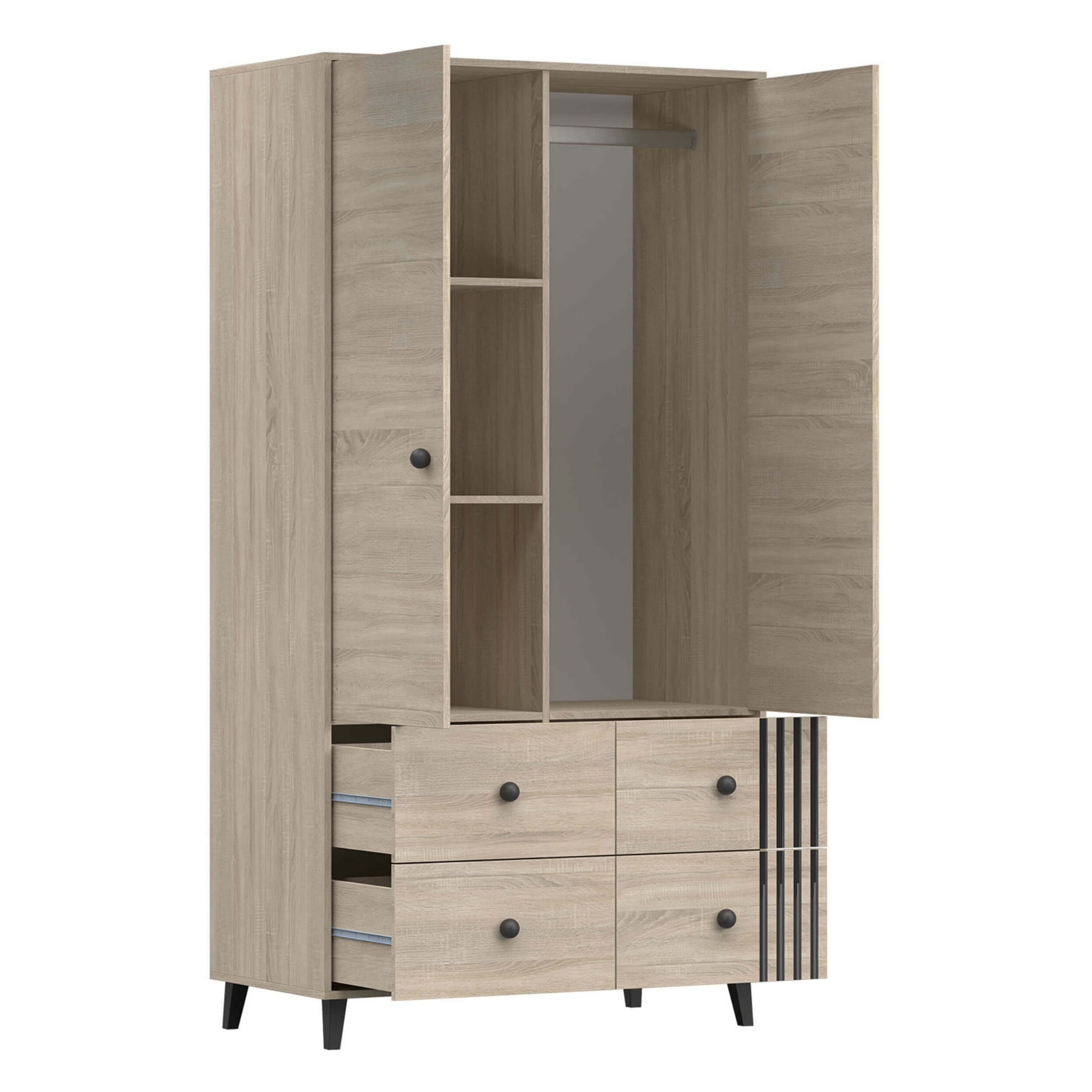 Dwudrzwiowa szafa FOX łączy nowoczesny skandynawski design z funkcjonalnością i wygodą codziennego użytkowania. To pojemna szafa z czterema szufladami, tradycyjnie otwieranymi drzwiami, wyposażona w półki i drążek na ubrania. Jasna kolorystyka szafy ze skórzanymi uchwytami dodaje jej uroku i nadaje wnętrzu wyjątkowy charakter.