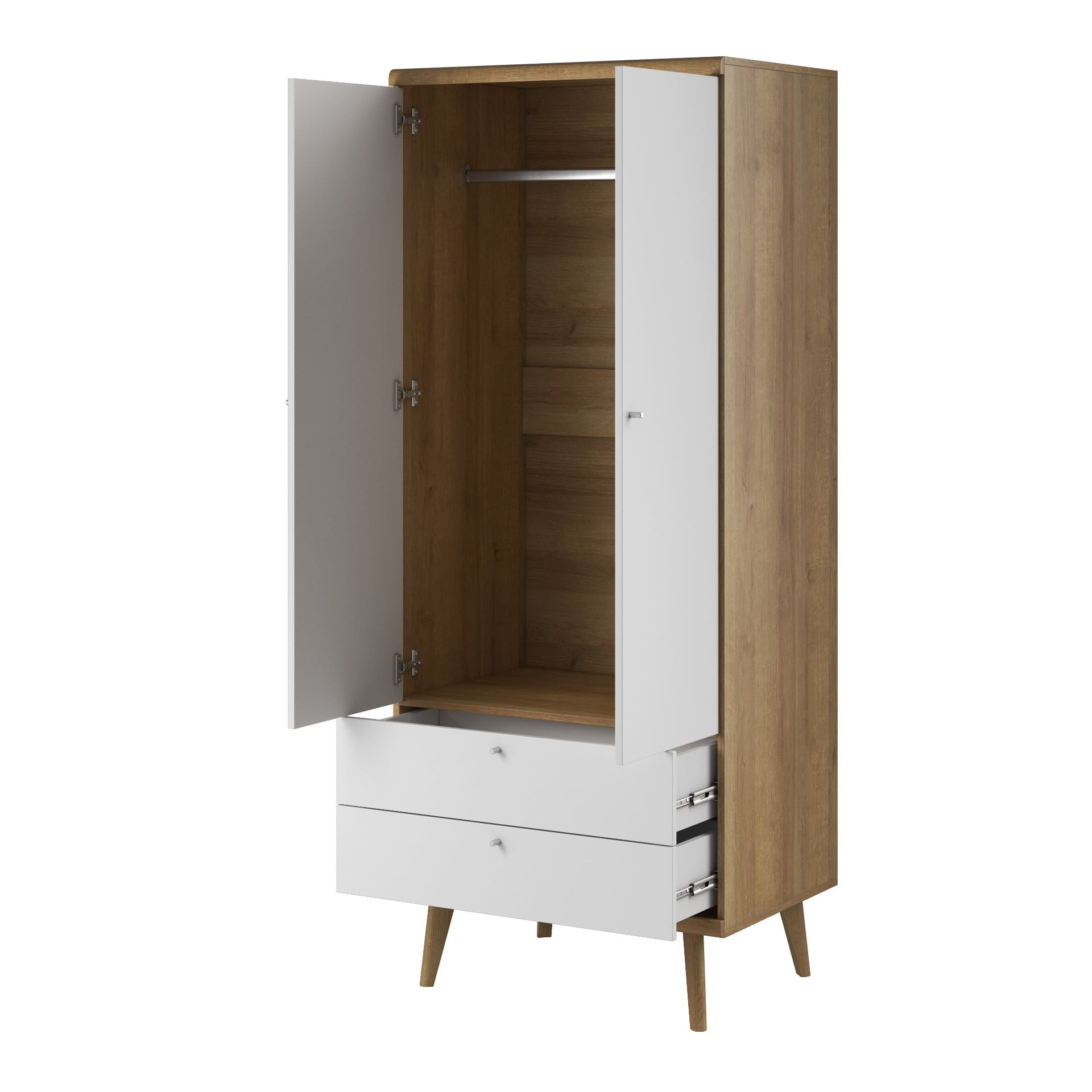 Szafa skandynawska w przepięknym, naturalnym odcieniu dąb riviera świetnie komponuje się z białym frontem. Wyposażona jest w pakowną wnękę z uchwytem na wieszaki oraz wygodne i funkcjonalne szuflady, by przechowywanie było naprawdę proste i wygodne!