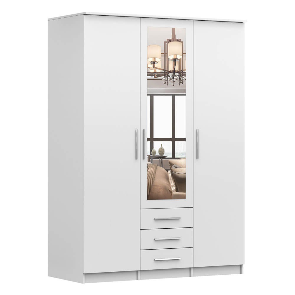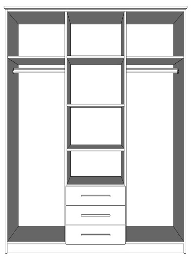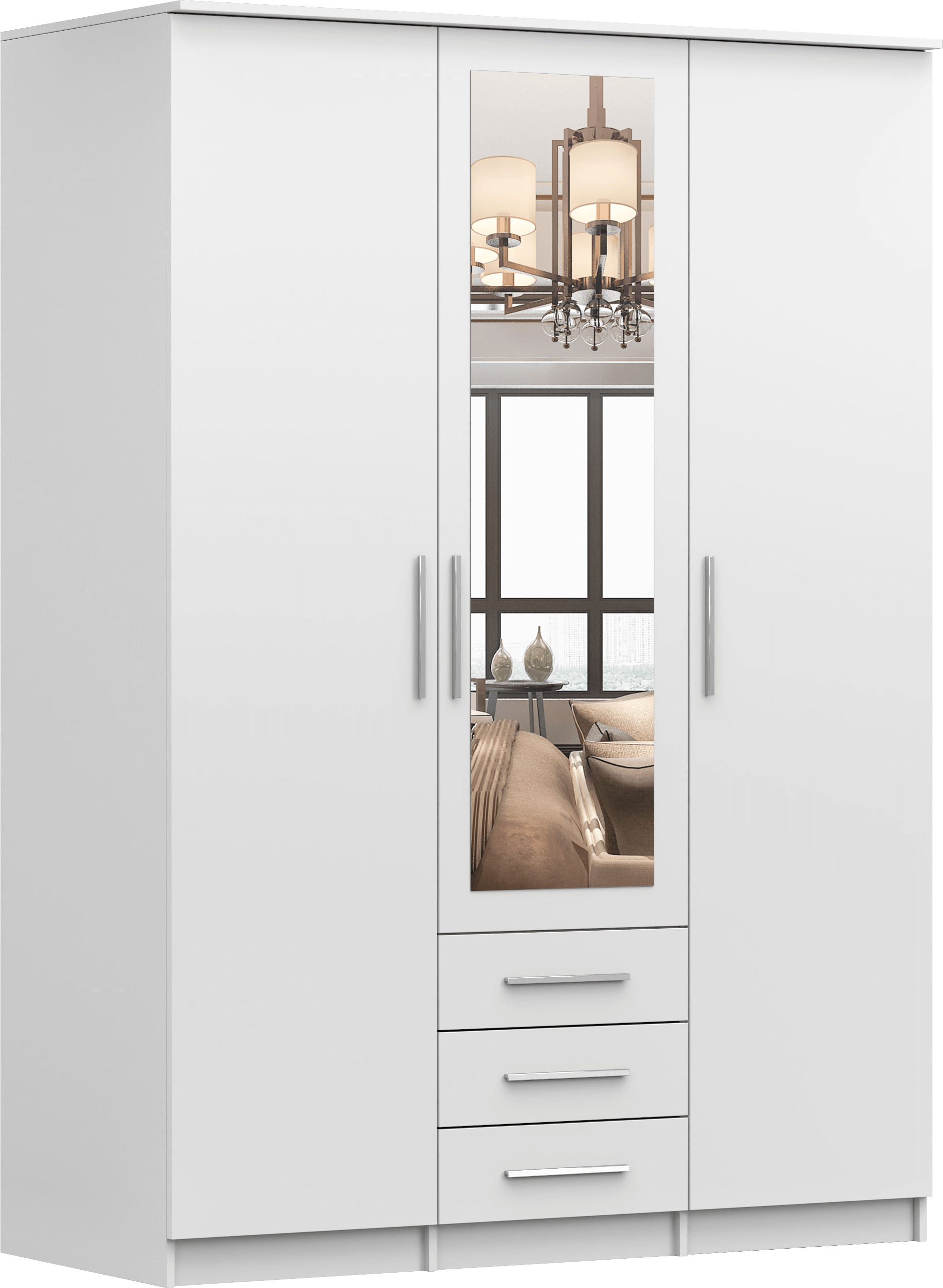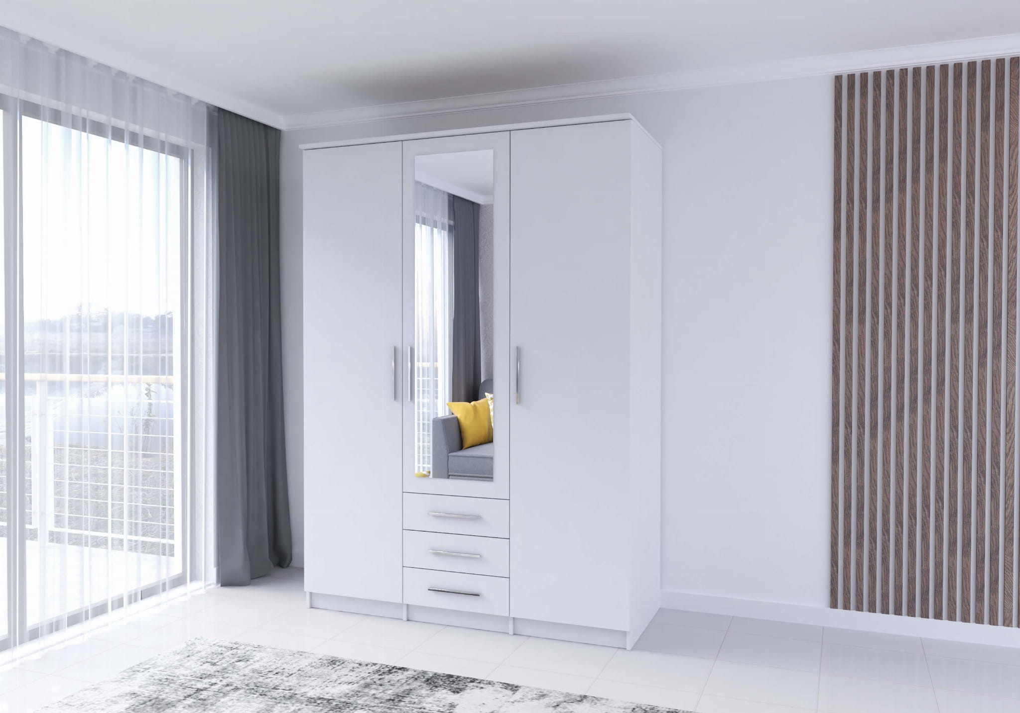 Szafa Szantal 3D to praktyczny i stylowy mebel o klasycznie otwieranych frontach, który doskonale sprawdzi się w każdej sypialni, garderobie lub przedpokoju. Dzięki przemyślanej konstrukcji i eleganckiemu designowi zapewnia nie tylko wygodę użytkowania, ale i estetyczny wygląd wnętrza. Funkcjonalne wnętrze i komfort użytkowania Model wyposażony jest w dwie przestrzenie z drążkami na ubrania oraz sześć pojemnych półek, które umożliwiają przechowywanie zarówno odzieży wiszącej, jak i złożonej. Dodatkowo w dolnej części znajdują się trzy pakowne szuflady, idealne na bieliznę, dodatki lub drobiazgi. Na jednym z frontów znajduje się lustro o wymiarach 143,7 × 39,5 cm, które optycznie powiększa przestrzeń i dodaje meblowi elegancji. Całość opiera się na stabilnym cokole, co podkreśla solidność konstrukcji.