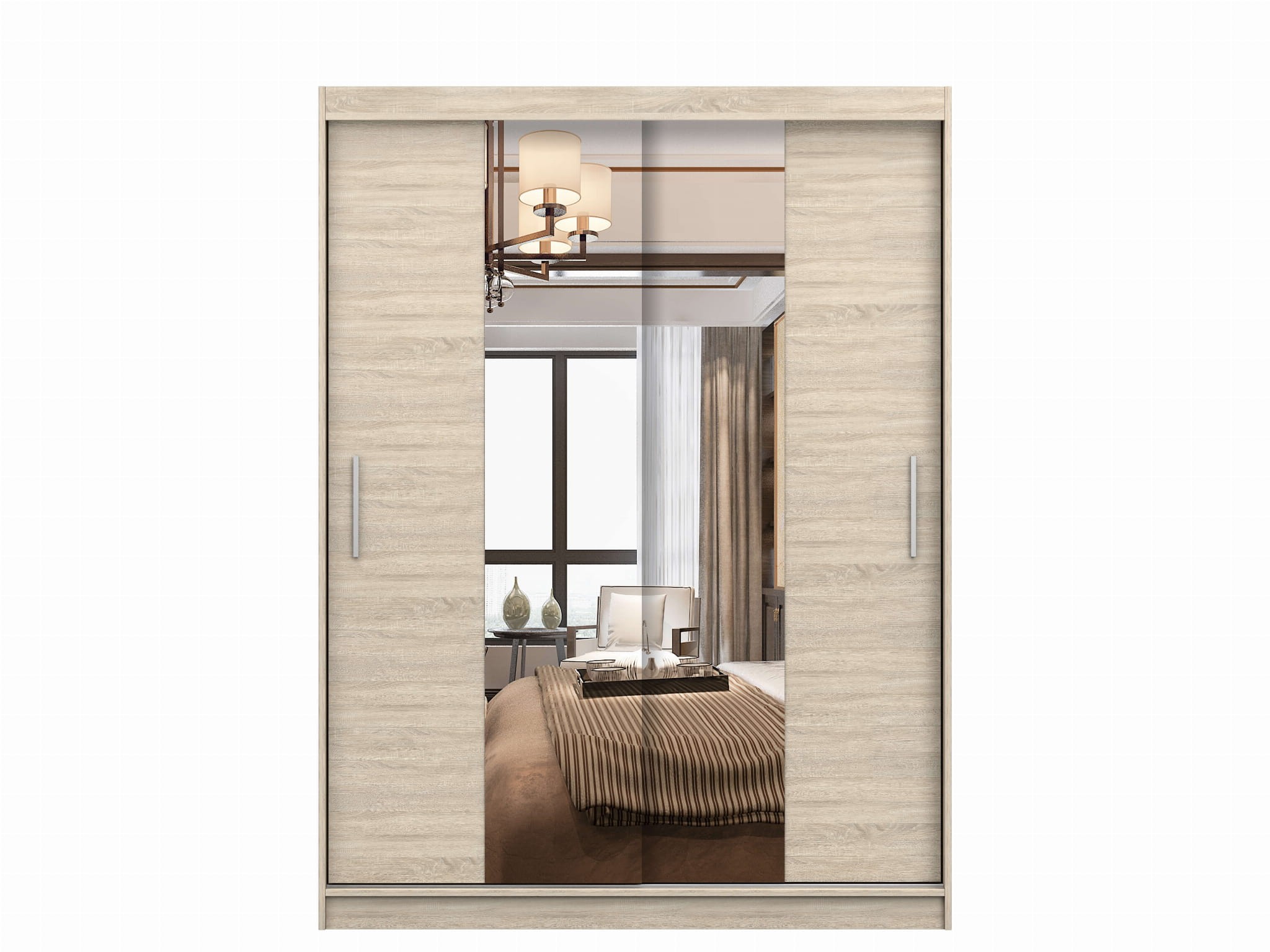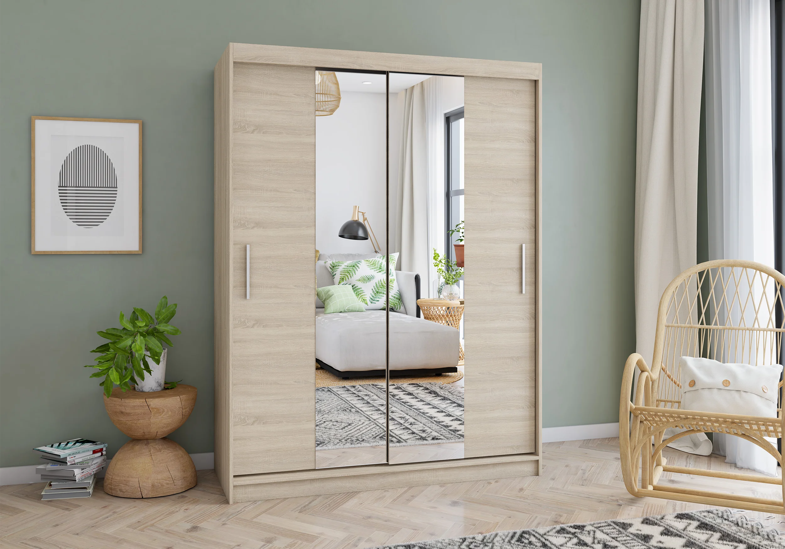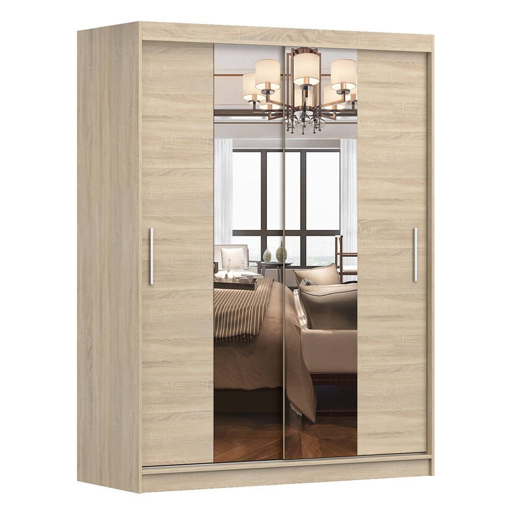 Szafa VISTA 01 o szerokości 150 cm w kolorze dąb sonoma to połączenie elegancji, funkcjonalności i solidnego wykonania. Naturalne wykończenie w odcieniu drewna nadaje jej przytulnego charakteru i sprawia, że idealnie wpisuje się w nowoczesne oraz klasyczne aranżacje wnętrz. Front zdobią dwa duże lustra, które nie tylko stanowią praktyczny element wyposażenia, ale również rozświetlają pomieszczenie i optycznie je powiększają. System drzwi przesuwnych zapewnia wygodę codziennego użytkowania i pozwala zaoszczędzić miejsce, dzięki czemu szafa świetnie sprawdzi się także w mniejszych pomieszczeniach. Wnętrze mebla zostało zaprojektowane z myślą o maksymalnej funkcjonalności — jedna część posiada drążek na ubrania, a druga pięć pojemnych półek, które ułatwiają utrzymanie porządku. Solidna konstrukcja wykonana z płyty laminowanej o grubości 16 mm gwarantuje trwałość i odporność na uszkodzenia, a obrzeża zabezpieczone okleiną ABS chronią krawędzie przed zużyciem. Szafa VISTA 01 to mebel, który łączy stylowy wygląd z praktycznymi rozwiązaniami. Dla większej funkcjonalności można ją uzupełnić o kontenerek z trzema szufladami, który zwiększa przestrzeń do przechowywania i podnosi komfort użytkowania.