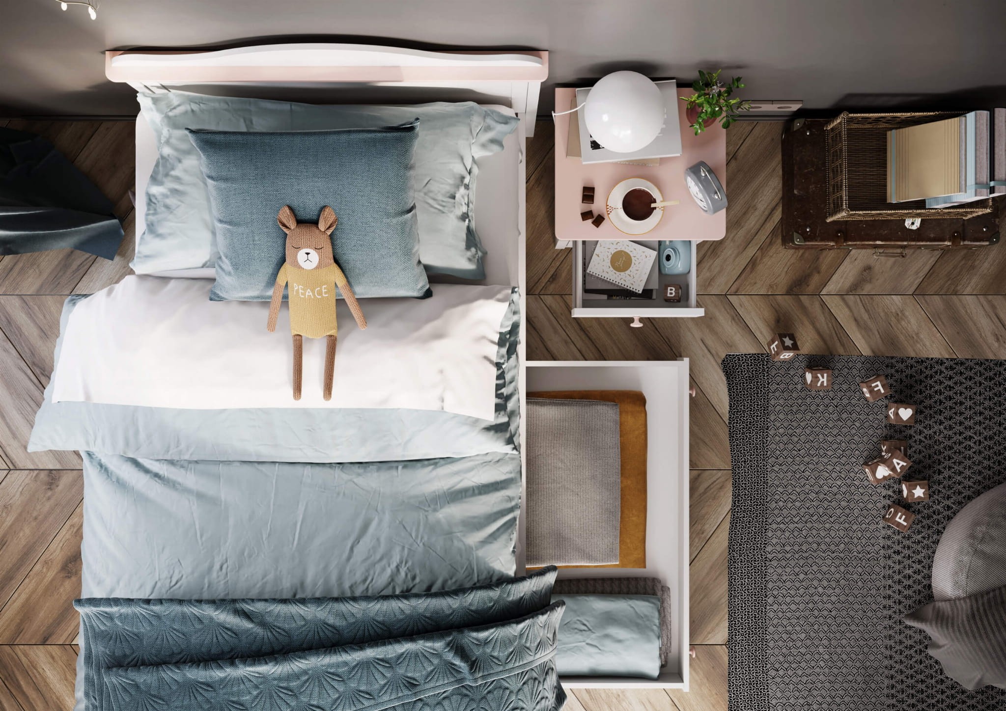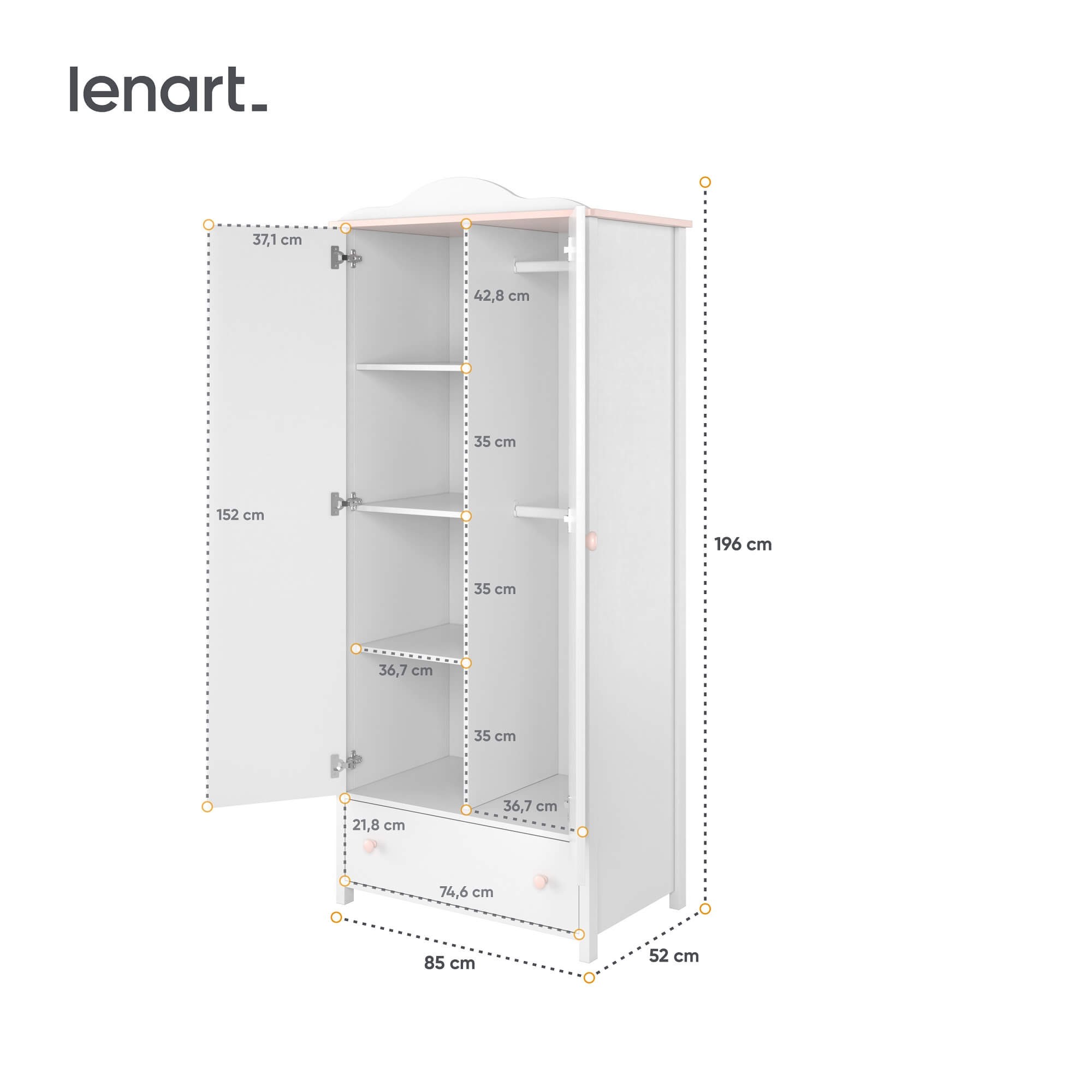 Proste, subtelne linie i śnieżnobiały front z subtelnym frezowaniem w połączeniu z różowymi wstawkami i uchwytami w formie gałki wyróżniają się magicznym urokiem, co sprawia, że kolekcja LUNA jest najlepszym wyborem do pokoju małej księżniczki. Szafa dwudrzwiowa z szufladą prezentuje się tak uroczo – górna część przypomina chmurkę, a elementy pudrowego różu sprawiają, że stanie się piękną dekoracją pokoju. Wewnątrz znajduje się duża ilość półek i 2 drążki, które są idealnym miejscem na ubrania Twojej pociechy, ale także pamiątki, zabawki, akcesoria szkolne i inne drobiazgi. Kolejnym atutem jest praktyczna szuflada, do której jest bardzo łatwy dostęp i można w niej przechowywać ubranka lub zdobycze. Mebel wykonany jest z trwałej i odpornej płyty laminowanej, której krawędzie dodatkowo wykończone są obrzeżem ABS, co pozwala uniknąć ewentualnych zadrapań, uszkodzeń i zarysowań. Szafa będzie idealnym dodatkiem do pozostałych mebli z serii LUNA lub harmonijnym uzupełnieniem niemal każdego pokoiku dziewczynki.