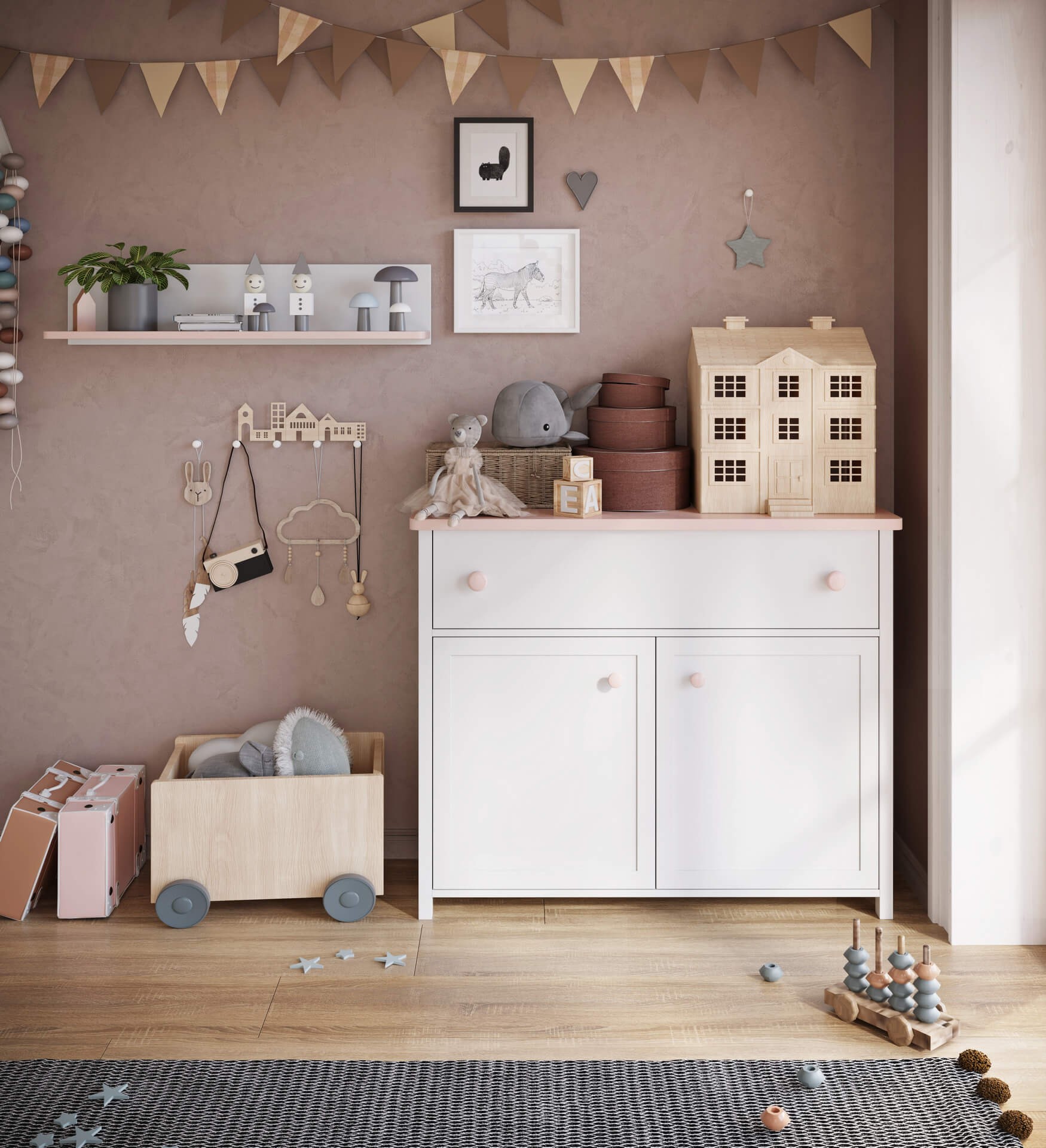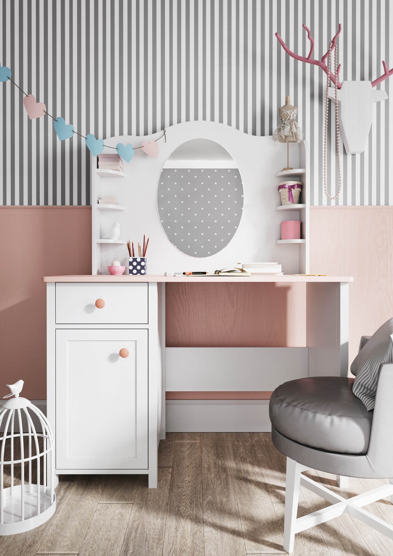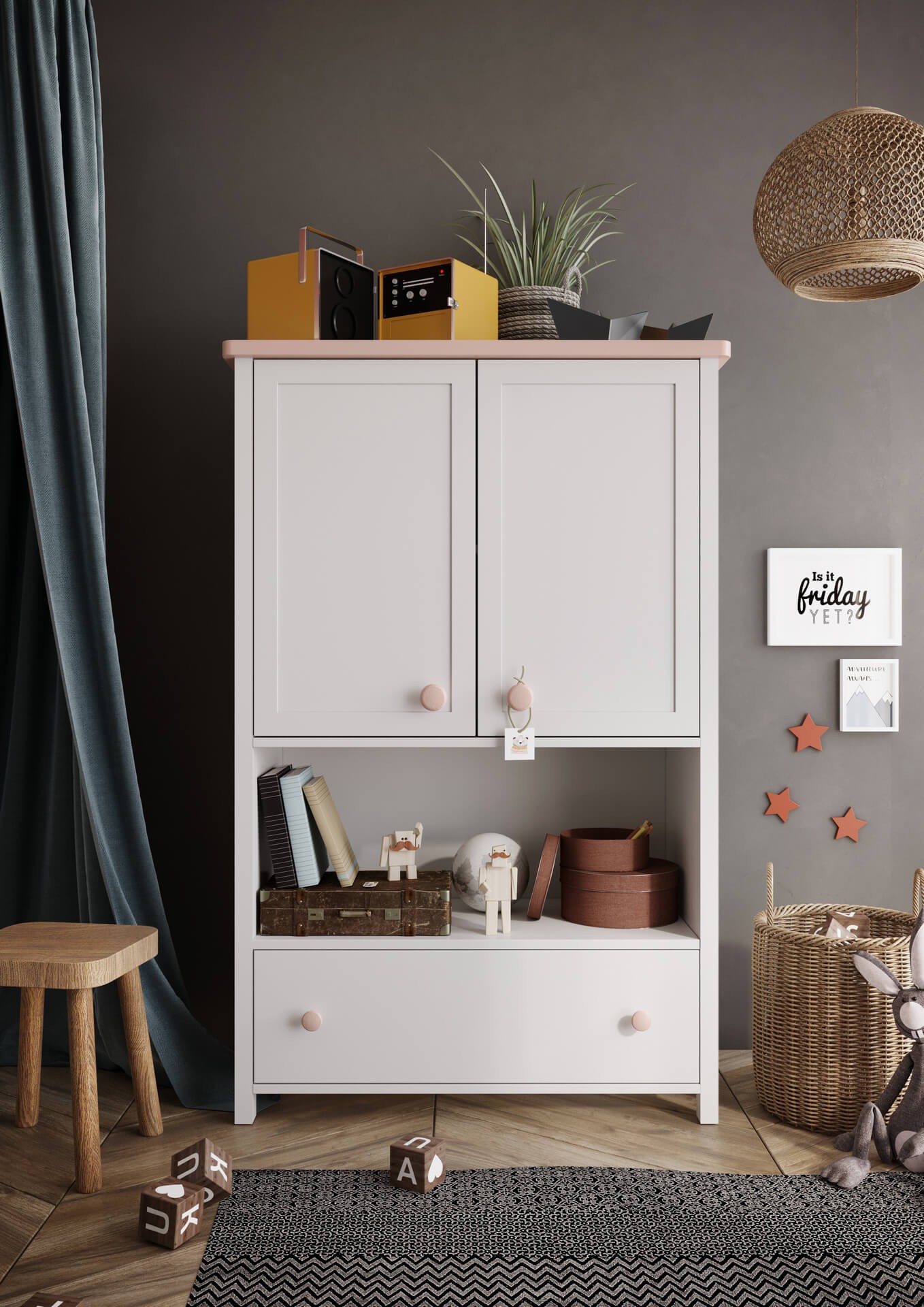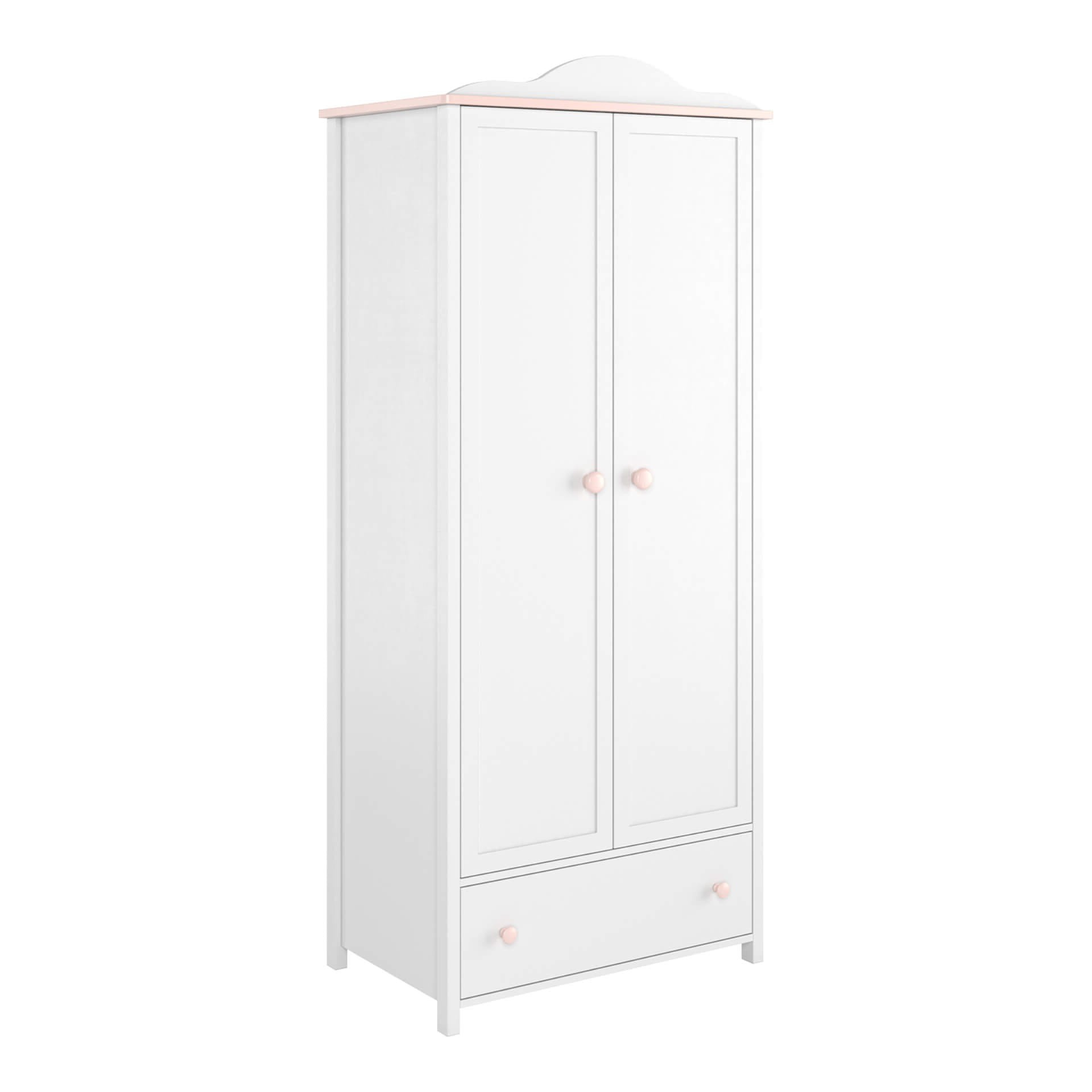 Szafa dwudrzwiowa z szufladą do pokoju dziewczynki – biel i pudrowy róż