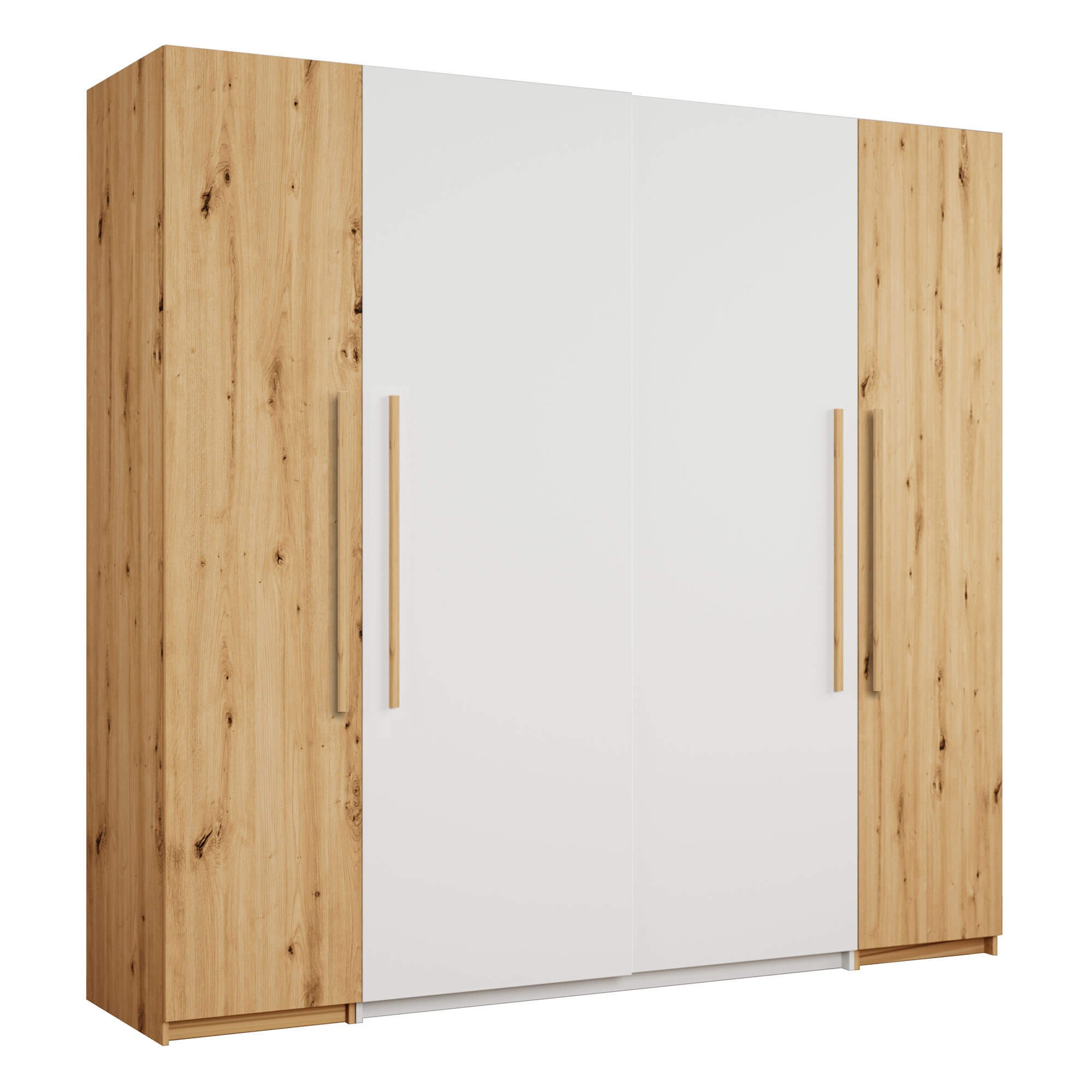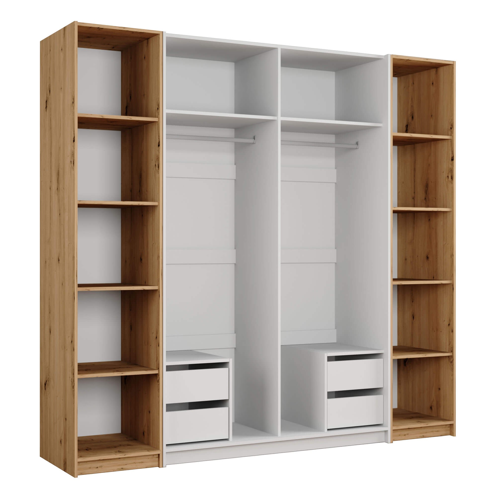 Szafa przesuwna MODENA 250 w kolorze Artisan/Biały Mat to nowoczesna propozycja do sypialni, garderoby lub przedpokoju, łącząca funkcjonalność z eleganckim designem. Jej solidna bryła o wymiarach 250 cm szerokości i 216 cm wysokości oferuje przemyślaną przestrzeń do przechowywania, idealną dla osób ceniących porządek i estetykę we wnętrzach. Model wyposażony jest w dwoje drzwi przesuwnych, które poruszają się lekko i cicho na prowadnicach, umożliwiając wygodny dostęp do wnętrza nawet w niewielkich pomieszczeniach. Szafa MODENA została zaprojektowana z myślą o maksymalnym komforcie użytkowania — wewnątrz znajdują się dwie przestronne wnęki środkowe, każda wyposażona w drążek na wieszaki oraz szeroką półkę górną, dzięki czemu bez trudu uporządkujesz odzież wierzchnią, koszule czy sezonowe ubrania. Po bokach znajdują się dodatkowe otwarte regały z funkcjonalnymi półkami, które pozwalają na przechowywanie rzeczy codziennego użytku lub dekoracyjnych akcentów. Połączenie ciepłego dekoru drewna Artisan z matową bielą nadaje szafie ponadczasowego charakteru, który doskonale komponuje się zarówno z nowoczesnymi, jak i skandynawskimi aranżacjami wnętrz. MODENA to nie tylko mebel o efektownym wyglądzie, ale przede wszystkim praktyczne rozwiązanie – dzięki konstrukcji bez nóżek, bryła prezentuje się stabilnie i nowocześnie, a jednocześnie łatwiej jest utrzymać czystość wokół niej. Jeżeli szukasz pojemnej, przesuwnej szafy do swojej sypialni, która zapewni Ci wygodę i styl w jednym – szafa MODENA 250 Artisan/Biały Mat będzie doskonałym wyborem.