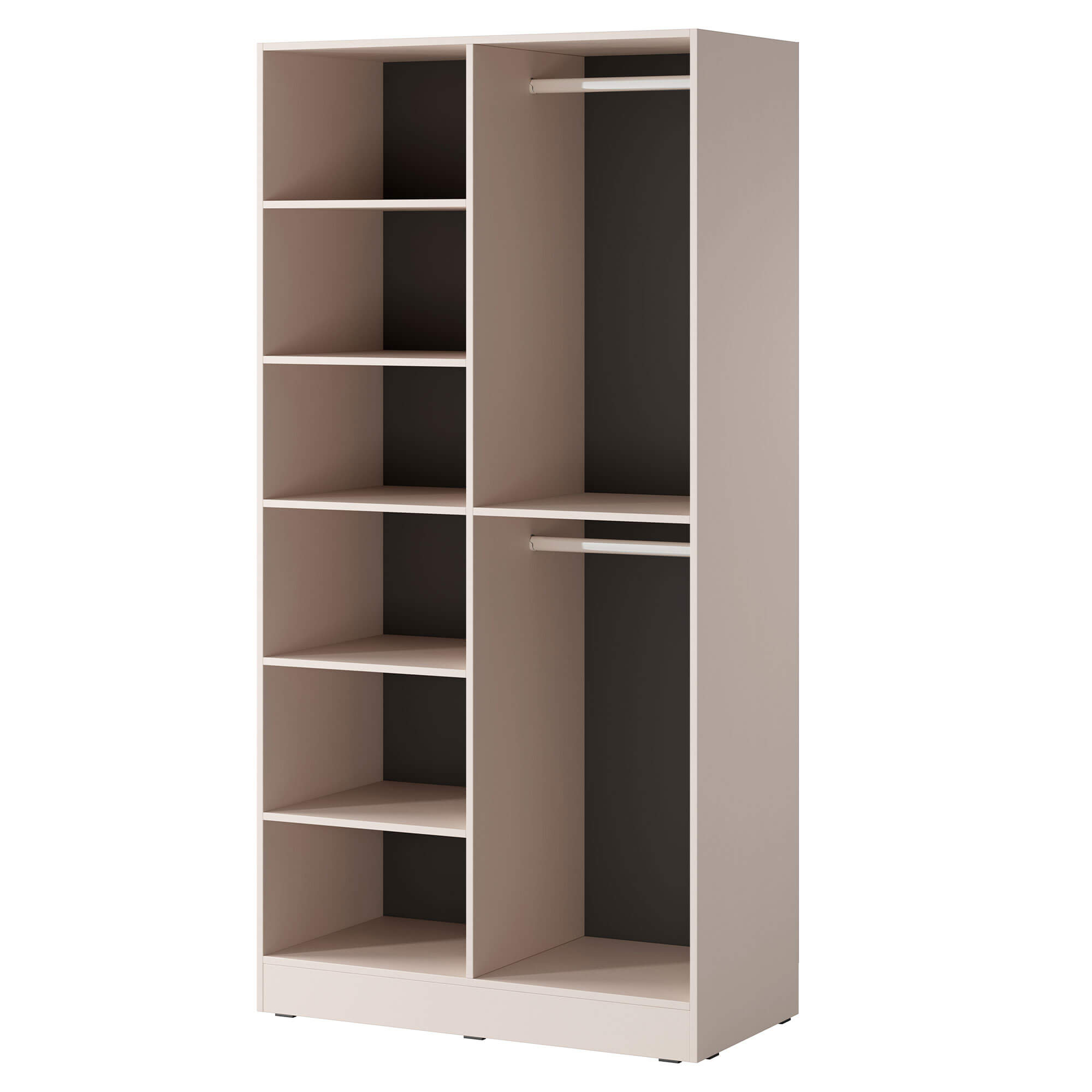 Wnętrze szafy SANDBOX NOVA zostało zaprojektowane z myślą o wygodnym przechowywaniu ubrań oraz dodatków. Podział na dwie funkcjonalne strefy pozwala łatwo uporządkować garderobę i zachować porządek na co dzień. Jedna część wyposażona została w praktyczne półki, które świetnie sprawdzają się do przechowywania złożonych ubrań, tekstyliów lub organizerów. Druga część posiada drążki na wieszaki, dzięki którym można wygodnie zawiesić koszule, marynarki, sukienki czy płaszcze.