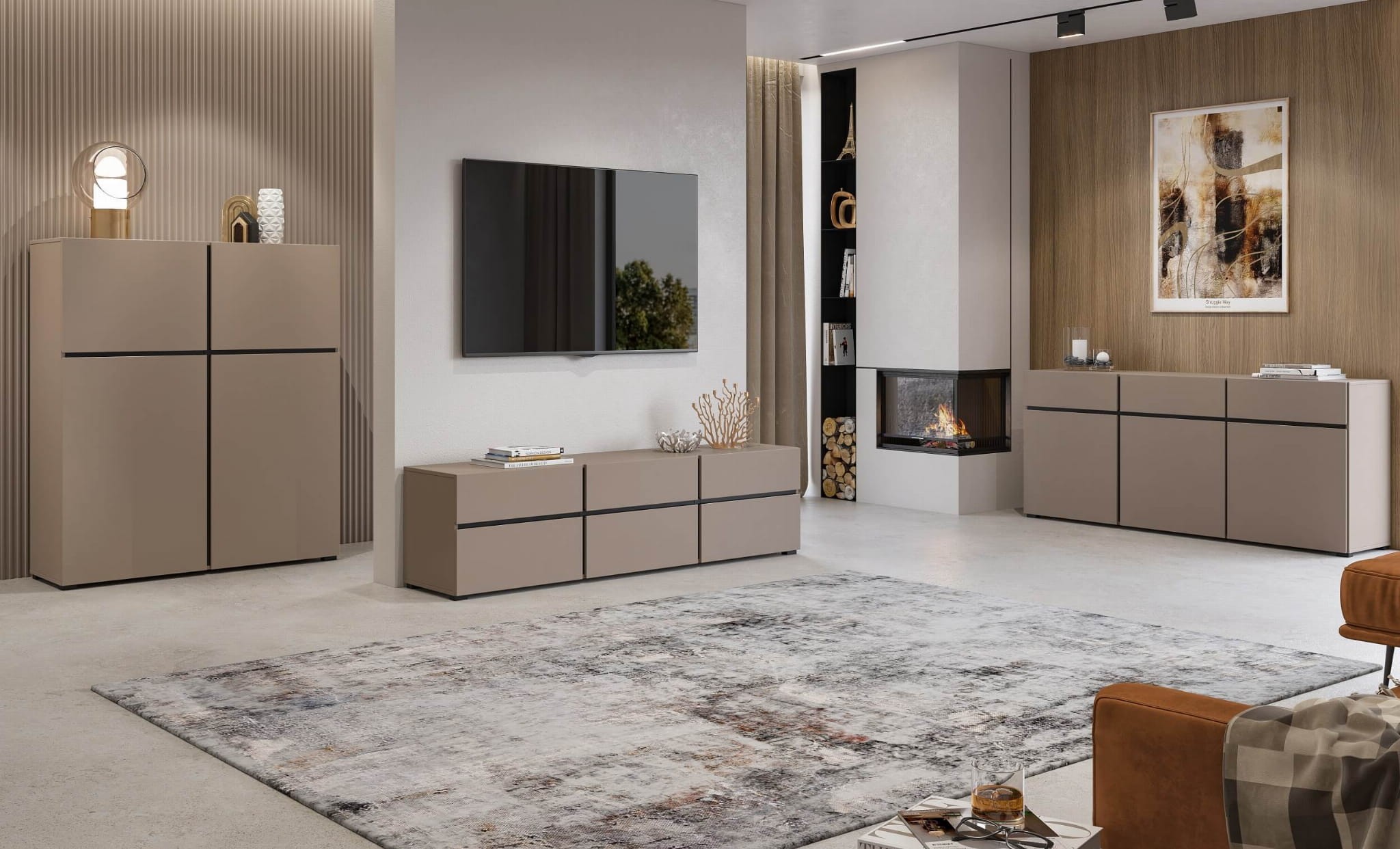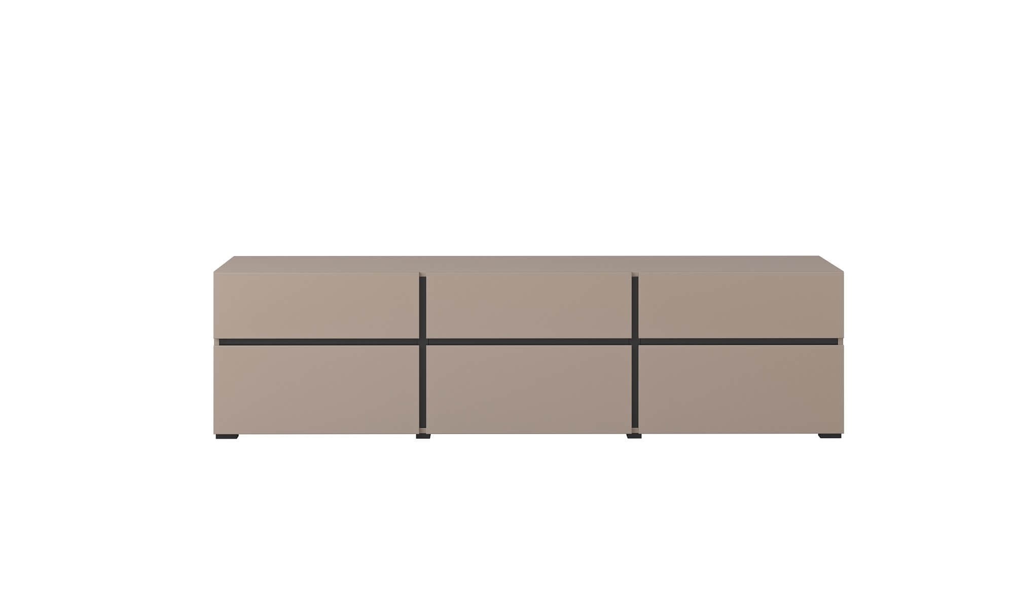 Odkryj elegancję i funkcjonalność kolekcji CROSS. Swoją wyjątkowością zachwyca szafka RTV w beżowo-brązowym odcieniu. Ten unikalny odcień CONGO, czyli beż z nutką brązu sprawia, że wygląda subtelnie i ponadczasowo. Przytulna i ciepła kolorystyka daje nieograniczone możliwości aranżacji wnętrz, jak i pozwala na uzupełnienie wystroju o odważne i mocniejsze akcenty. Utrzymanie porządku dzięki świetnie zaprojektowanej przestrzeni podzielonej na półki zamknięte za klapami i szuflady, będzie naprawdę szybkie i przyjemne – z powodzeniem zmieszczą się w szafce różnorodne przedmioty, od akcesoriów i sprzętów RTV, po ważne dokumenty. Całość dopełniają czarne detale, które sprawiają, że prosta i uniwersalna bryła prezentuje się niezwykle elegancko i szykownie.