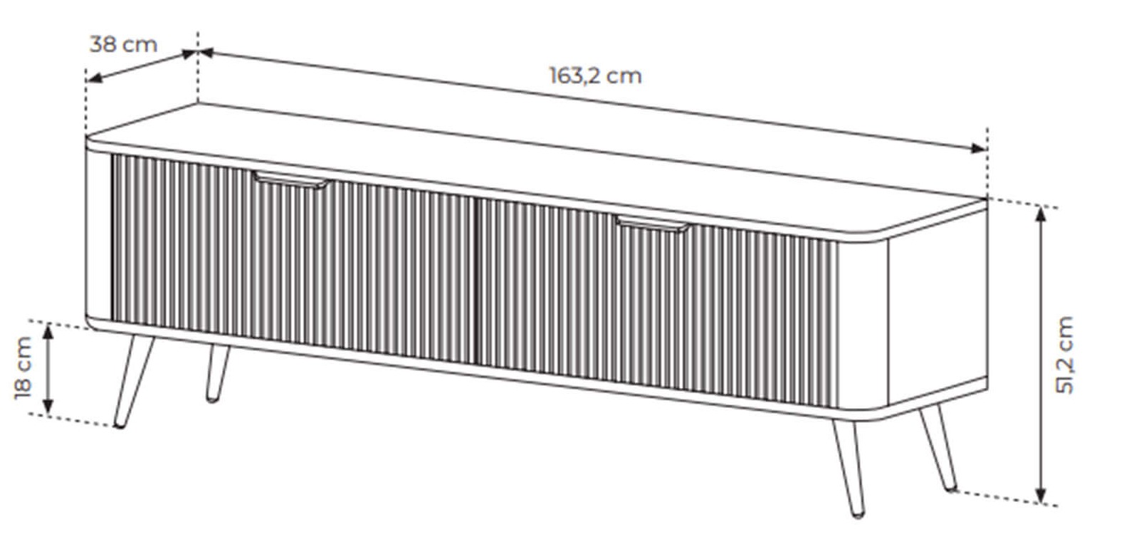 Elegancka czarna szafka RTV 163 2D z kolekcji Lante to połączenie nowoczesnego designu i funkcjonalności, które odmienią każde wnętrze. Matowe fronty z frezowanego MDF-u z dekoracyjną, pionową fakturą nadają bryle eleganckiego charakteru, a dyskretne wpuszczane uchwyty w czarnym wykończeniu podkreślają minimalistyczny styl. Dwa pojemne schowki z cichym domykiem zapewniają wygodne miejsce na sprzęt RTV i akcesoria, jednocześnie ukrywając wszystkie kable i piloty. Solidny korpus z płyty laminowanej odporny na zarysowania i wilgoć gwarantuje, że szafka zachowa swój wyjątkowy wygląd przez długie lata. Smukłe, stożkowe nóżki unoszą bryłę nad podłogę, nadając wnętrzu lekkości, a zaokrąglone krawędzie korpusu dbają o bezpieczeństwo użytkowania. Dzięki przemyślanej, dwustrefowej przestrzeni wewnętrznej można łatwo zorganizować sprzęt multimedialny i dekoracje, tworząc stylową i uporządkowaną strefę wypoczynku. Nowoczesna szafka RTV 163 2D Lante w głębokim czarnym kolorze to dekoracyjny akcent i praktyczne rozwiązanie w jednym – idealne dla miłośników subtelnej elegancji i najwyższej jakości wykonania.