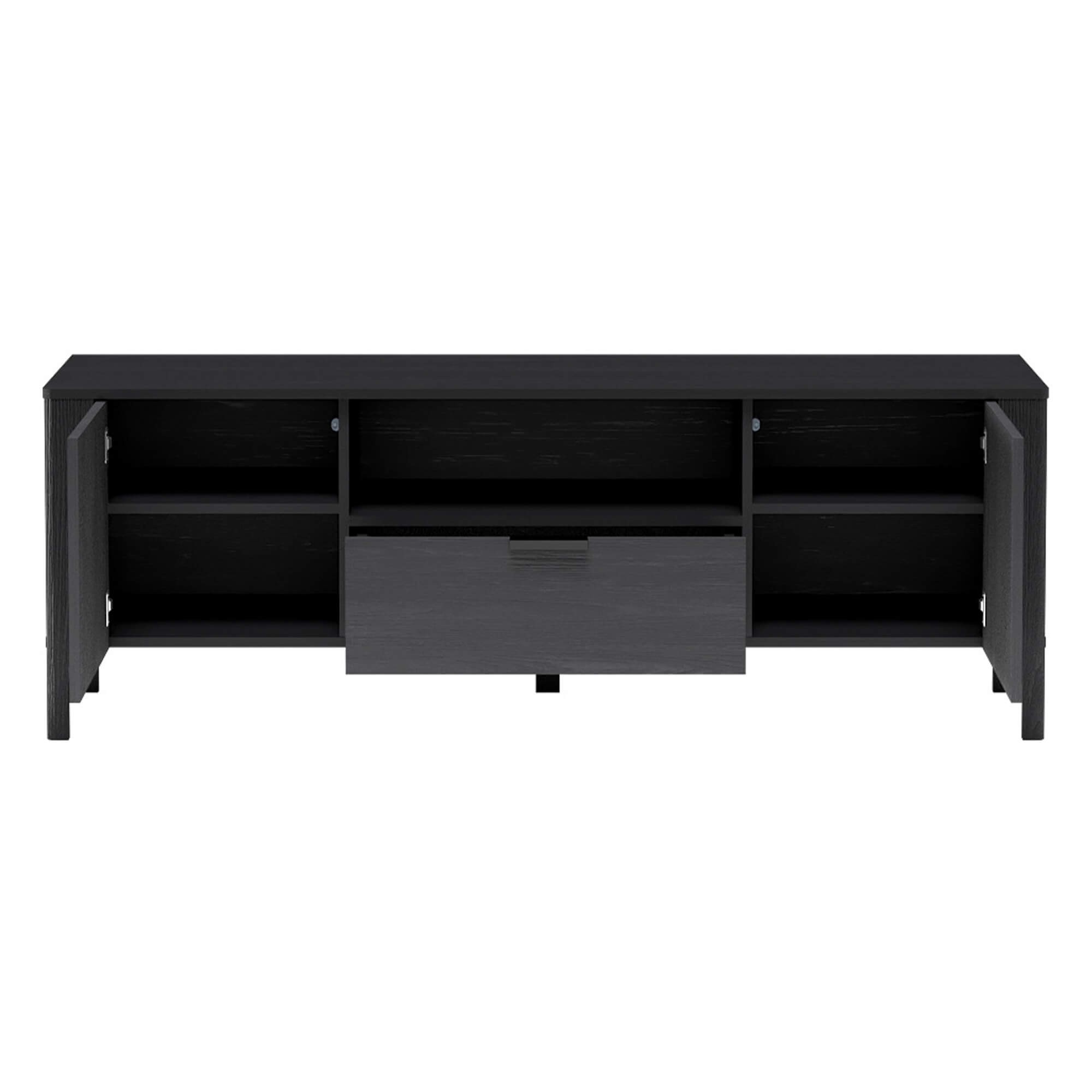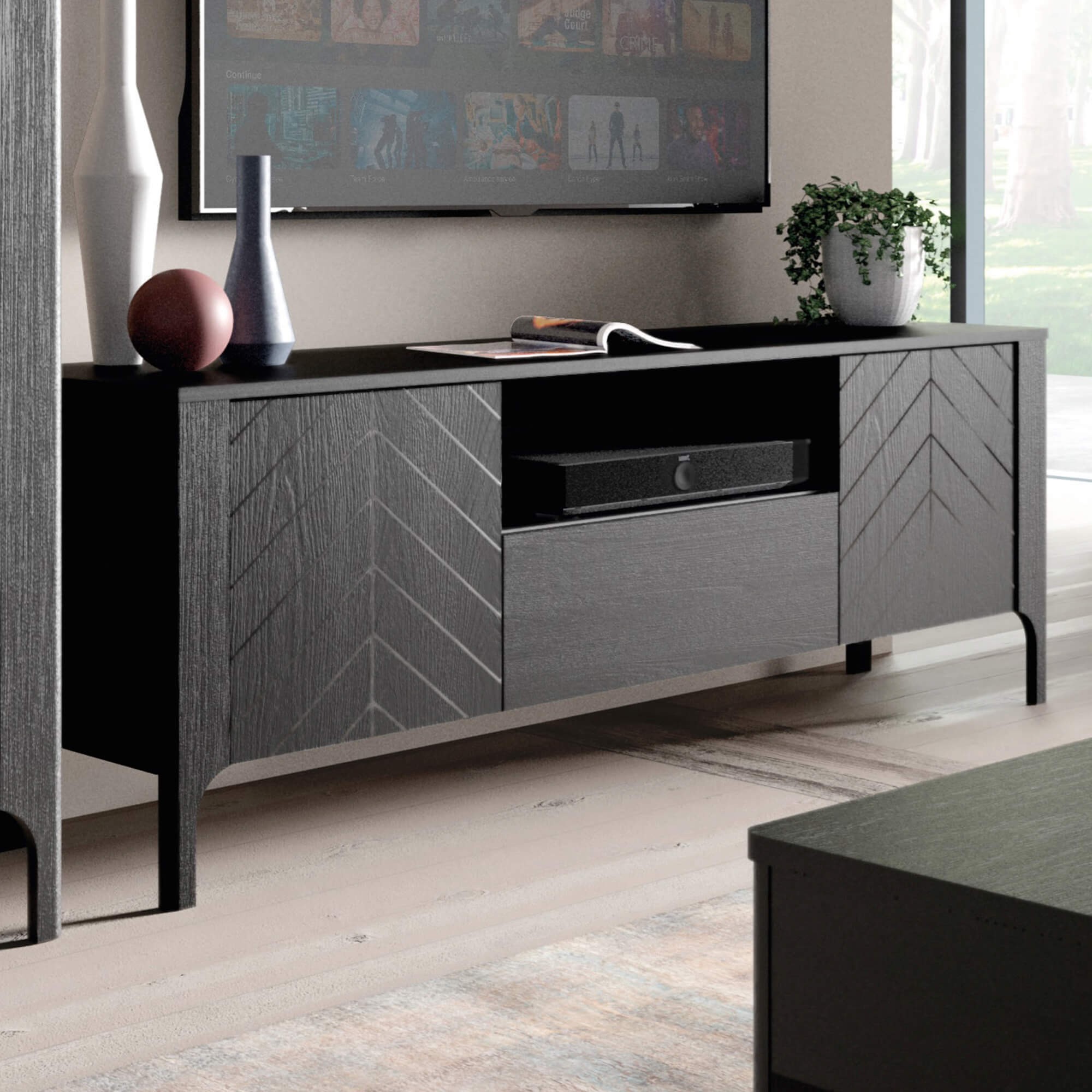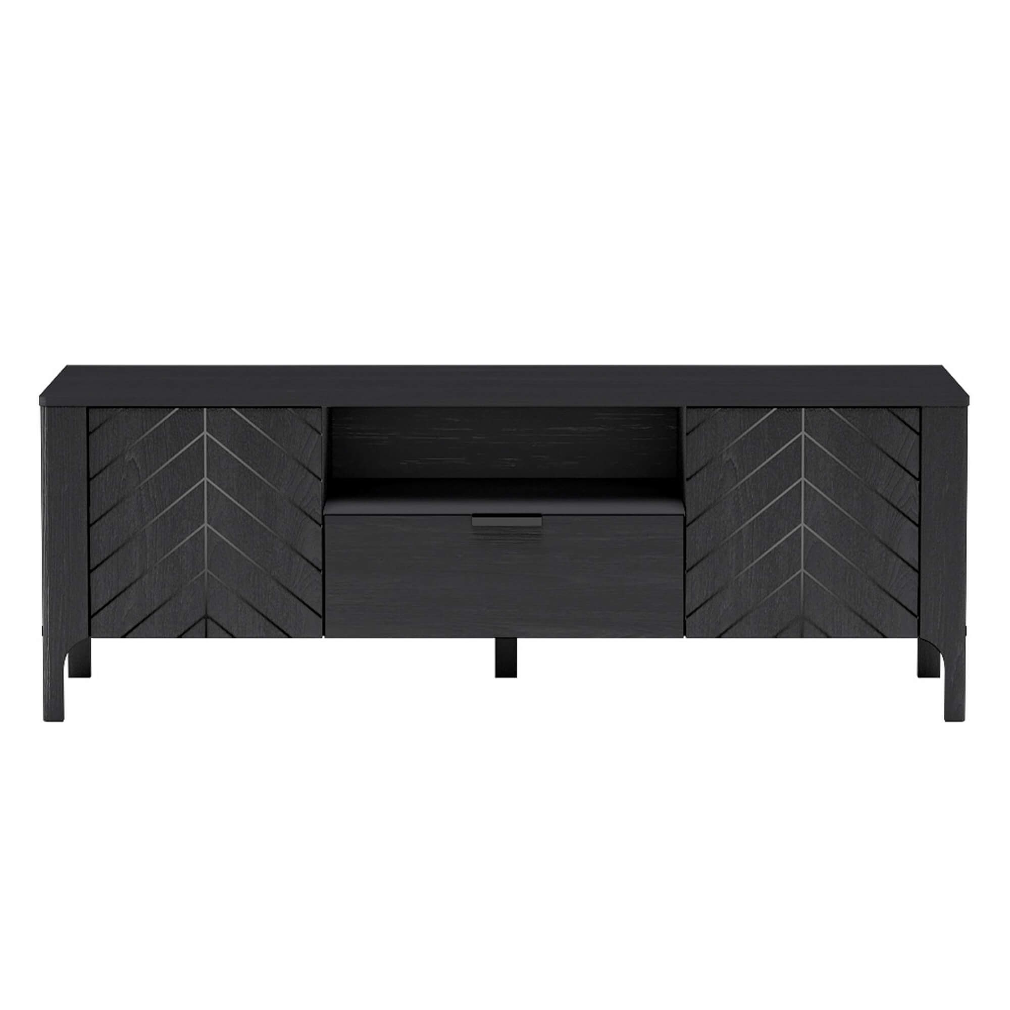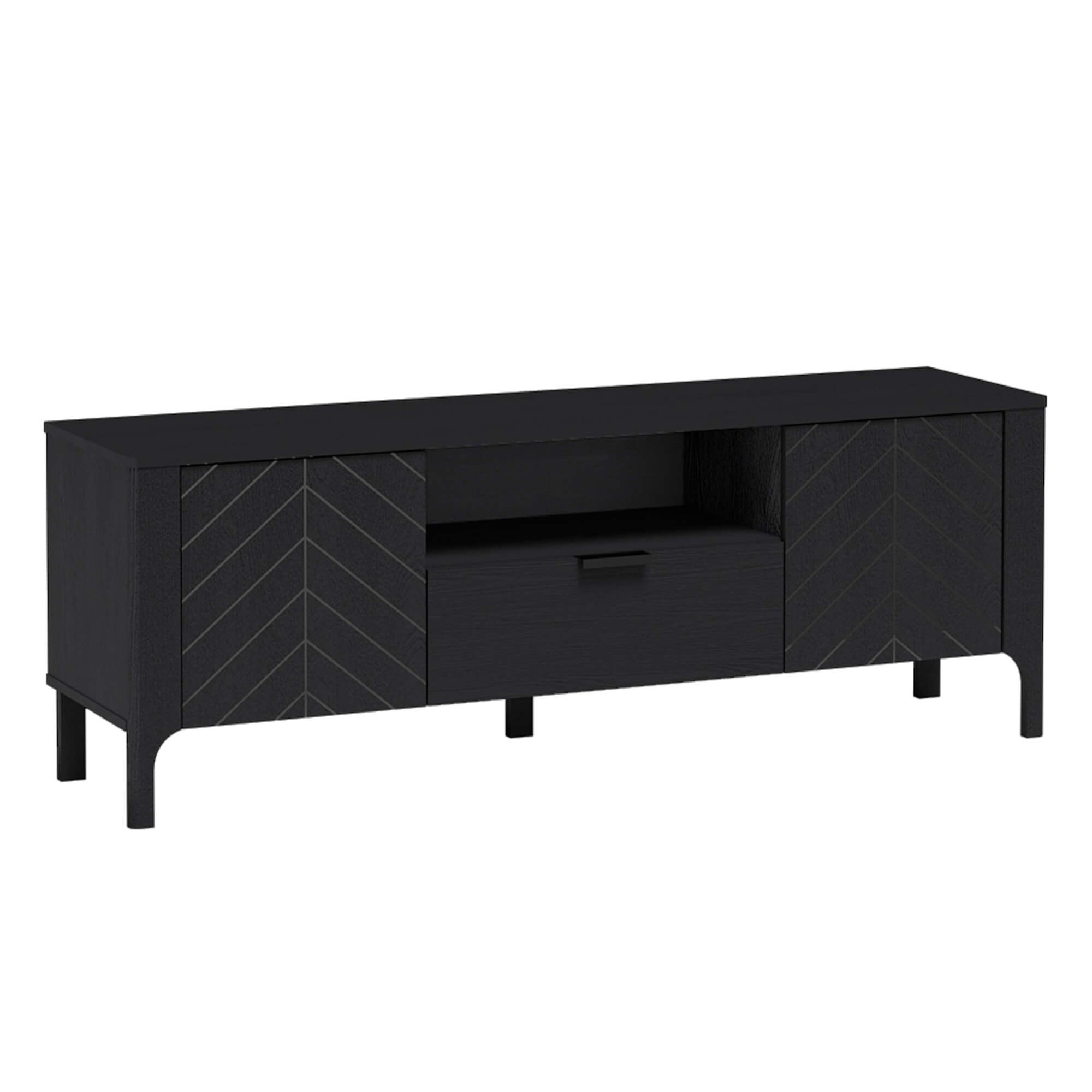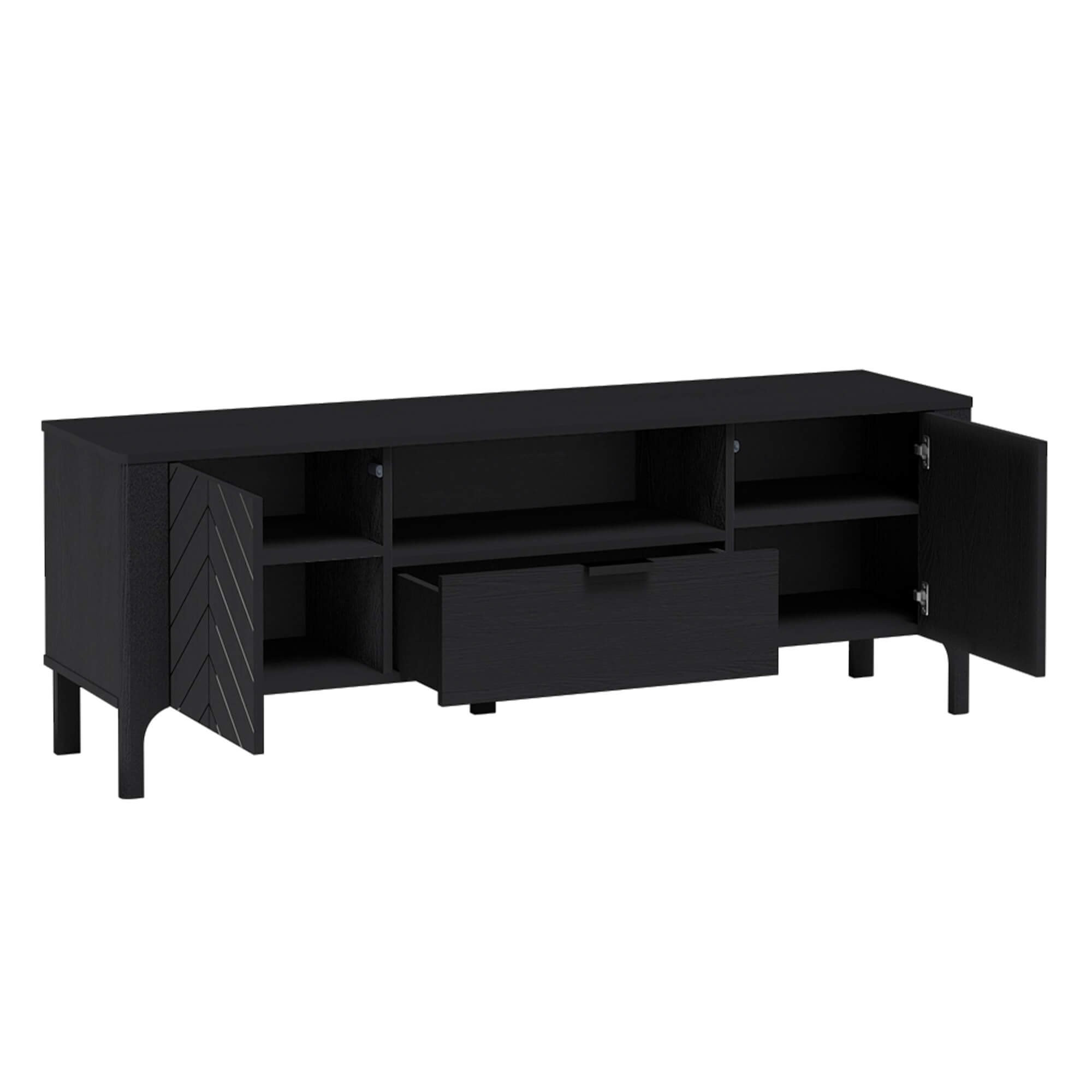 Szafka RTV MM-5 z kolekcji Malumi to propozycja dla tych, którzy szukają w meblach czegoś więcej niż tylko użyteczności. Głęboka czerń korpusu została zestawiona z finezyjnym wzorem jodełki na frontach, co tworzy efekt luksusu i nowoczesnej elegancji.