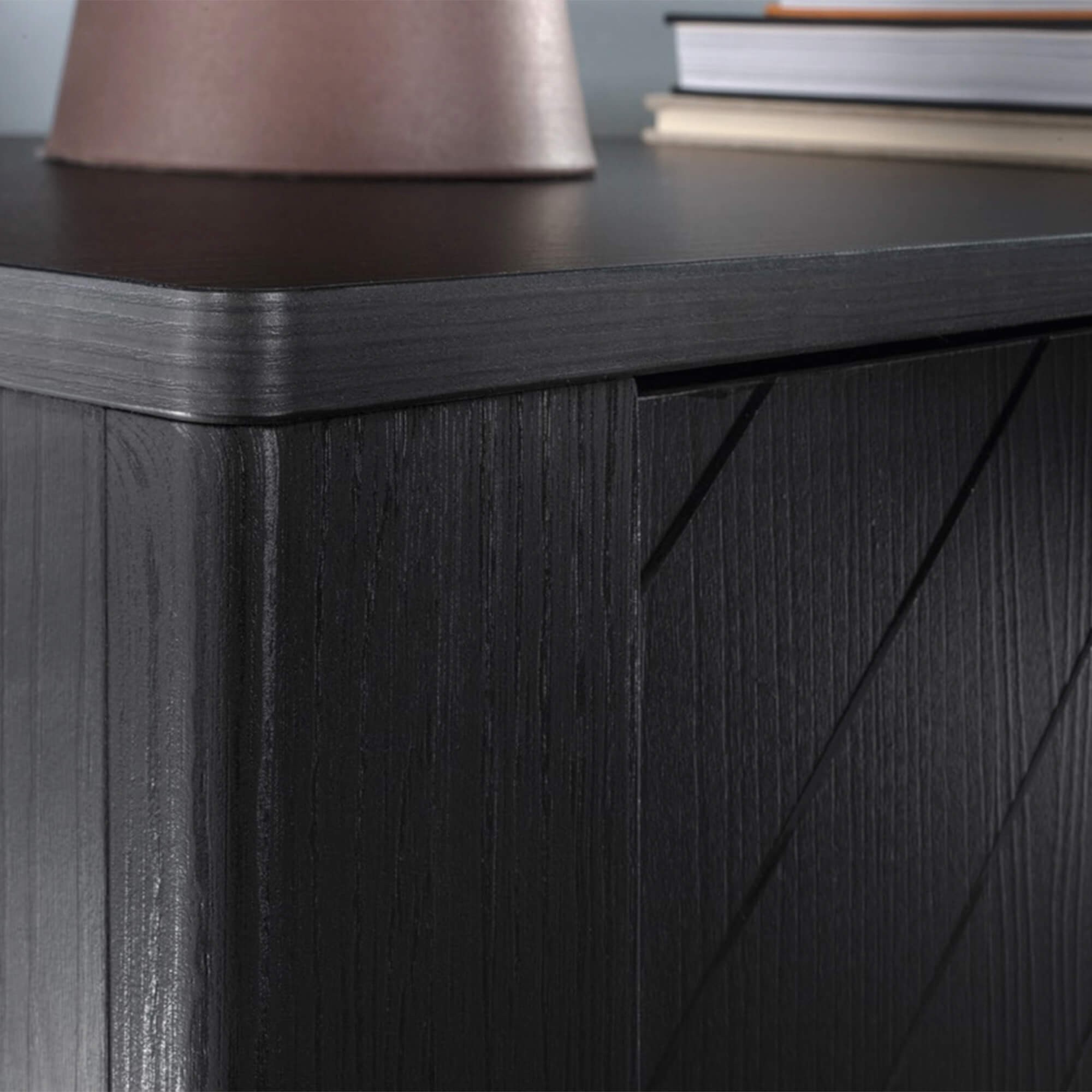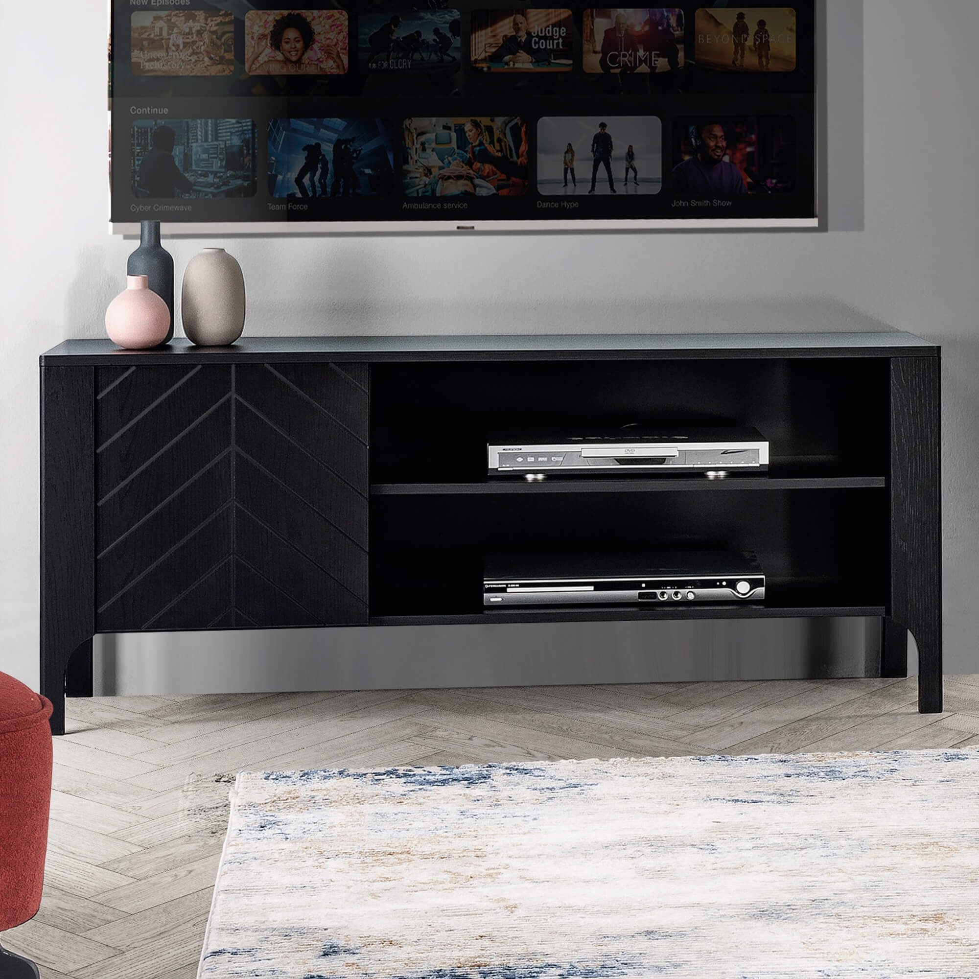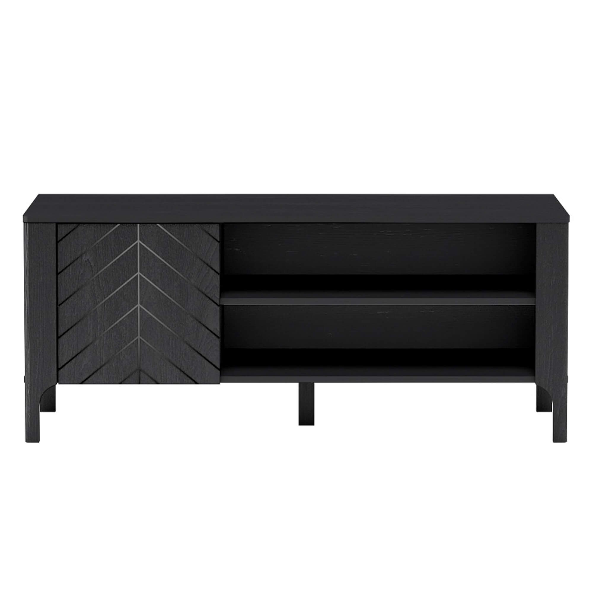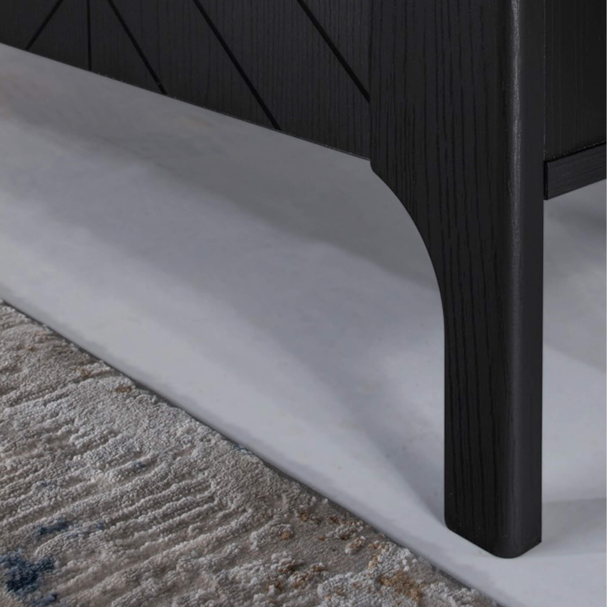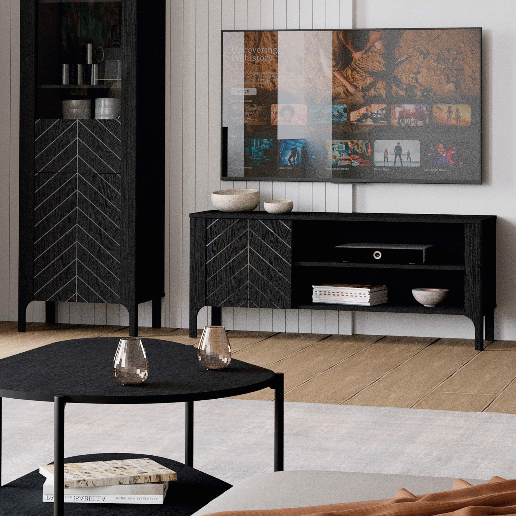 Szafka RTV MM-6 w wersji Black Paintflow to propozycja dla osób, które cenią wyraziste akcenty i nowoczesną elegancję. Głęboka, matowa czerń w połączeniu z subtelnym wzorem jodełki na froncie tworzy unikalny efekt wizualny, który staje się centralnym punktem salonu. To mebel, który idealnie odnajdzie się w aranżacjach typu loft, industrialnych oraz nowoczesnych apartamentach.