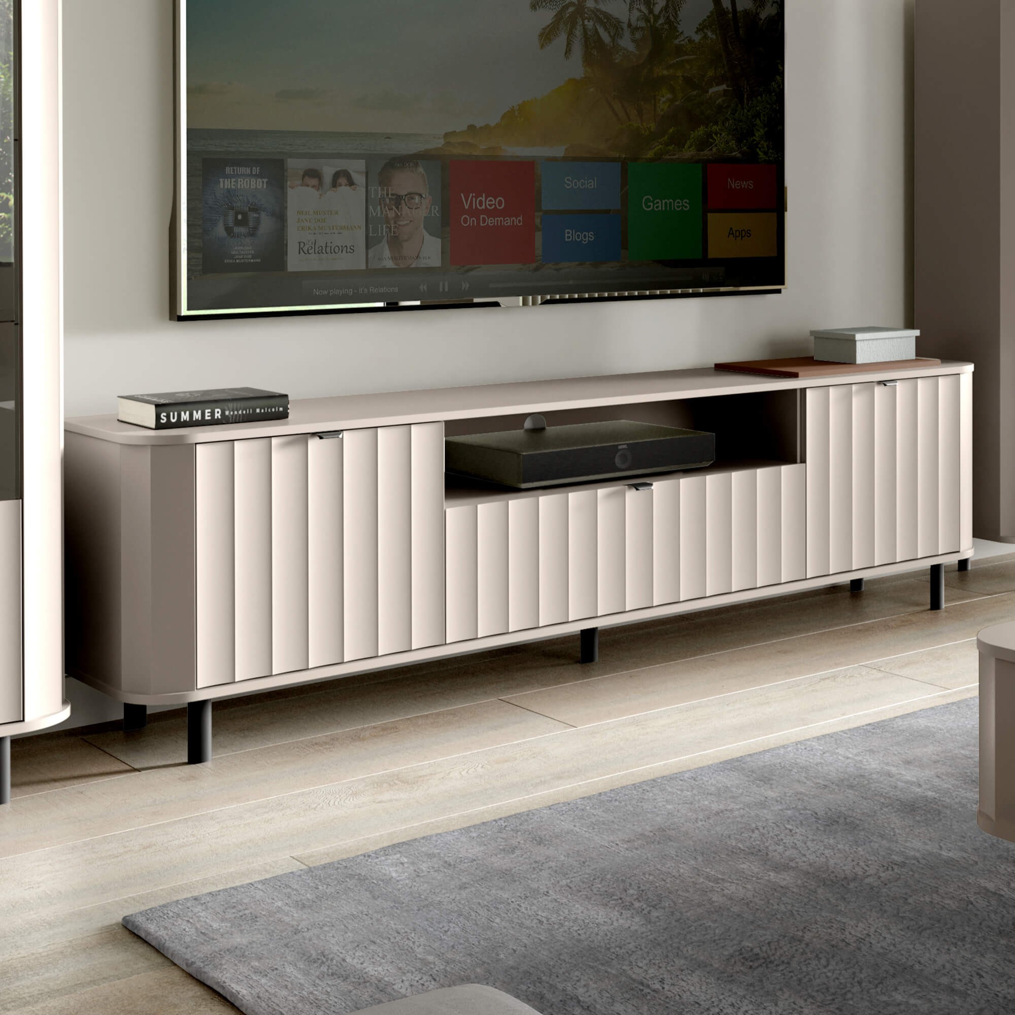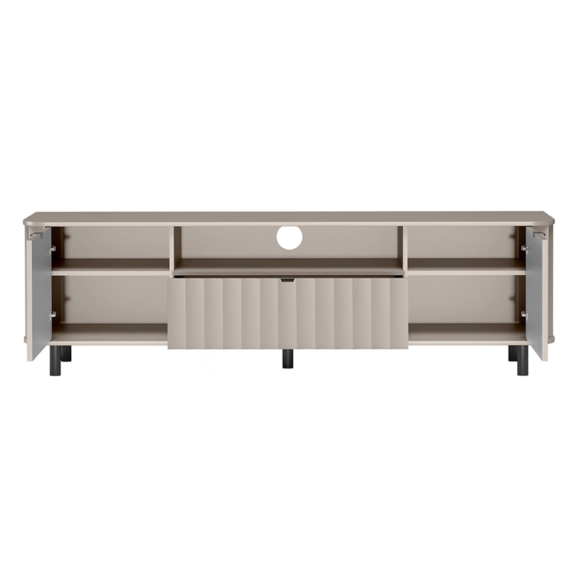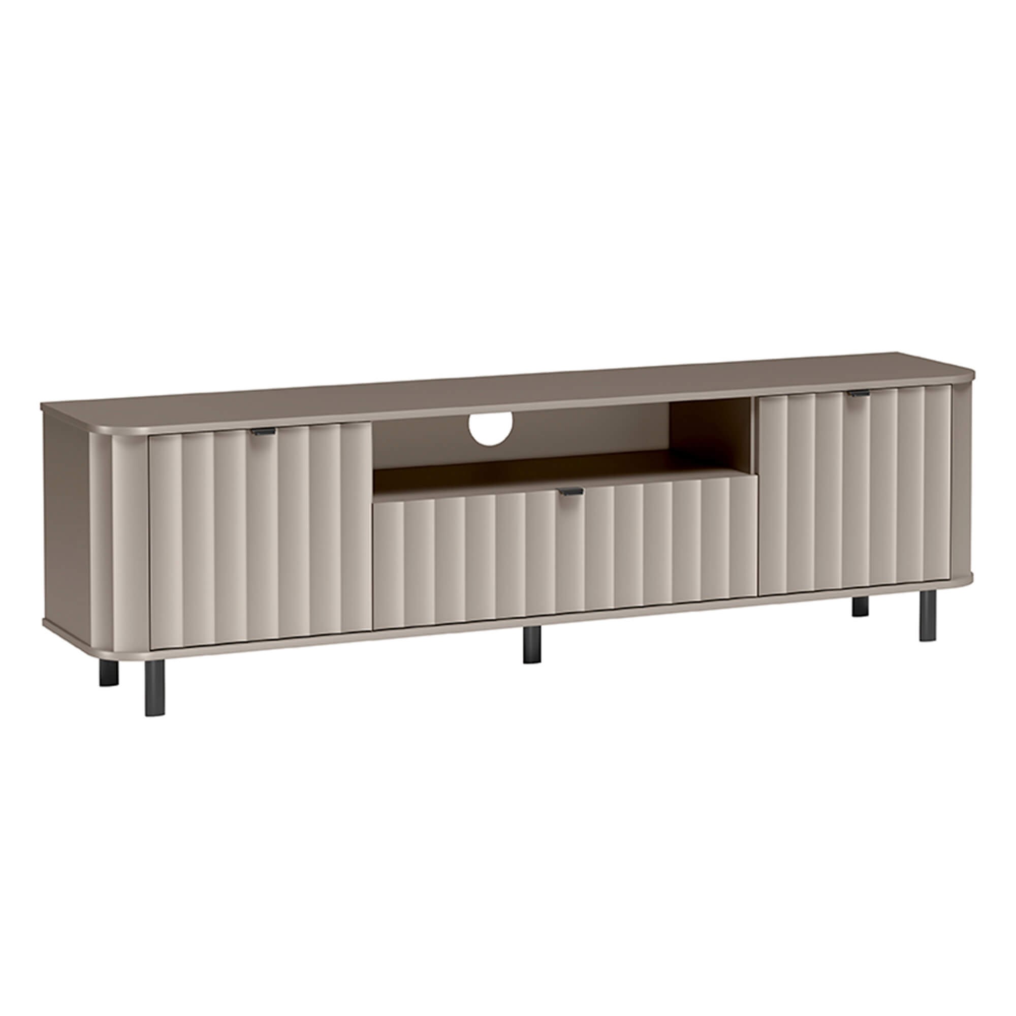 Model NOVADO-5 to mistrzowskie połączenie designu z funkcjonalnością. Szafka oferuje bogate wnętrze: centralnie umieszczoną szufladę oraz dwie zamykane szafki z półkami, które pomieszczą kolekcje gier, filmów czy dodatkowe akcesoria. Charakterystyczne dla tej serii zaokrąglone blaty oraz wysokie, metalowe nogi nadają bryle lekkości, sprawiając, że mimo swoich gabarytów, mebel nie przytłacza pomieszczenia.