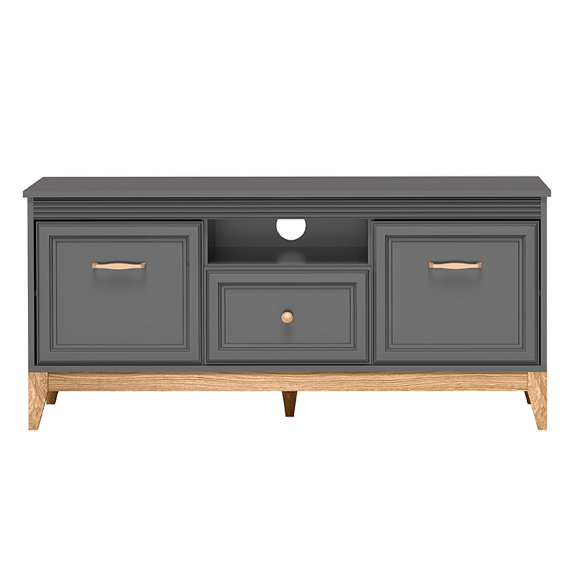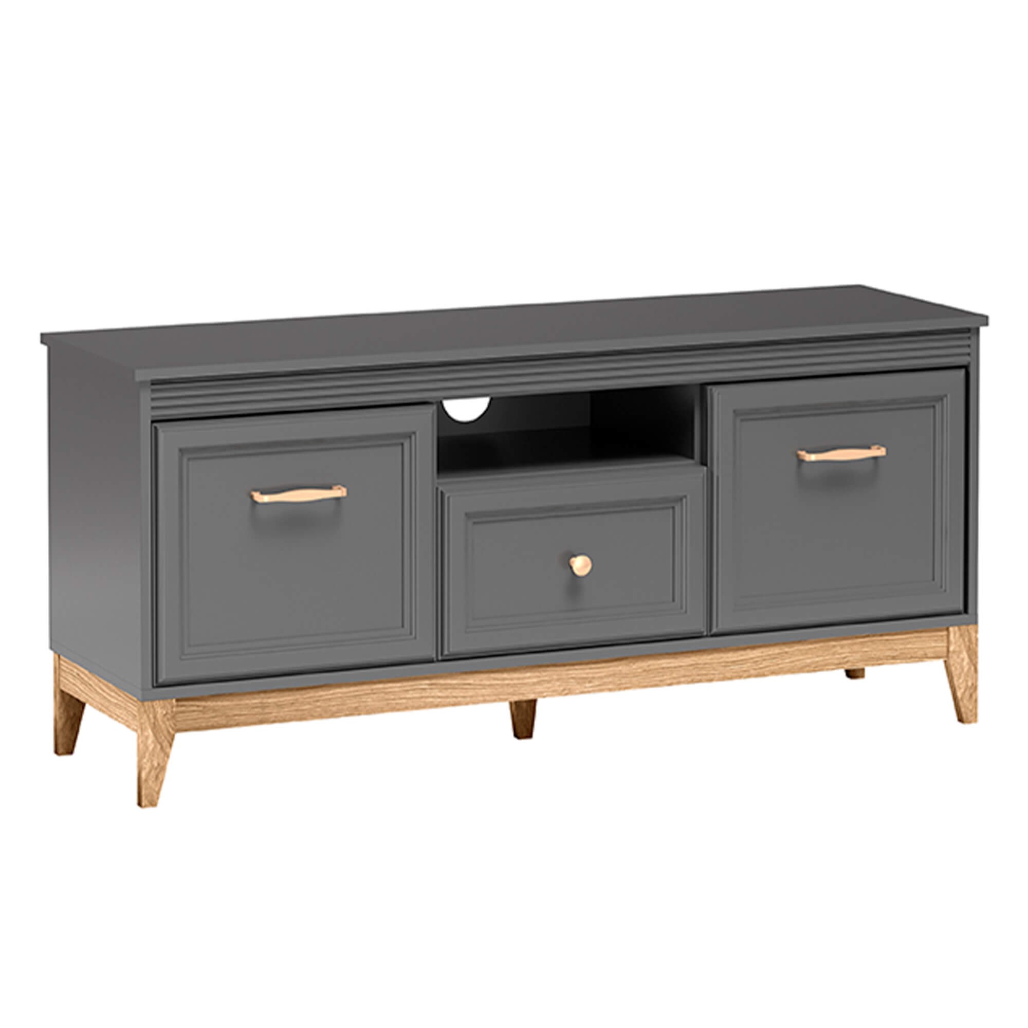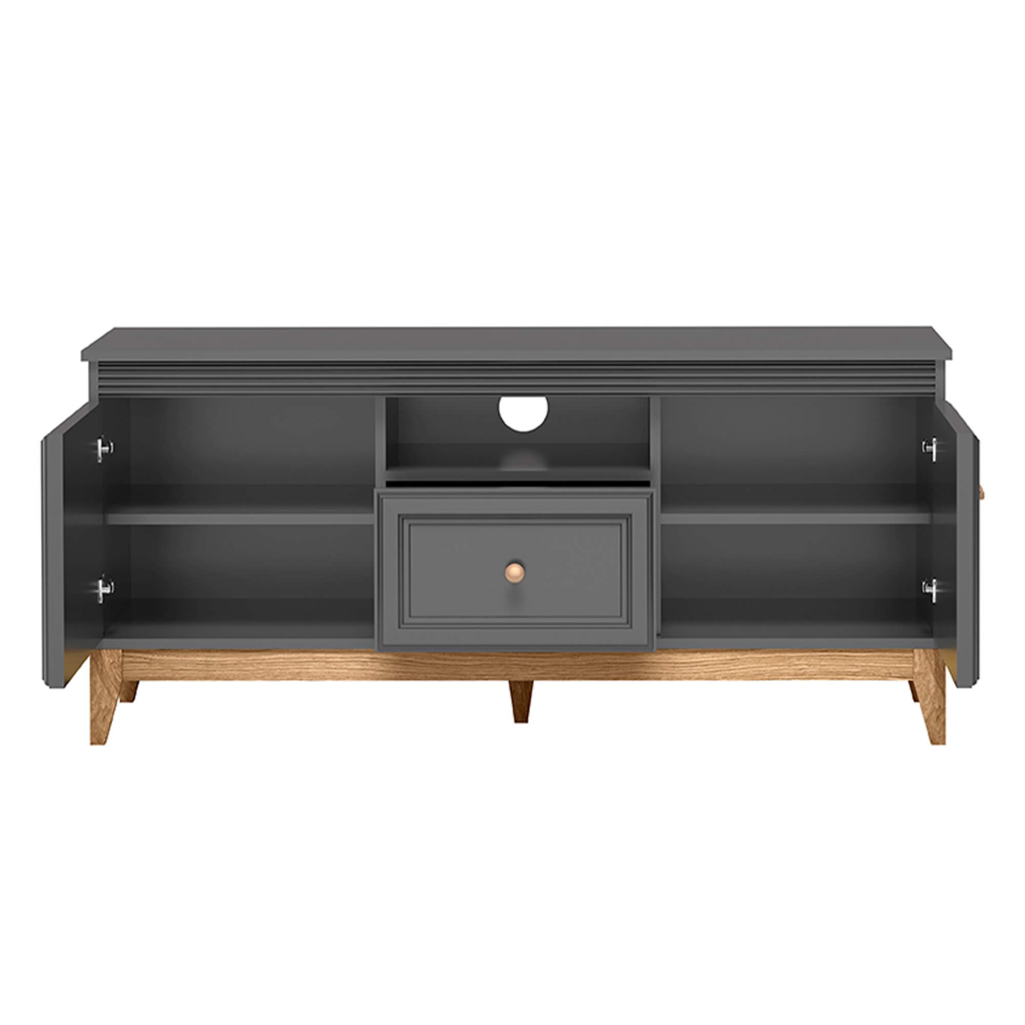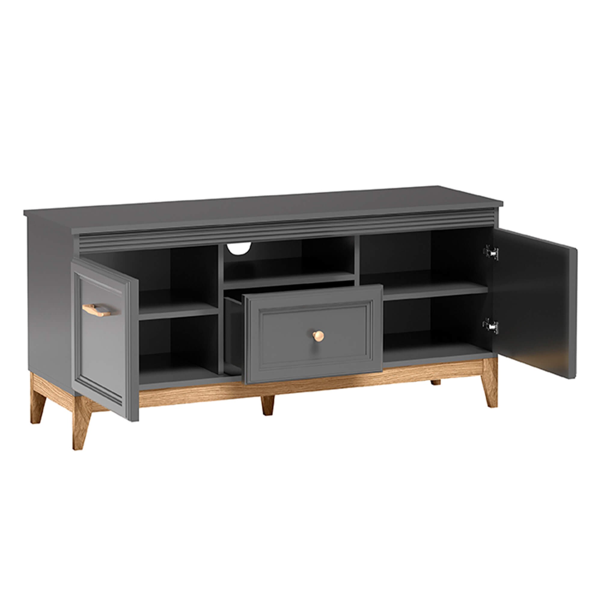 Fronty w kolorze szary diamentowy o matowym wykończeniu idealnie korespondują z nowoczesną elektroniką, eliminując nieestetyczne odbicia światła od ekranu. To mebel, który przyciąga wzrok detalami – od ozdobnej listwy, po harmonijne połączenie chłodnej szarości z ciepłem dębowych nóg.
