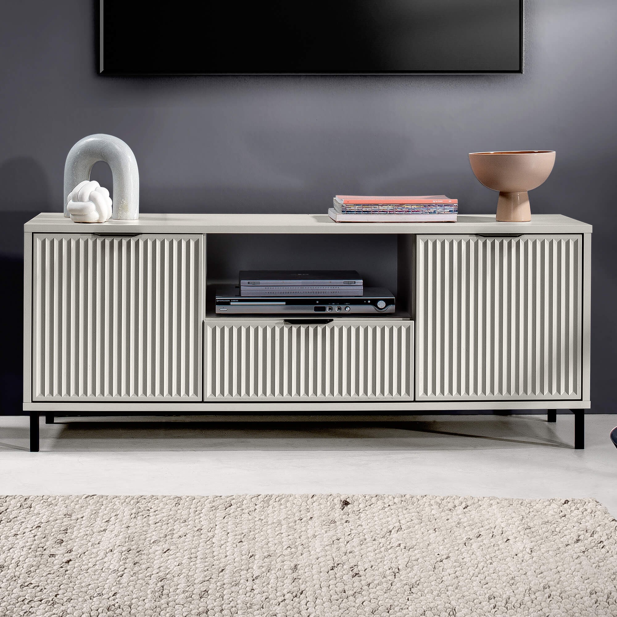 Nowoczesna i niezwykle elegancka szafka pod telewizor 135 cm z modnym ryflowaniem na froncie – hit tego roku! To mebel, który pozwoli zachować porządek w kąciku telewizyjnym, a przy tym wprowadzi do domu styl i wygodę. W swoim wnętrzu skrywa pakowne szafeczki z drzwiczkami, pojemną wnękę i szuflady z cichym domykiem. Funkcjonalności dodaje także inteligentny system pust to open oraz wysoka konstrukcja dzięki nóżkom, które usprawniają sprzątanie pod meblem i zachowanie porządku. Stabilna konstrukcja, solidność i staranne wykonane z płyt laminowanych i obrzeż ABS sprawią, że posłuży przez wiele lat. Ciepły i przyjemny odcień kaszmiru sprawia, że szafka RTV doskonale zaprezentuje się we współczesnych aranżacjach. Charakter podkreśla czarny metalowy uchwyt i smukłe nóżki.