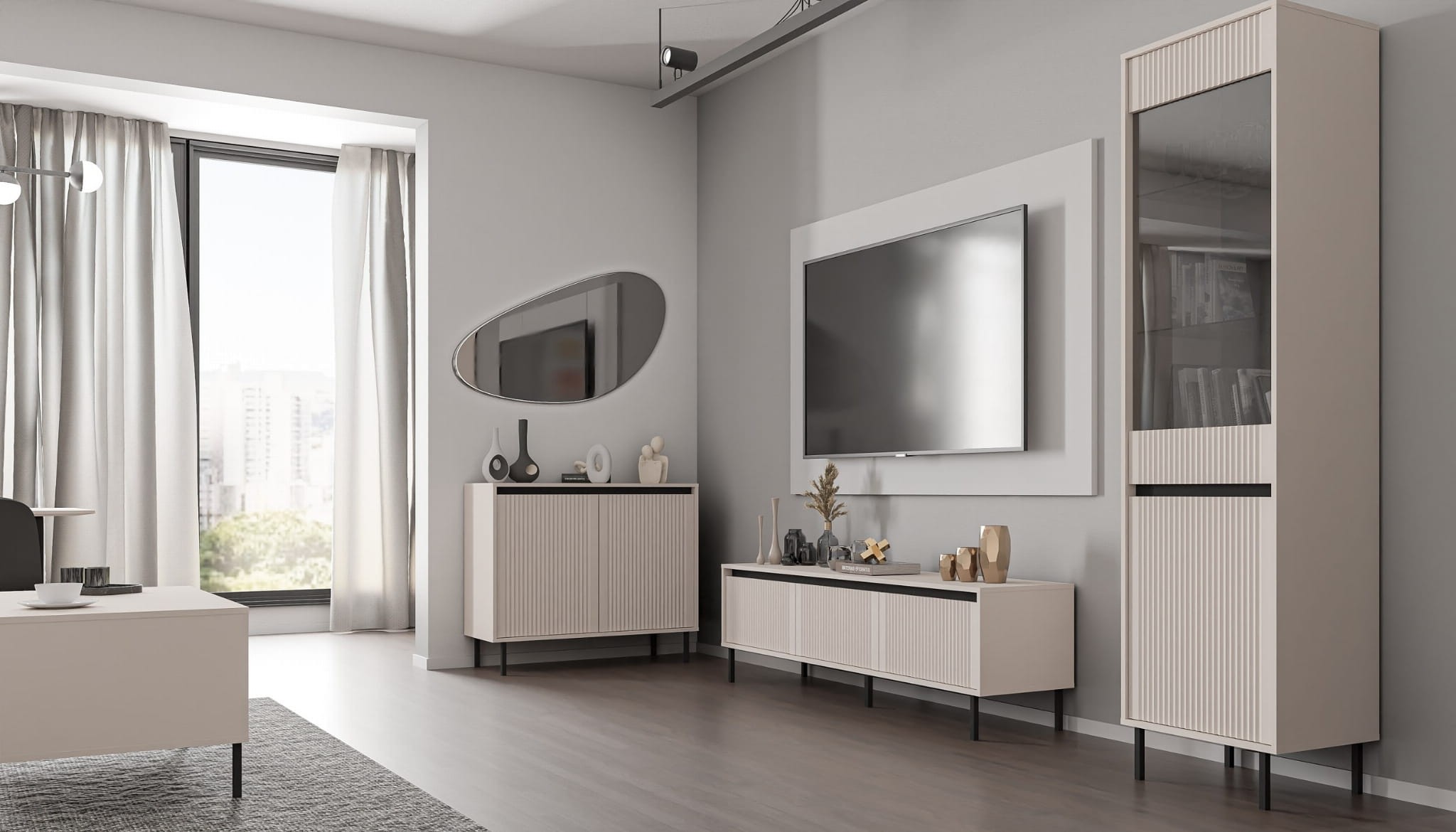 Szafka RTV ryflowana beżowa z 3 szufladami - poznaj kolekcję OSAKA