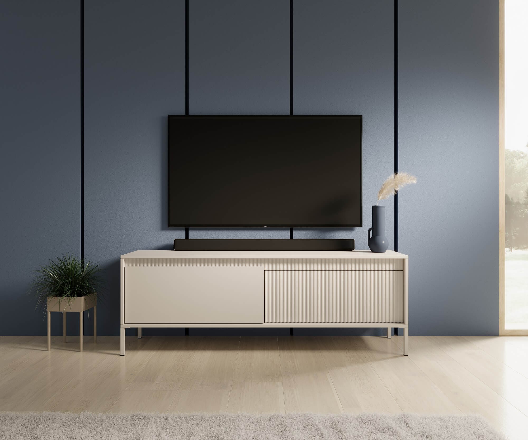 Beżowa szafka RTV ryflowana SENSO 153cm 2D (D) – kącik telewizyjny w nowoczesnym stylu