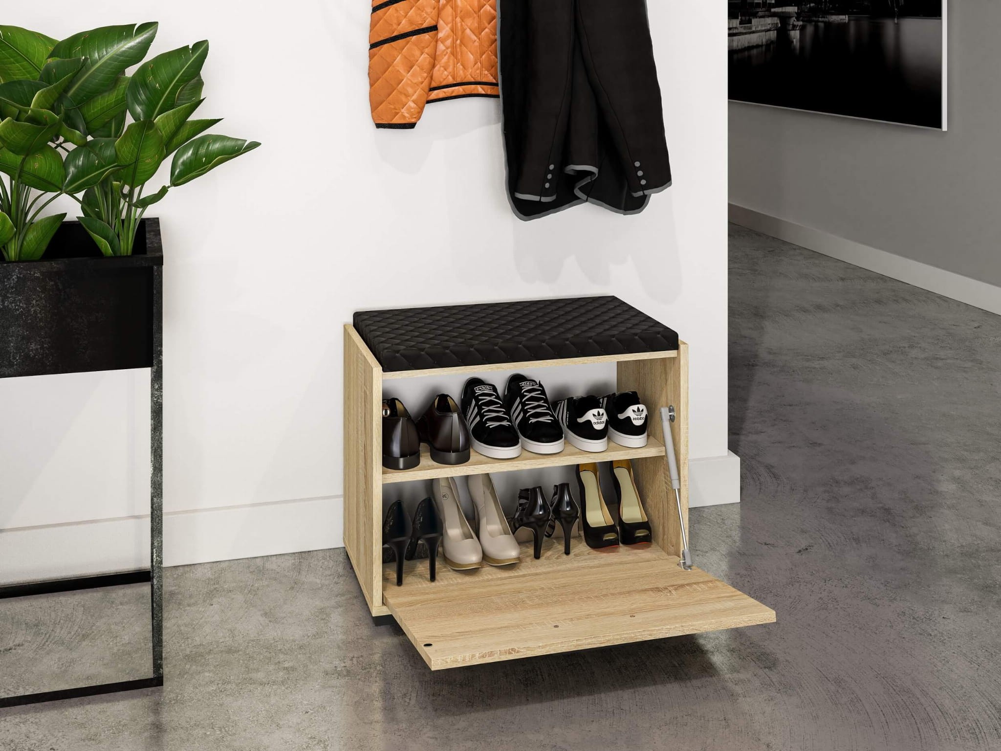 Szafka na buty z siedziskiem CARO 01 | Sonoma jasna + czarna ekoskóra