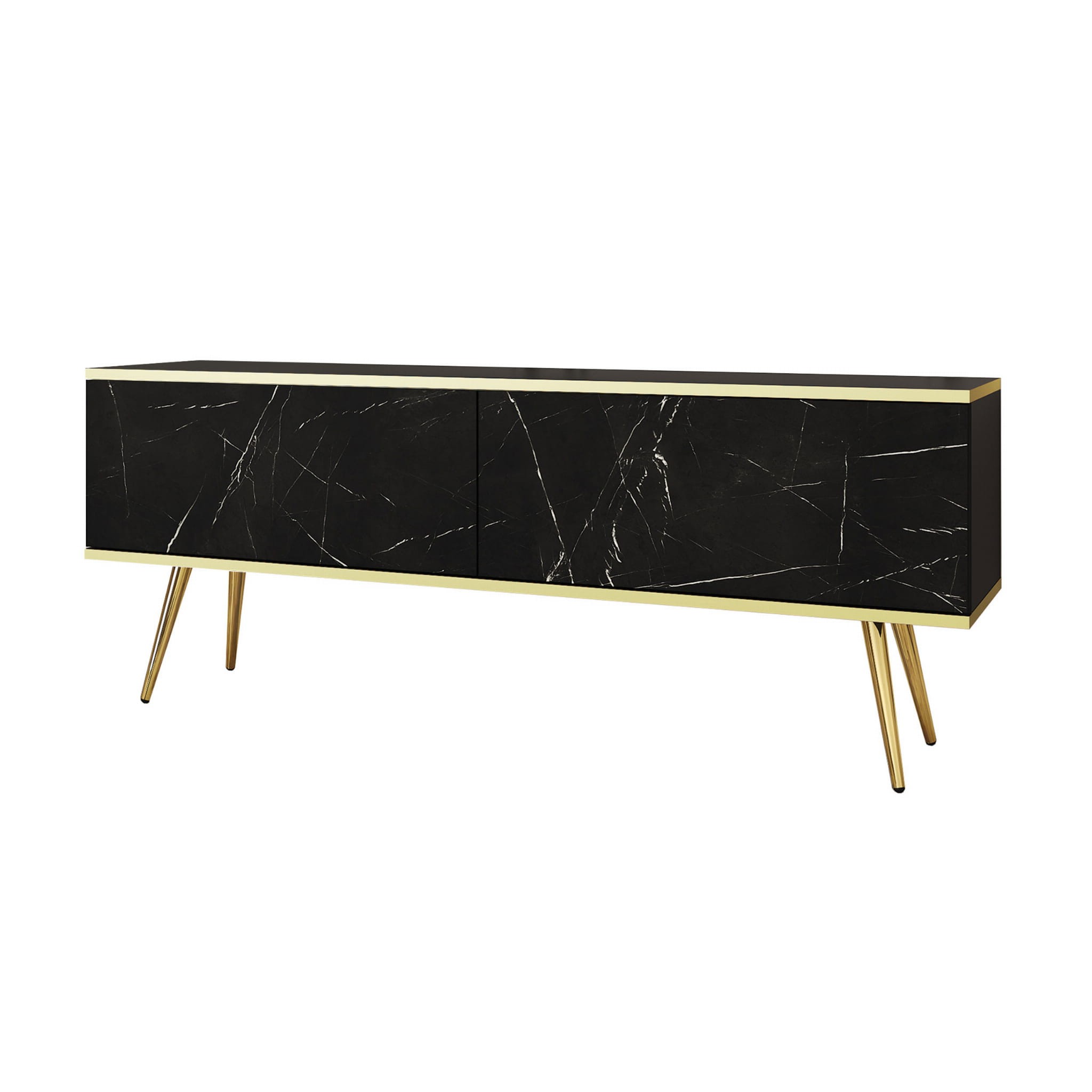 Elegancka, marmurowa szafka RTV na wysokich nóżkach. Kolekcja ORO to połączenie ponadczasowych elementów – zgrabnej konstrukcji, gładkiego frontu, czarnego wybarwienia i złotych detali, które sprawiają, że tworzy niesamowity efekt. Szafka zapewnia optymalną przestrzeń do przechowywania sprzętów RTV, a blat 135 cm jest idealny, by wyeksponować ulubione dekoracje. Gładki front z pięknym wzorem, lecz bez uchwytów to sposób na zachowanie minimalistycznego designu. Wysokie nóżki ułatwiają zachowanie porządku pod meblem, dbają o lekki wygląd wnętrza i zgrabność konstrukcji. Dodatkowo dostępne są w dwóch wybarwieniach – czarnym lub złotym, dzięki czemu możesz nadać jej indywidualny charakter!