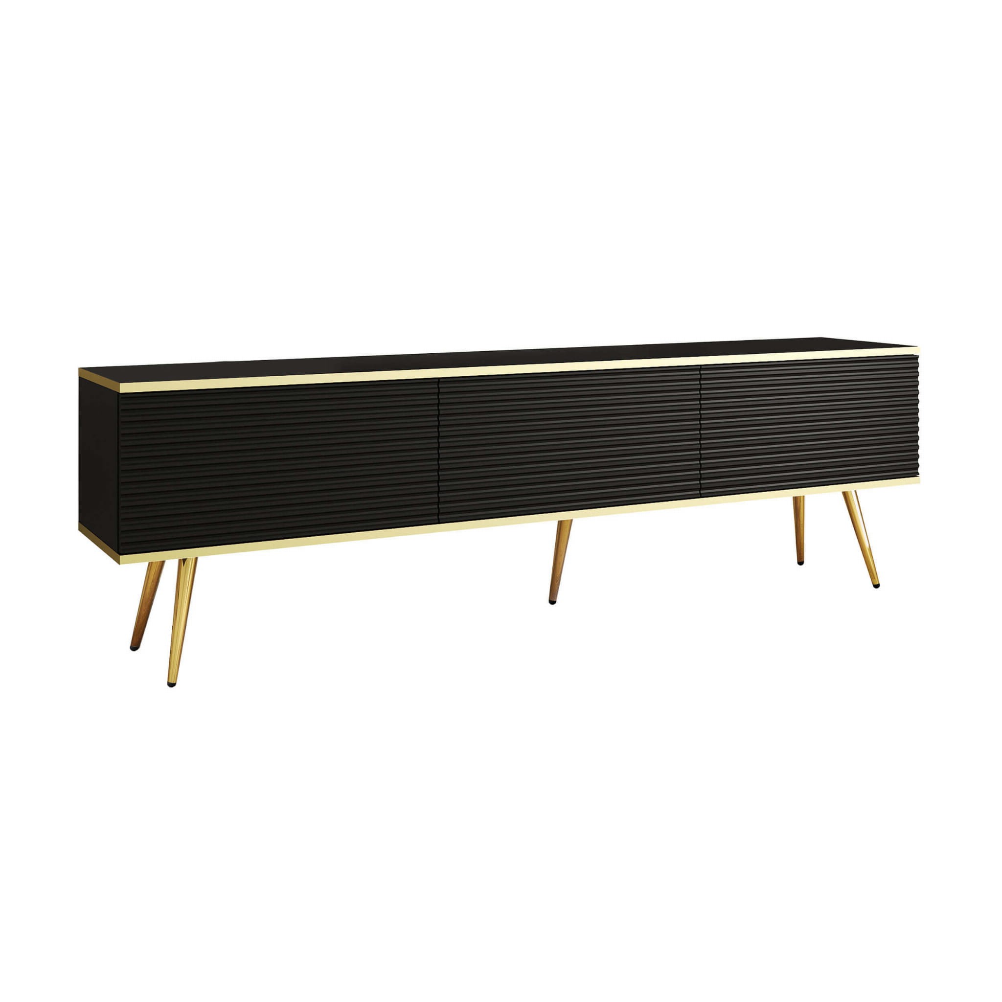 Nowoczesna szafka RTV na wysokich nóżkach z pięknymi ryflami na froncie! ORO to połączenie największych hitów wnętrzarskich – frezowania, głębokiego czarnego wybarwienia, które wpasuje się w każdy wystrój, a do tego pełnych blasku złotych detali Glamour! Całość tworzy niesamowity efekt, a ozdobne frezowanie to sposób na nowoczesny efekt 3D. Trzy komory do przechowywania to wystarczające miejsce na sprzęty i gadżety, a blat o długości 175 cm pomieści ulubione dekoracje, pamiątki, zdjęcia, jak i nowoczesną konsolę czy dekoder. Wysokie nóżki ułatwiają zachowanie porządku pod meblem, dbają o lekki wygląd wnętrza i zgrabność konstrukcji. Dostępne są w dwóch kolorach – czarnym lub złotymi, dzięki czemu możesz wybrać jej styl.