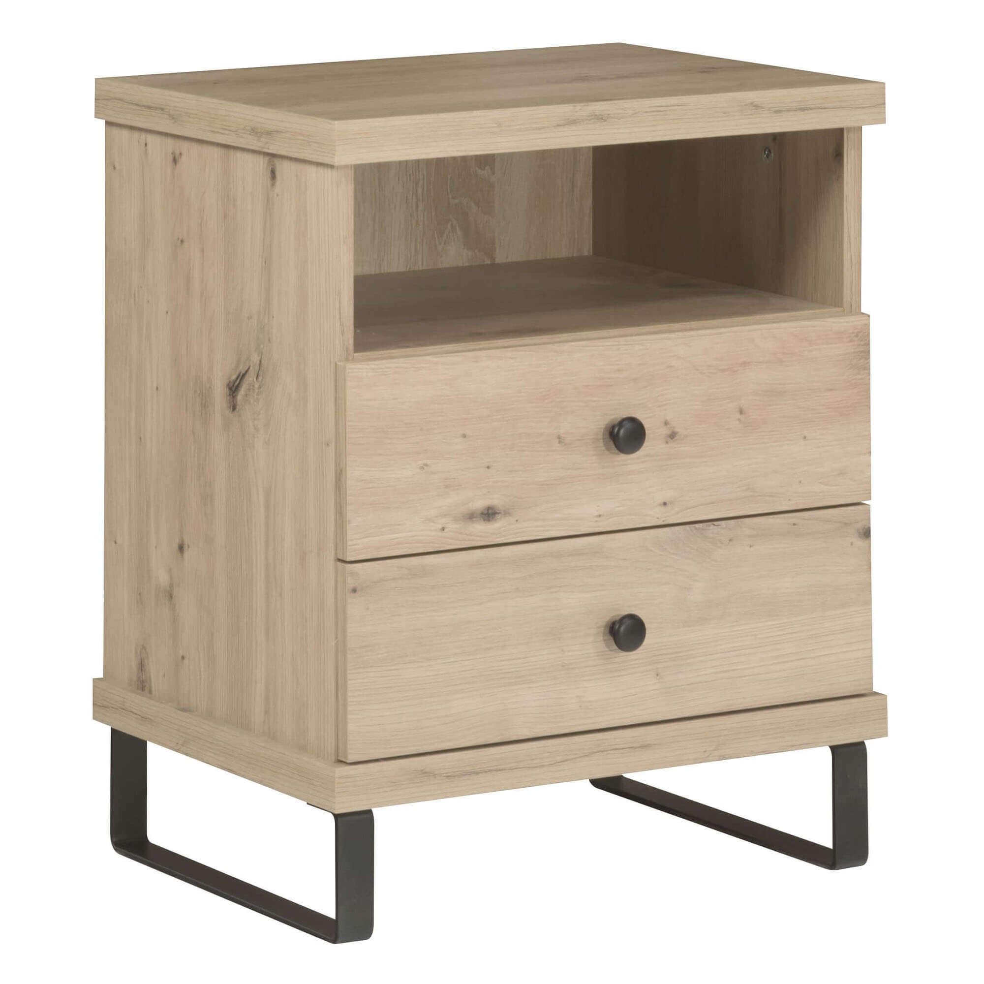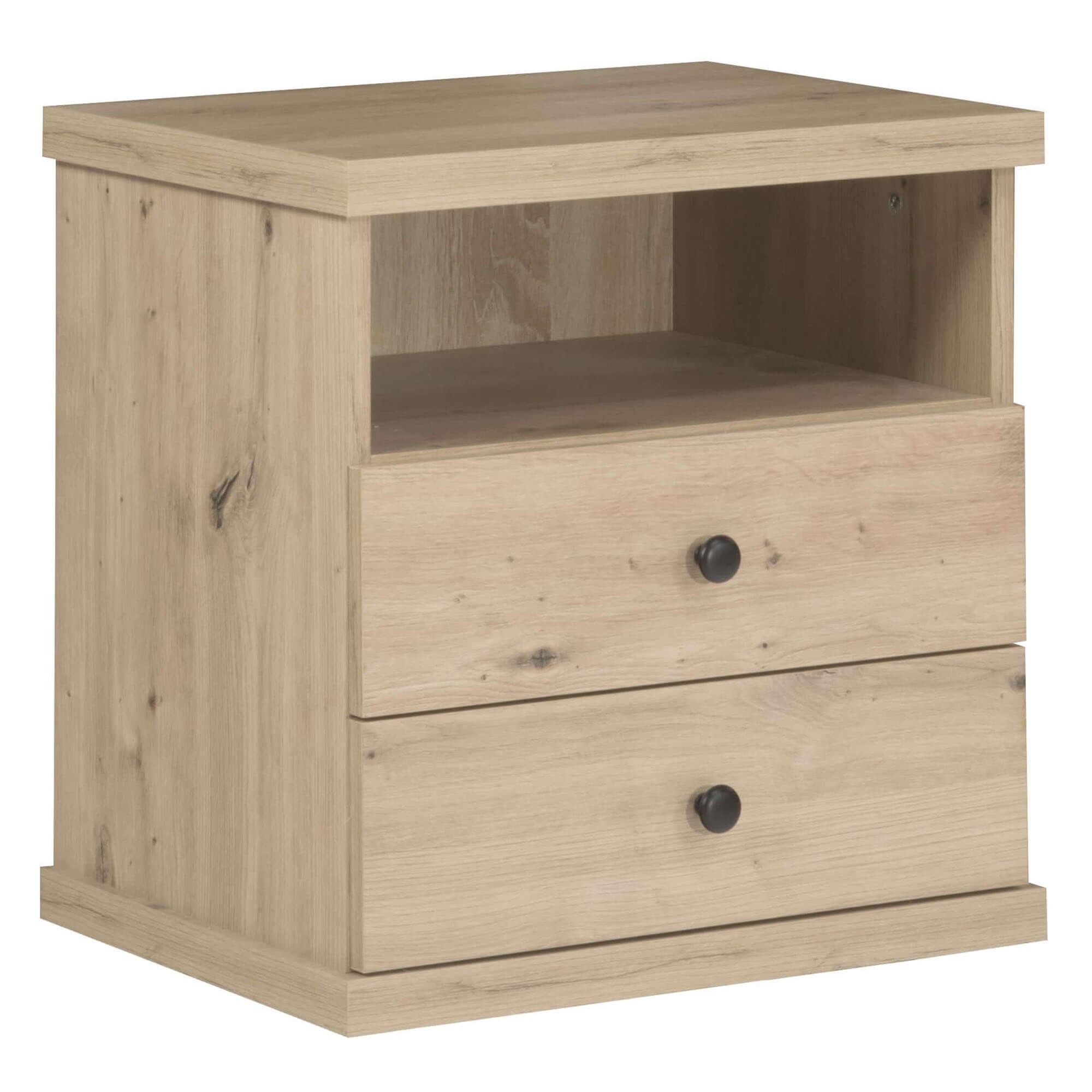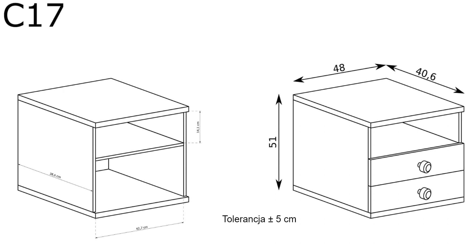 Szafka nocna CALI C-17 w kolorze ARTISAN to elegancki i funkcjonalny element wyposażenia każdej sypialni. Wykonana z trwałej, laminowanej płyty meblowej, zapewnia wysoką odporność na codzienne użytkowanie, a wykończenie obrzeży okleiną ABS gwarantuje dodatkową ochronę przed uszkodzeniami mechanicznymi, co przekłada się na długowieczność mebla. Szafka posiada dwie pojemne szuflady, które pomagają utrzymać porządek, idealnie nadając się do przechowywania drobnych przedmiotów. Czarne, okrągłe uchwyty na frontach szuflad podkreślają nowoczesny charakter szafki, nadając jej stylowy wygląd. Nad szufladami znajduje się otwarta półka, która doskonale sprawdzi się do przechowywania książek, telefonu lub innych przedmiotów, które chcesz mieć zawsze pod ręką. Tył szafki wykonany jest z płyty HDF, co dodatkowo wzmacnia konstrukcję i zapewnia stabilność mebla. Szafka nocna CALI C-17 doskonale wpisuje się w nowoczesne i skandynawskie aranżacje wnętrz, dodając im ciepła i naturalności dzięki unikalnej kolorystyce ARTISAN. To połączenie funkcjonalności i estetyki, które świetnie uzupełni każdą sypialnię, wprowadzając do niej elegancję i harmonię.