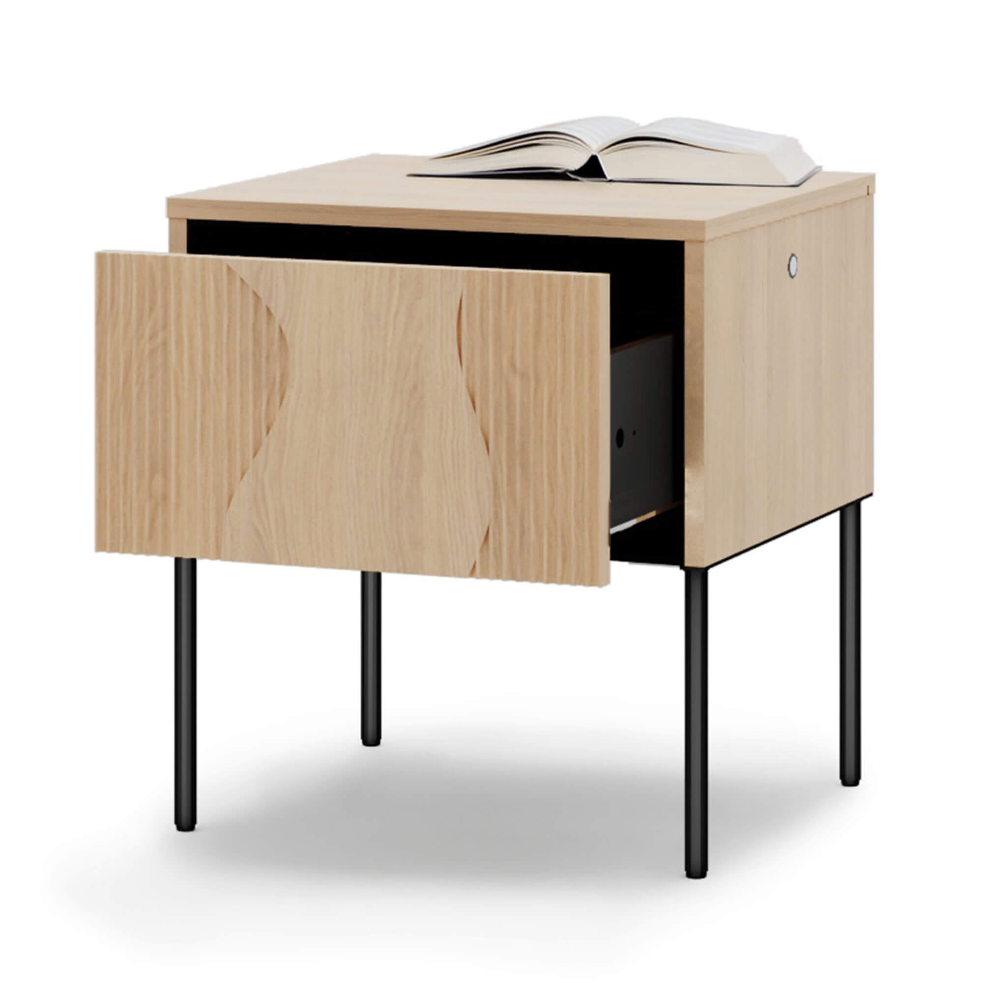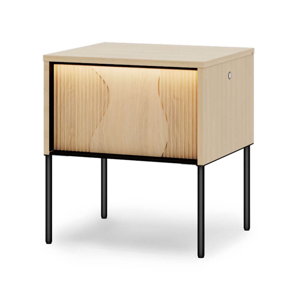 Dzięki kompaktowym wymiarom szafka zmieści się nawet w mniejszej sypialni, a jednocześnie zapewni wygodną przestrzeń do przechowywania najpotrzebniejszych rzeczy. Oświetlenie wraz z funkcją przyciemniania pozwoli na stworzenie wyjątkowej atmosfery, a zamontowany włącznik pozwoli bez wstawania z łóżka rozświetlić przestrzeń. Stalowe nogi to stabilna konstrukcja i lekki, nowoczesny wygląd oraz możliwość szybkiego uprzątnięcia podłogi pod meblem. Pełną funkcjonalność dopełnia głęboka szuflada - idealna na drobiazgi i niezbędne pod ręką przedmioty.