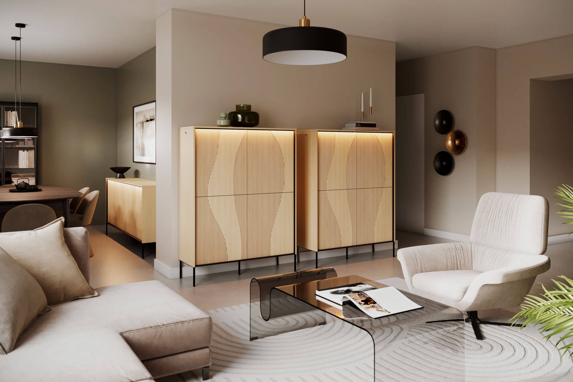 Charakterystyczny, frezowany front z miękką, organiczną linią nadaje bryle lekkości, a subtelne oświetlenie LED tworzy przyjemny klimat wieczorem. To idealne rozwiązanie dla osób, które cenią spójny design i praktyczne przechowywanie przy łóżku. Model doskonale komponuje się z pozostałymi meblami z kolekcji FLOW, pozwalając stworzyć harmonijną i nowoczesną aranżację sypialni.