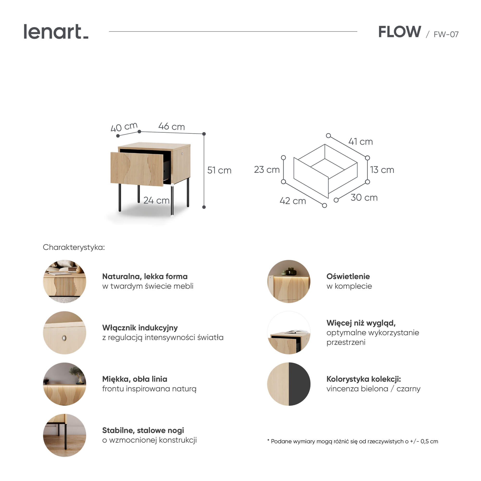 Najważniejsze cechy szafki nocnej FLOW FW-07 to oczywiście kompaktowy blat na lampkę, budzik czy oczyszczającą powietrze roślinkę i pojemna szuflada – miejsce na książkę, ładowarkę, okulary czy drobne akcesoria. Oświetlenie LED w komplecie (beż żadnych dopłat) tworzy nastrojowe światło idealne do wieczornego relaksu. Włącznik indukcyjny z regulacją intensywności to niesamowita wygoda na co dzień - wygodne sterowanie jasnością.