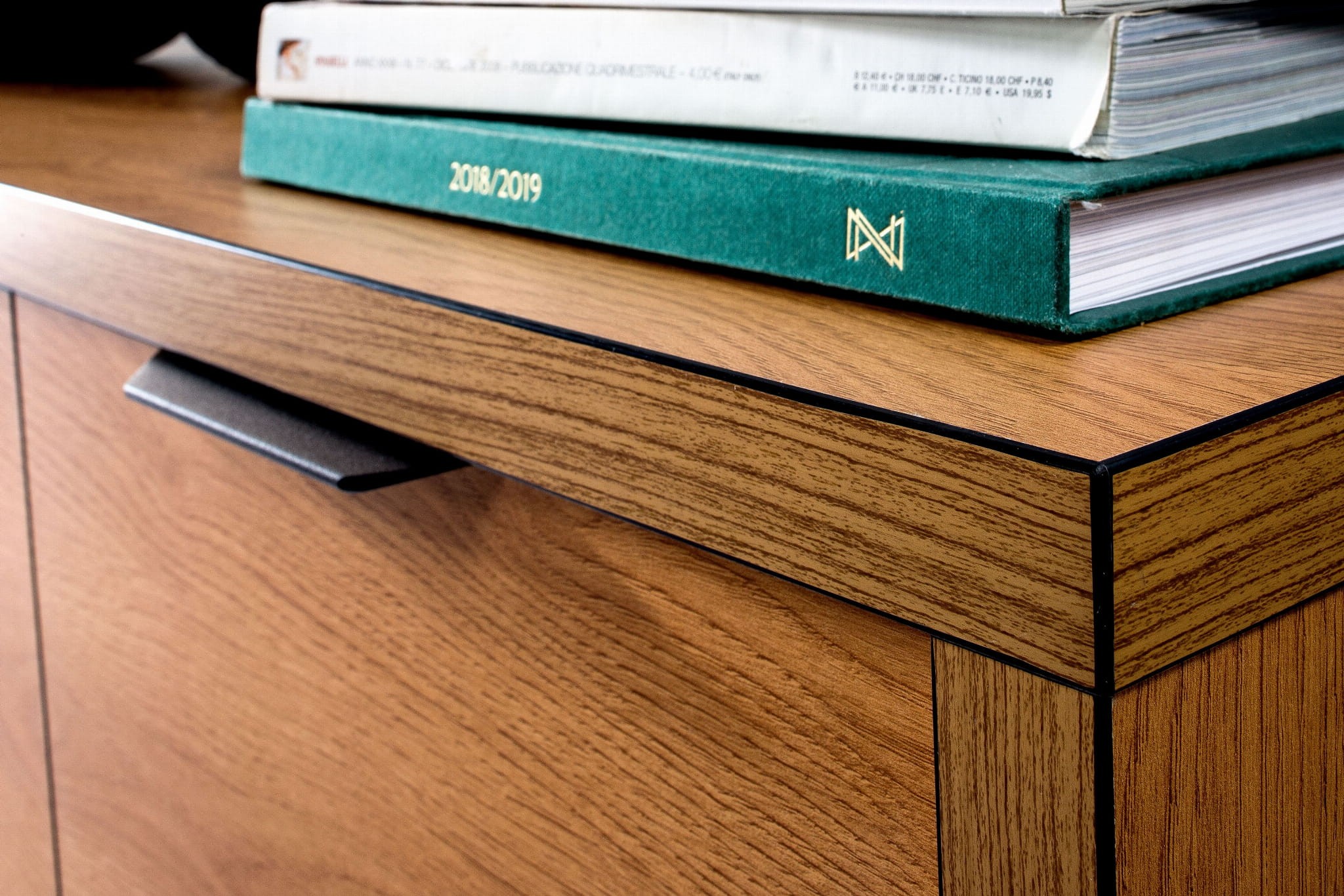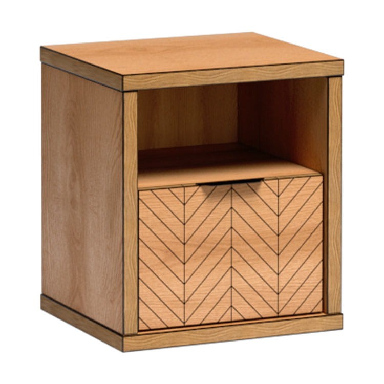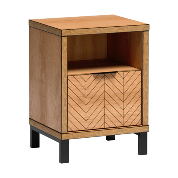 Przepiękna i unikatowa szafka nocna w stylu loftowym! Połączenie ciepłego koloru drewna z czarnym wzorem na froncie, wstawkami i subtelnym uchwytem prezentuje się tak wyjątkowo. Z całą pewnością szafka odmieni charakter sypialni dodając jej naturalności i barw. Ponadto zapewni dodatkowe miejsce na drobiazgi, okulary, książkę czy lampkę nocną i zadba o estetykę. Mocna konstrukcji z płyt laminowanych, wzmocnienie obrzeżem ABS i twardy tył sprawiają, że jest solidna, stabilna i odporna na uszkodzenia. Metalowe zawiasy z cichym domykiem i otwieranie push to open to dodatkowe elementy, które ułatwiają użytkowanie i zapobiegają awariom. Ciekawą opcją jest możliwość zamontowania w podstawie nóżek, które dodadzą szafce lekkości, a na pewno loftowego stylu!