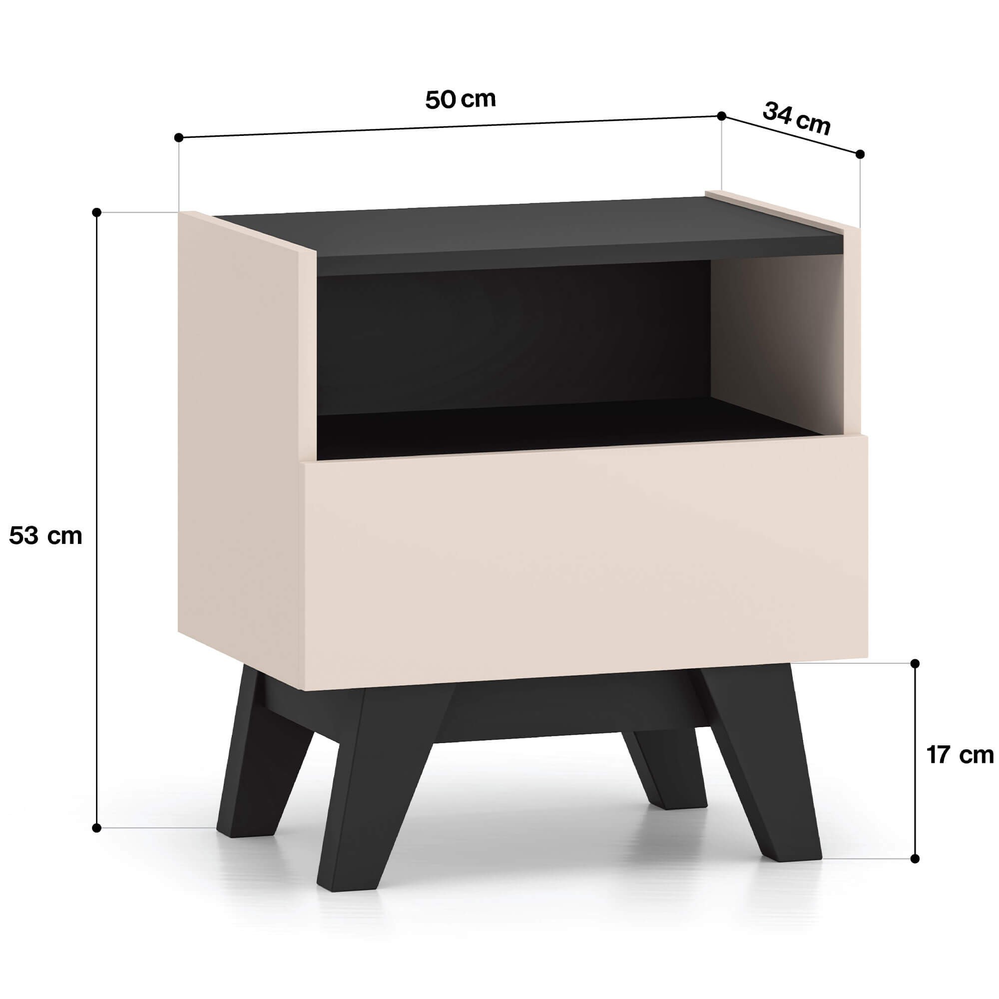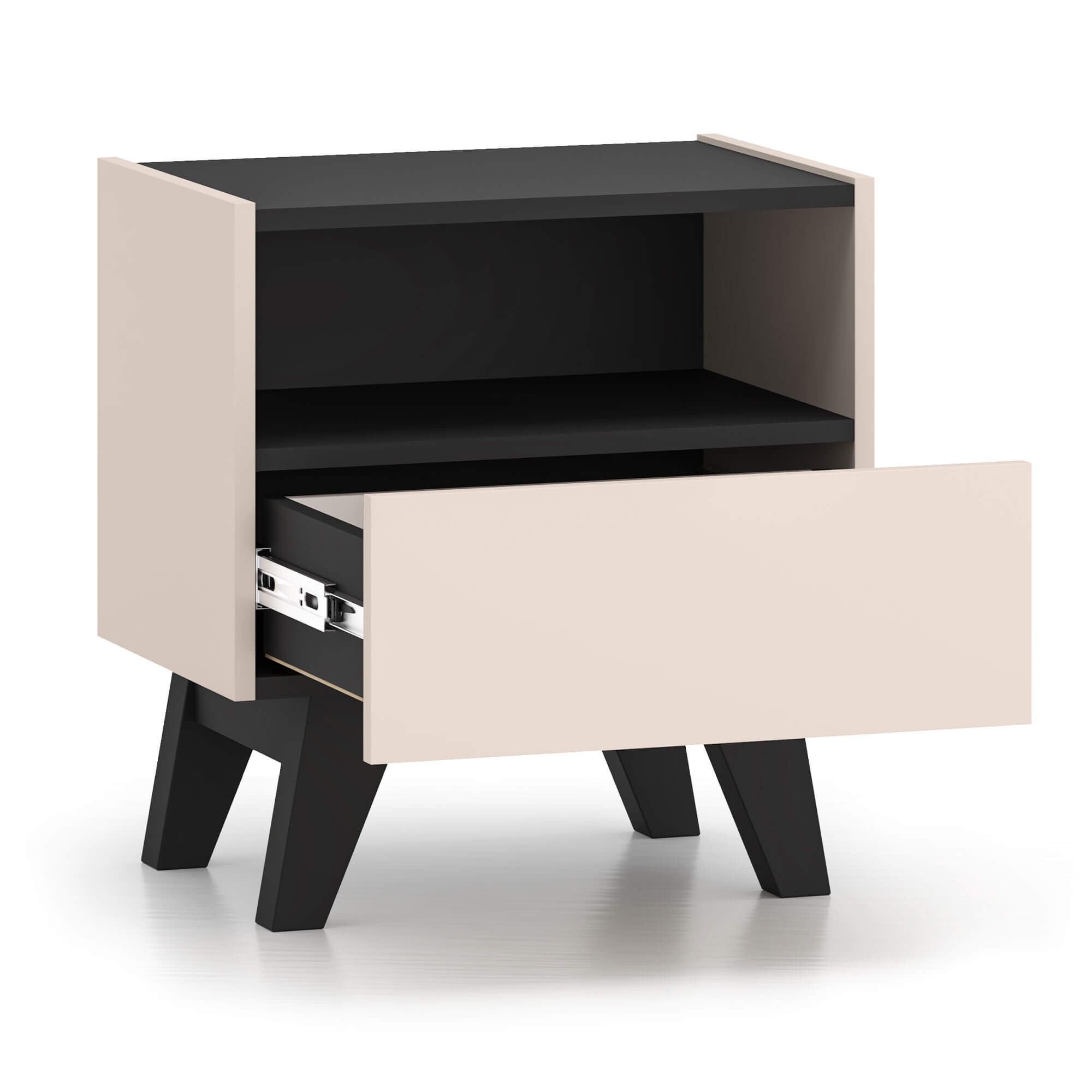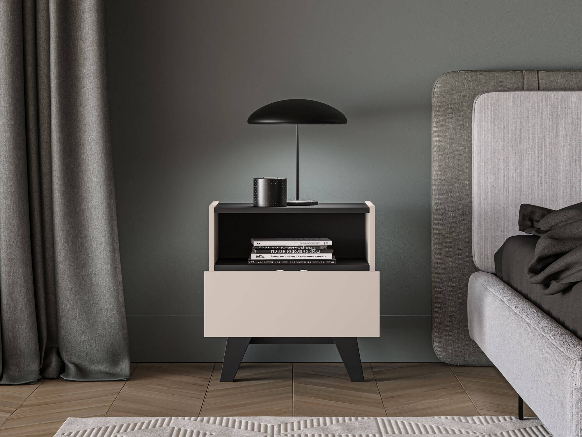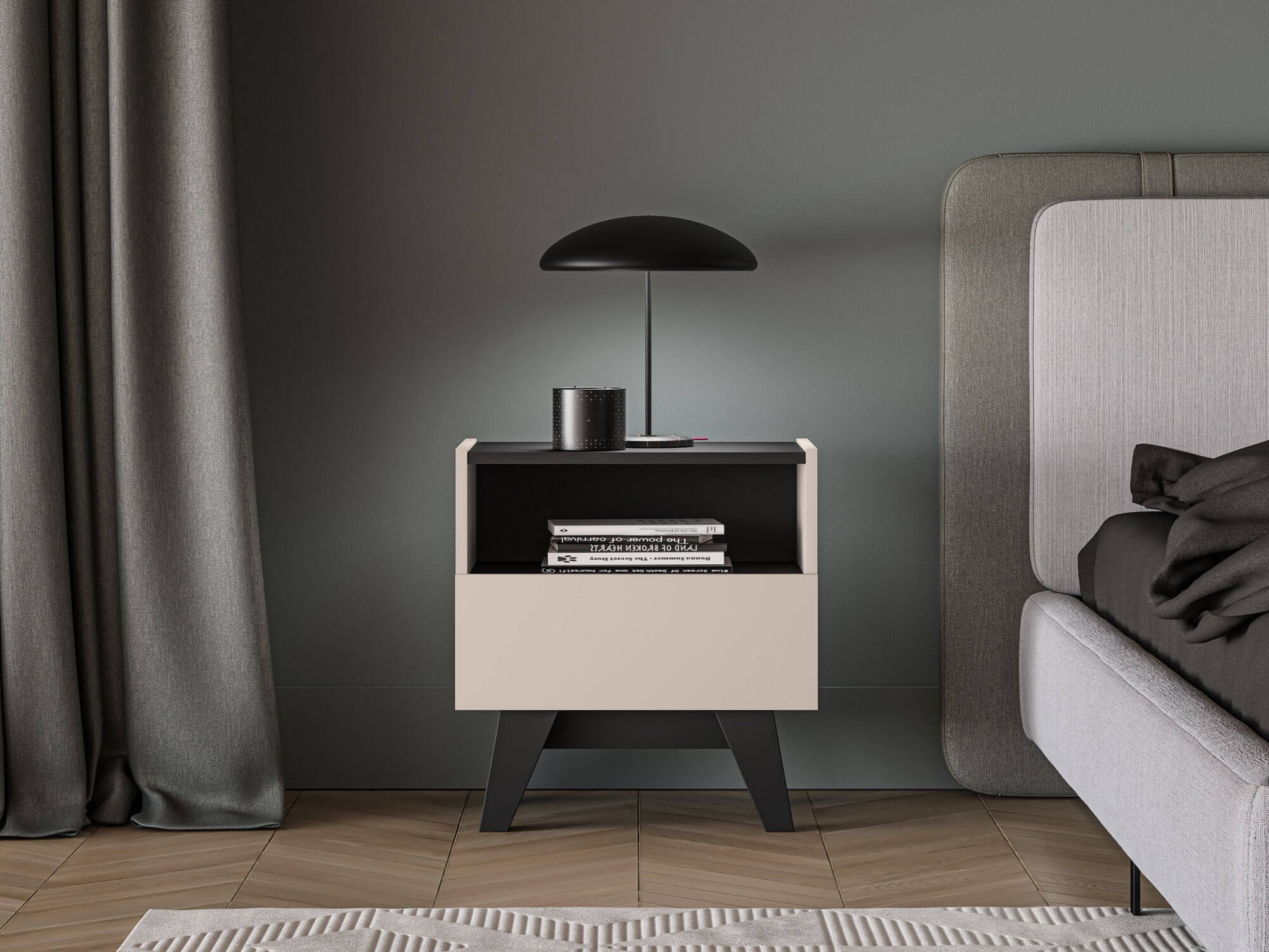 Nieodłącznym elementem każdej sypialni jest praktyczny stolik nocny! Postawiony przy łóżku służy praktycznym blatem na lampkę nocną do wieczornego czytania, by odstawić szklankę z wodą czy telefon, posiada otwartą wnękę na drobiazgi, okulary bądź czytaną książkę i szufladkę z funkcją pełnego wysuwu, co umożliwia przechowywanie obok łóżka wszystkiego, co potrzebujesz mieć pod ręką. Połączenie kaszmirowego wybarwienia i czarnego kontrastującego dekoru skutecznie dodaje nowoczesnego pazura i dba, by aranżacja była harmonijna, świeża i nie przytłaczała wnętrza. Dzięki bezuchwytowemu otwieraniu, szafka zachowuje czystą, minimalistyczną linię i zachwyca prostotą. Idealnie sprawdzi się w nowocześnie urządzonej sypialni, stanowiąc wyrazisty i przyciągający wzrok akcent. Całość dopełniają stylowe nóżki w czarnym kolorze. Nadają nie tylko lekkości całej bryle, ale również dbają o stabilność i ułatwiają utrzymanie porządku pod meblem.