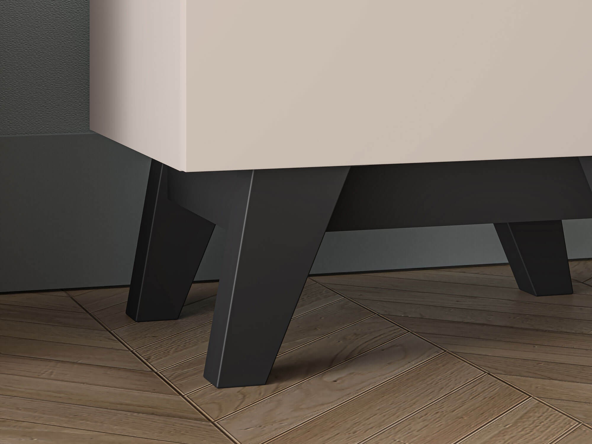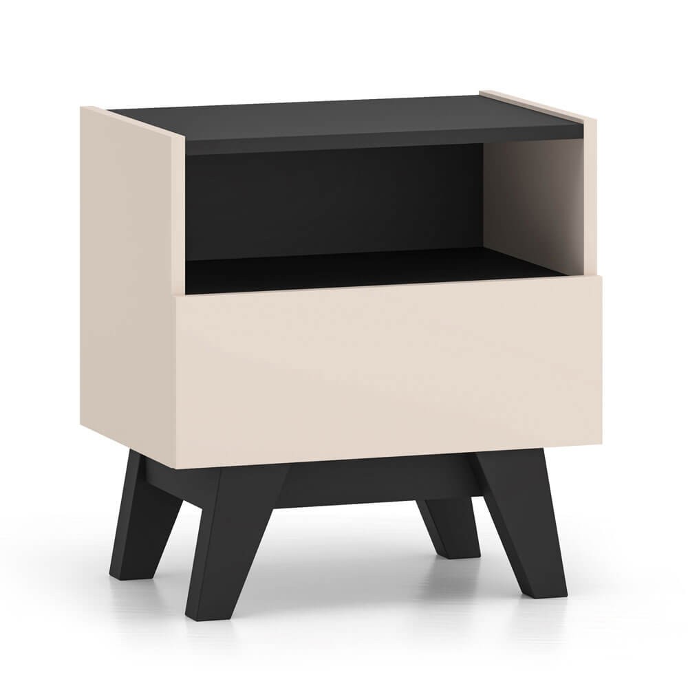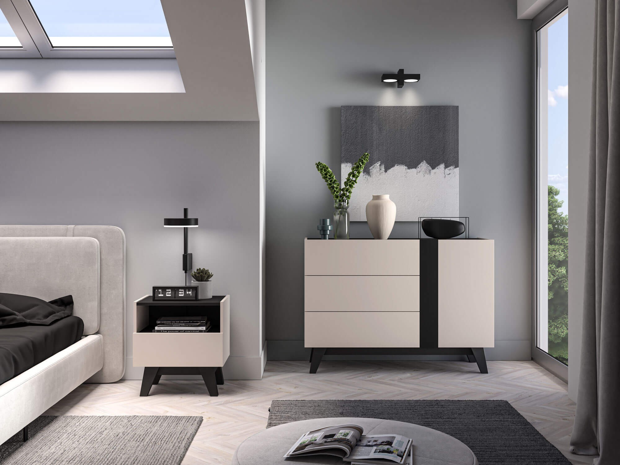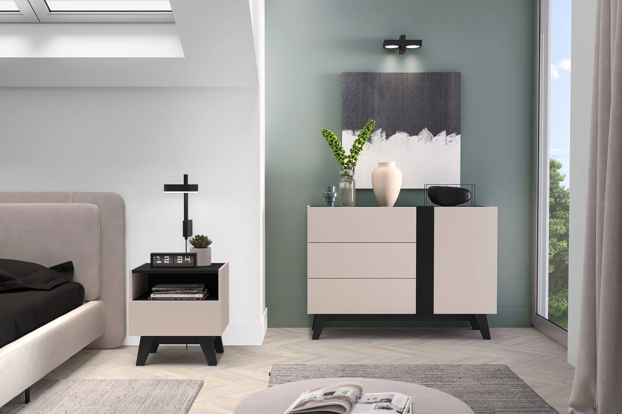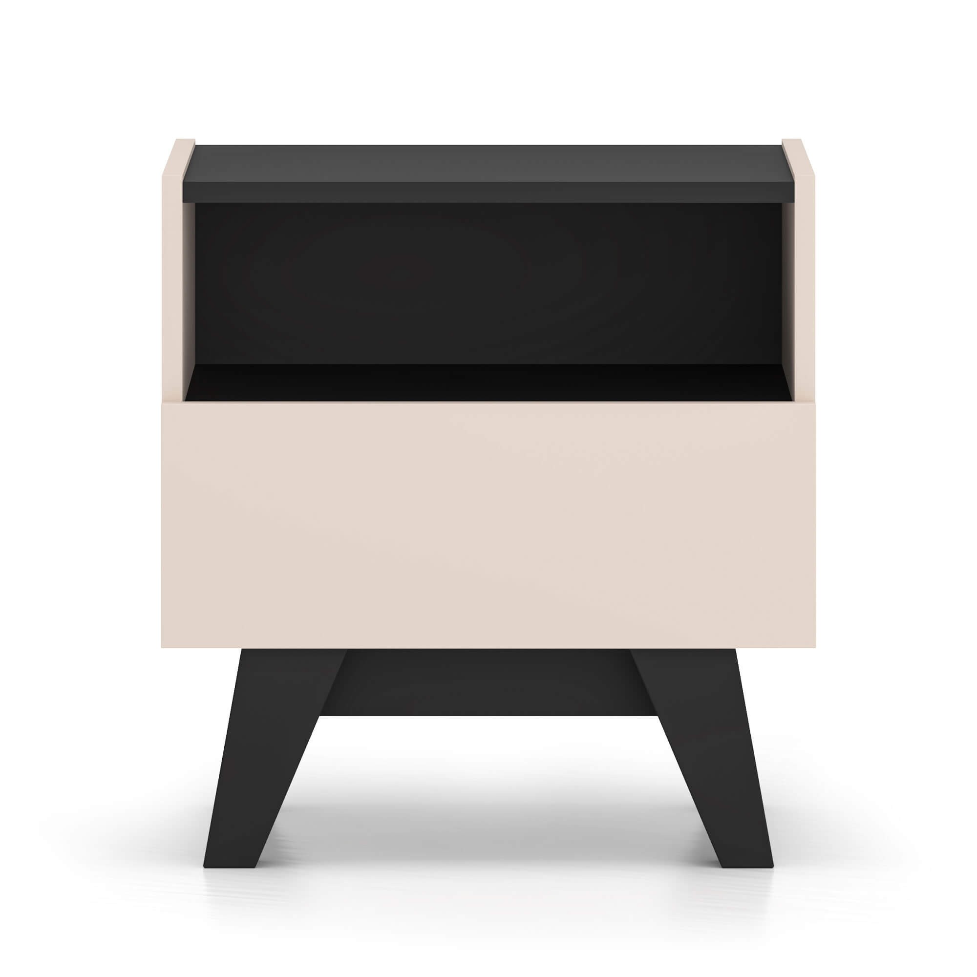 Nieodłącznym elementem każdej sypialni jest praktyczny stolik nocny! Postawiony przy łóżku służy praktycznym blatem na lampkę nocną do wieczornego czytania, by odstawić szklankę z wodą czy telefon, posiada otwartą wnękę na drobiazgi, okulary bądź czytaną książkę i szufladkę z funkcją pełnego wysuwu, co umożliwia przechowywanie obok łóżka wszystkiego, co potrzebujesz mieć pod ręką. Połączenie kaszmirowego wybarwienia i czarnego kontrastującego dekoru skutecznie dodaje nowoczesnego pazura i dba, by aranżacja była harmonijna, świeża i nie przytłaczała wnętrza. Dzięki bezuchwytowemu otwieraniu, szafka zachowuje czystą, minimalistyczną linię i zachwyca prostotą. Idealnie sprawdzi się w nowocześnie urządzonej sypialni, stanowiąc wyrazisty i przyciągający wzrok akcent. Całość dopełniają stylowe nóżki w czarnym kolorze. Nadają nie tylko lekkości całej bryle, ale również dbają o stabilność i ułatwiają utrzymanie porządku pod meblem.
