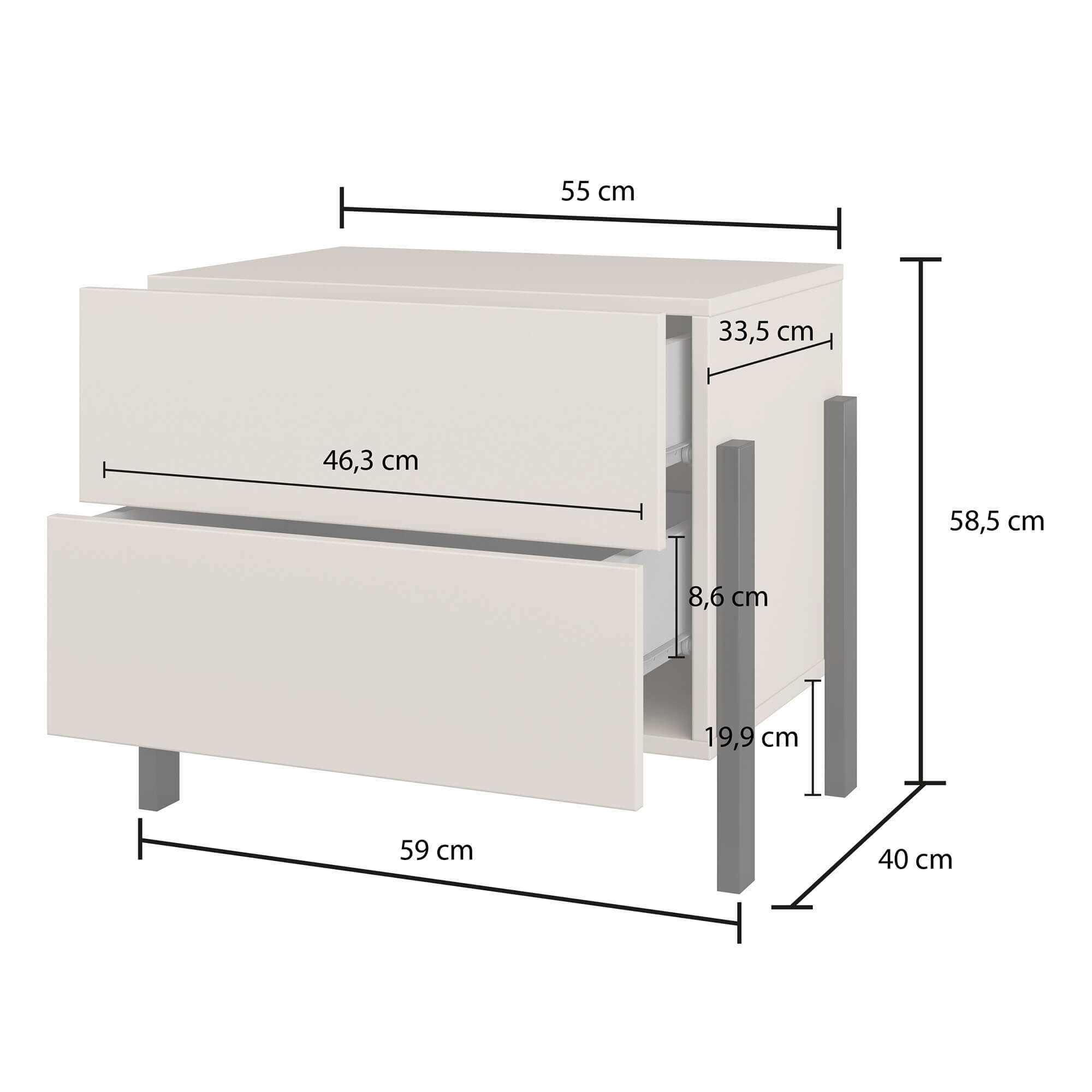 • 2 szuflady na prowadnicach rolkowych, głębokość jednej szuflady ok. 33 cm, szerokość ok. 46 cm.