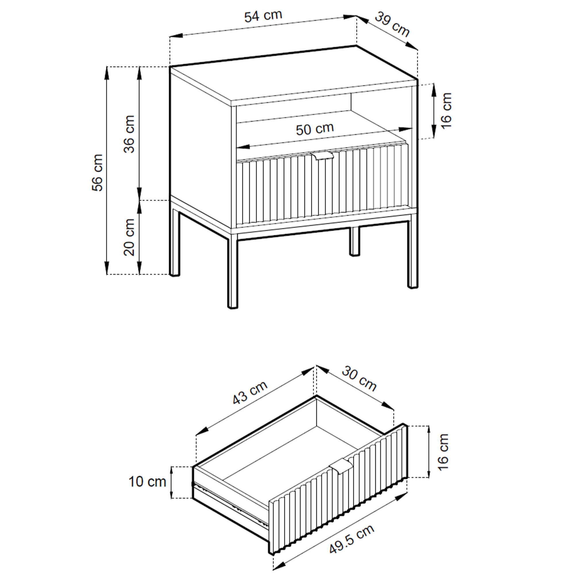 Model ma 54 cm szerokości i 39 cm głębokości, dzięki czemu bez problemu zmieści się nawet w mniejszej sypialni. Całkowita wysokość to 56 cm, w tym 20 cm przypada na smukły, czarny stelaż, który dodaje konstrukcji wizualnej lekkości. Szafka została wyposażona w pojemną szufladę – idealną na drobiazgi, które chcesz mieć pod ręką – oraz otwartą półkę, świetną na książki lub magazyny. Blat zapewnia wygodne miejsce na lampkę nocną, budzik czy dekoracje.