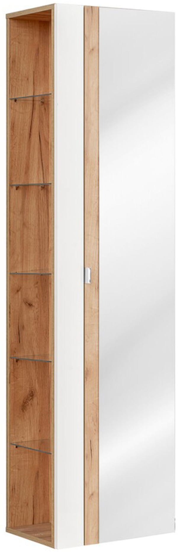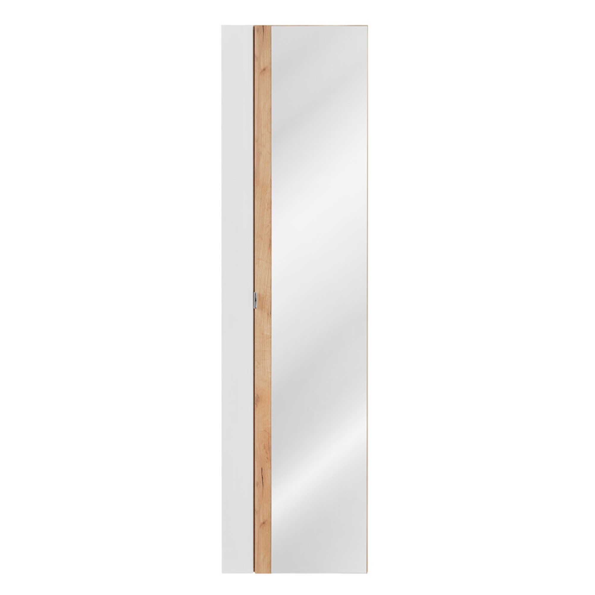 Odkryj niezwykłą szafkę wysoką 1 drzwi z kolekcji Capri White, która od razu przyciąga uwagę swoim eleganckim, białym połyskiem i ciepłym dekorem Dąb Złoty Craft. Front wyposażony w duże lustro optycznie powiększa każde wnętrze, wprowadzając do niego lekkość i subtelny blask, a jednocześnie doskonale sprawdzi się podczas codziennej pielęgnacji czy ostatniego rzutu oka przed wyjściem. Wnętrze ozdobione dekoracyjnym dekorem Dąb Złoty Craft tworzy przytulną, naturalną atmosferę, która doskonale komponuje się z minimalistycznym, nowoczesnym stylem białego połysku. Dyskretny, chromowany uchwyt wkomponowany w krawędź frontu podkreśla wyjątkową elegancję mebla, jednocześnie umożliwiając wygodne otwieranie drzwi. Przestrzeń za frontem wypełniają hartowane, szklane półki, które pozwalają na efektowną ekspozycję kosmetyków, akcesoriów czy dekoracji, a powłoka odporna na wilgoć i łatwa w utrzymaniu czystości gwarantuje nienaganny wygląd mebla przez długie lata. Szafka wysoka 1 drzwi Capri White to must-have dla każdego, kto ceni połączenie funkcjonalności z modnym designem – spraw, by Twoja łazienka lub przedpokój zyskały niepowtarzalny charakter i uporządkowaną przestrzeń, a zarazem ciesz się wyjątkowym komfortem użytkowania.