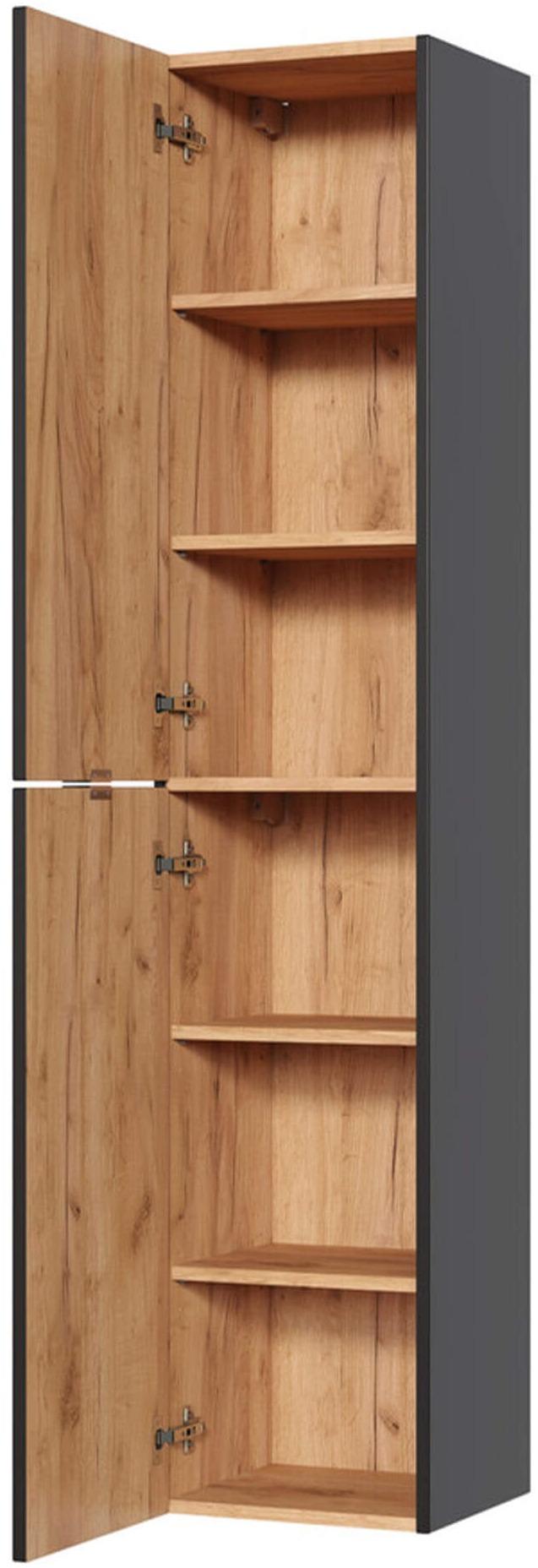 Szafka wysoka 2 drzwi z kolekcji Capri Cosmos w ponadczasowym wykończeniu czarny mat to propozycja dla osób ceniących nowoczesny minimalizm i funkcjonalność w jednym. Smukła sylwetka mebla doskonale wpasuje się nawet w wąskie wnętrza łazienki czy przedpokoju, a głęboka, matowa czerń wprowadzi elegancki, loftowy klimat. Fronty bez frezowań i dyskretne, chromowane uchwyty podkreślają prostotę formy, podczas gdy wnętrze wykończone dekoracyjnym Dębem Craft Złotym zapewnia przytulny kontrast oraz ciepłą oprawę przechowywanych rzeczy. Dzięki regulowanym półkom i pojemnym drzwiczkom z cichym domykiem szafka zapewnia porządek i komfort użytkowania każdego dnia. Odporna na wilgoć i łatwa w czyszczeniu powierzchnia z folii PVC utrzyma mebel w nienagannym stanie, a szybki montaż ścienny bez potrzeby fachowej pomocy pozwoli od razu cieszyć się stylową i praktyczną organizacją przestrzeni. Wybierz szafkę Capri Cosmos i odkryj idealne połączenie designu oraz trwałości w Twoim domu.