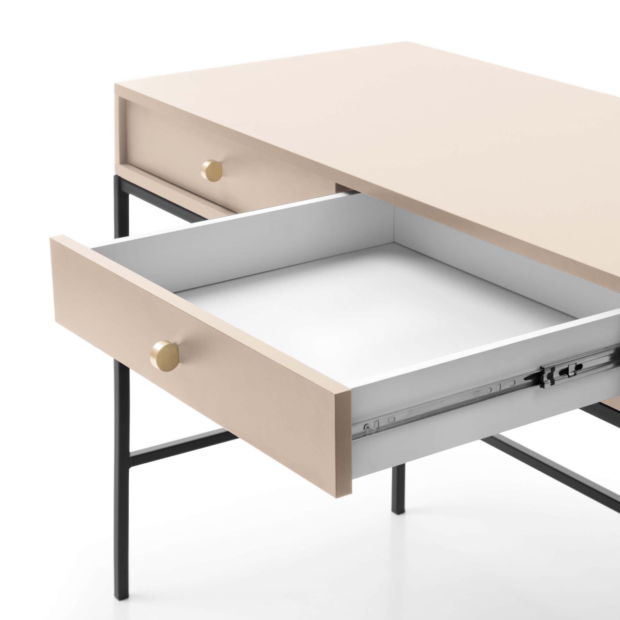 Złote uchwyty zwieńczają elegancki charakter toaletki, przepięknie komponują się z beżem, a praktyczne szuflady to świetne rozwiązanie, ponieważ pomogą zachować porządek i zorganizować kosmetyki, kremy, perfumy bądź biżuterię.