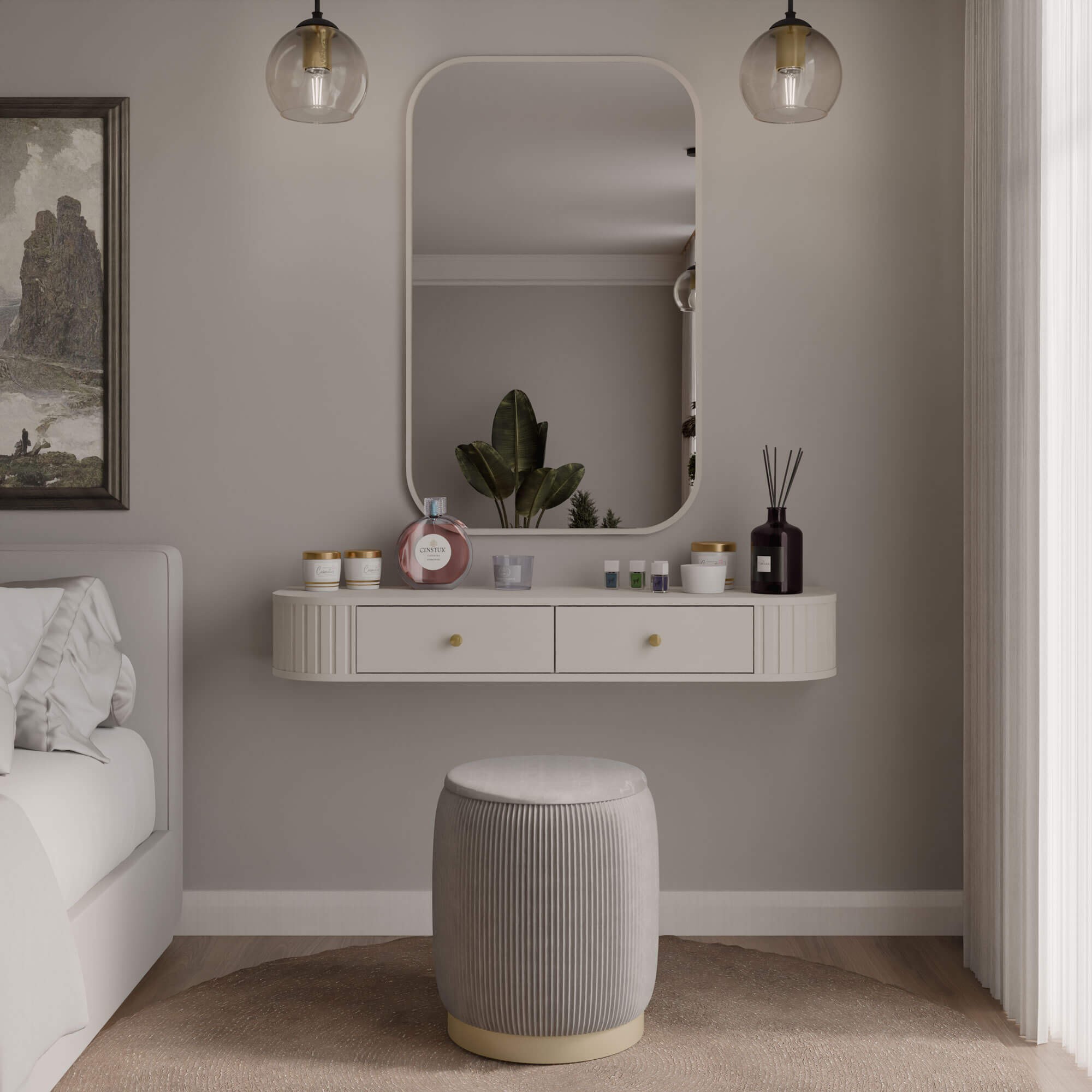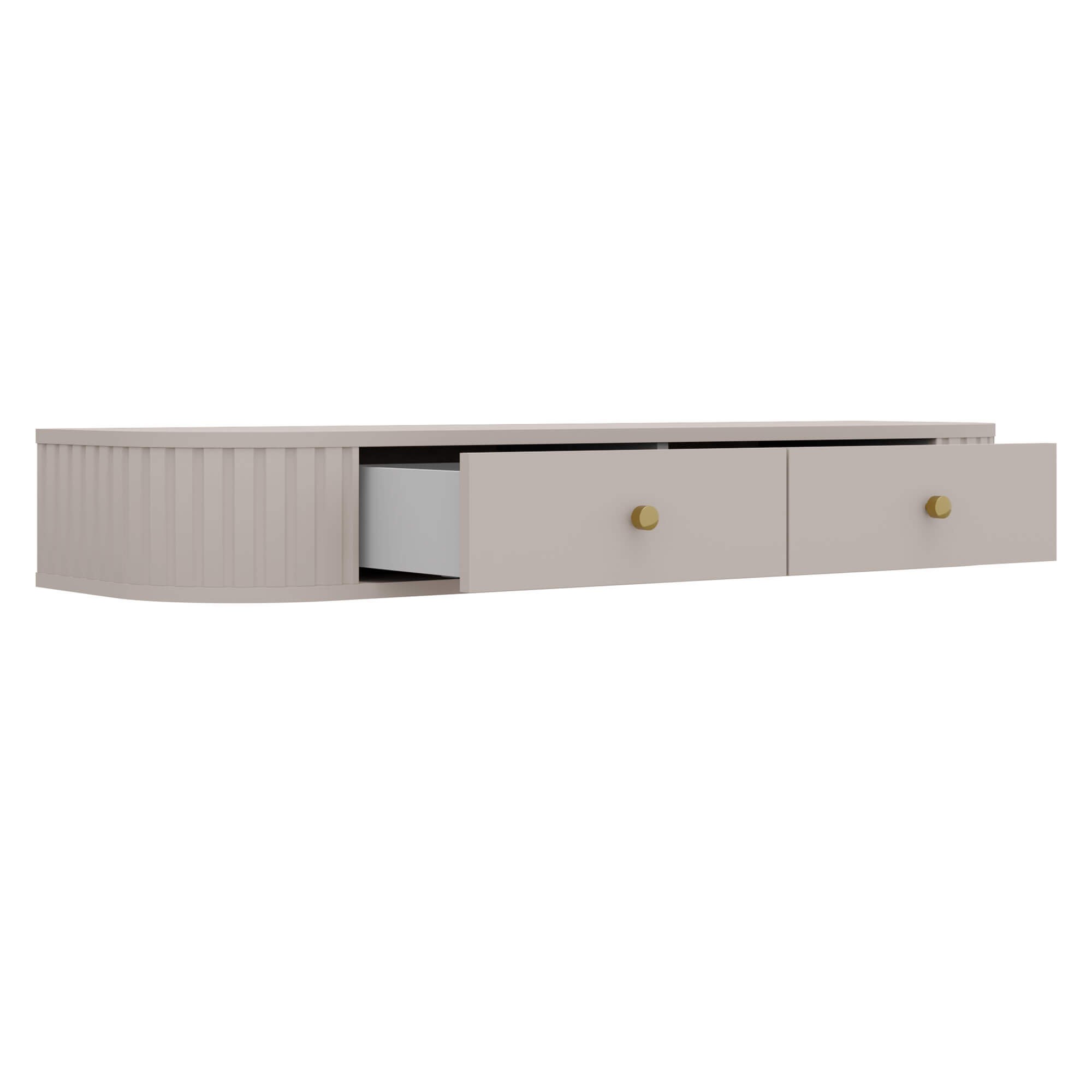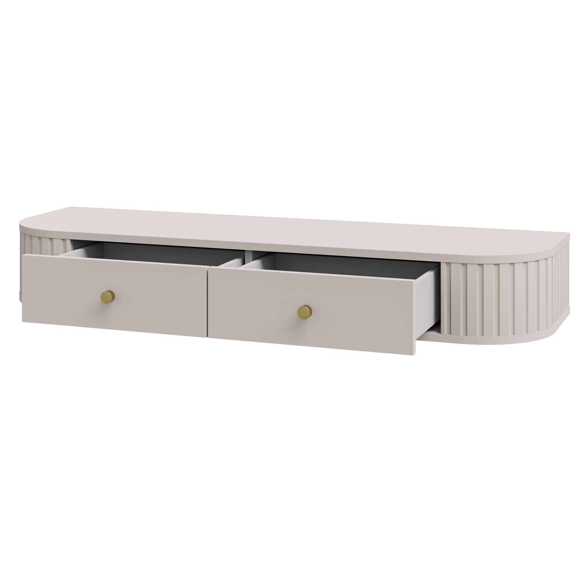 Toaletka OVALIO w kolorze beż piaskowy to subtelny i stylowy element wyposażenia sypialni lub garderoby. Jej delikatnie zaokrąglone boki z dekoracyjnym ryflowaniem nadają bryle miękkości, a złote uchwyty stanowią elegancki akcent podkreślający nowoczesny charakter mebla. Minimalistyczna forma sprawia, że toaletka doskonale prezentuje się zarówno w aranżacjach nowoczesnych, japandi, jak i w eleganckich, kobiecych wnętrzach z nutą glamour. Lekka, wisząca konstrukcja nadaje wnętrzu nowoczesny charakter i nie obciąża optycznie przestrzeni, a gładki blat zapewnia wygodną przestrzeń do codziennej pielęgnacji lub pracy. Dzięki uniwersalnej konstrukcji mebel może być wykorzystywany zarówno jako toaletka kosmetyczna, jak i praktyczna półka wisząca lub konsola do salonu czy przedpokoju.