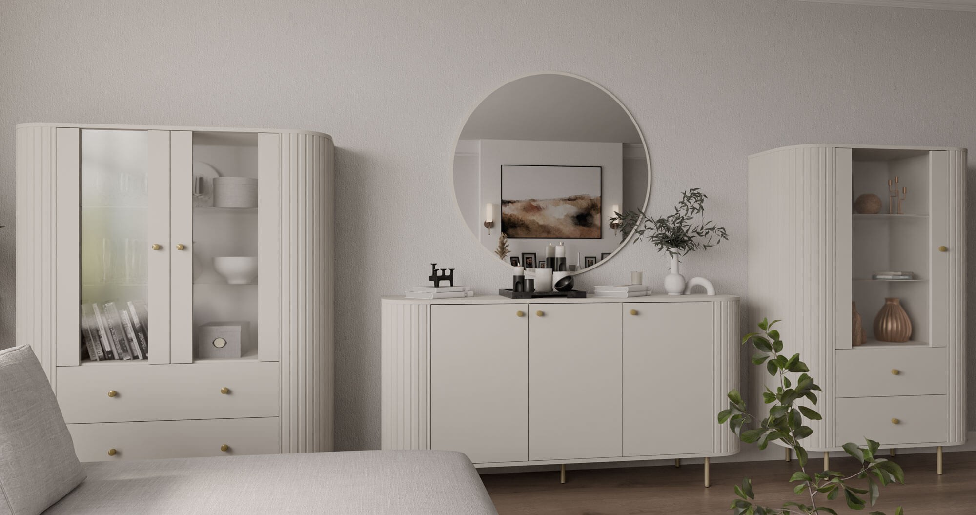 Toaletka OVALIO może pełnić funkcję klasycznej konsoli, miejsca do makijażu lub eleganckiej półki ściennej. W połączeniu z okrągłym lub prostokątnym lustrem z tej samej serii tworzy spójną, harmonijną kompozycję. Toaletka dodatkowo jest przeznaczona do zawieszenia, co pozwala na dowolne ustawienie w pomieszczeniu i dopasowanie do indywidualnych potrzeb. Kolor beż piaskowy w zestawieniu ze złotymi uchwytami nadaje wnętrzu ciepła, subtelności i ponadczasowej elegancji.