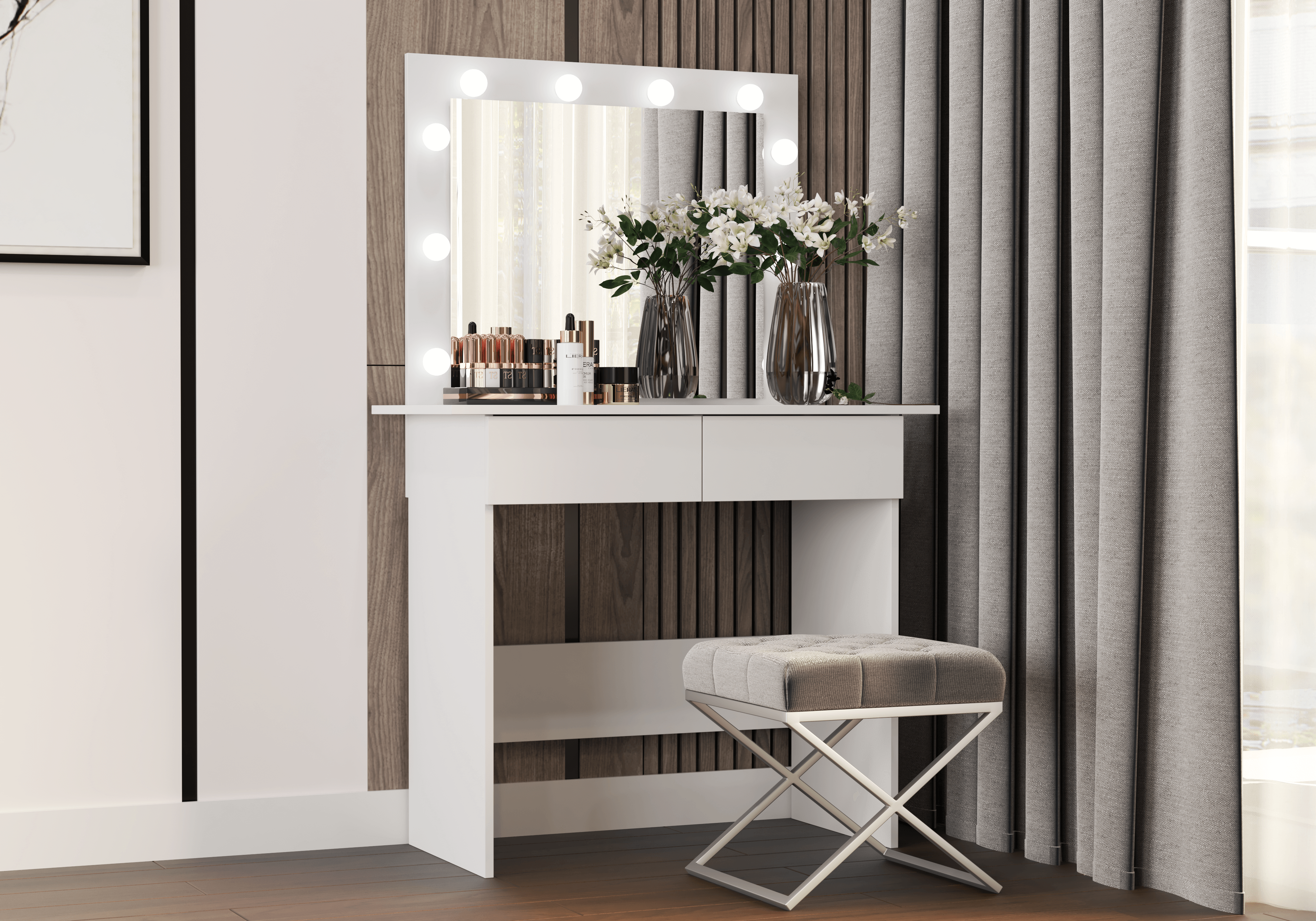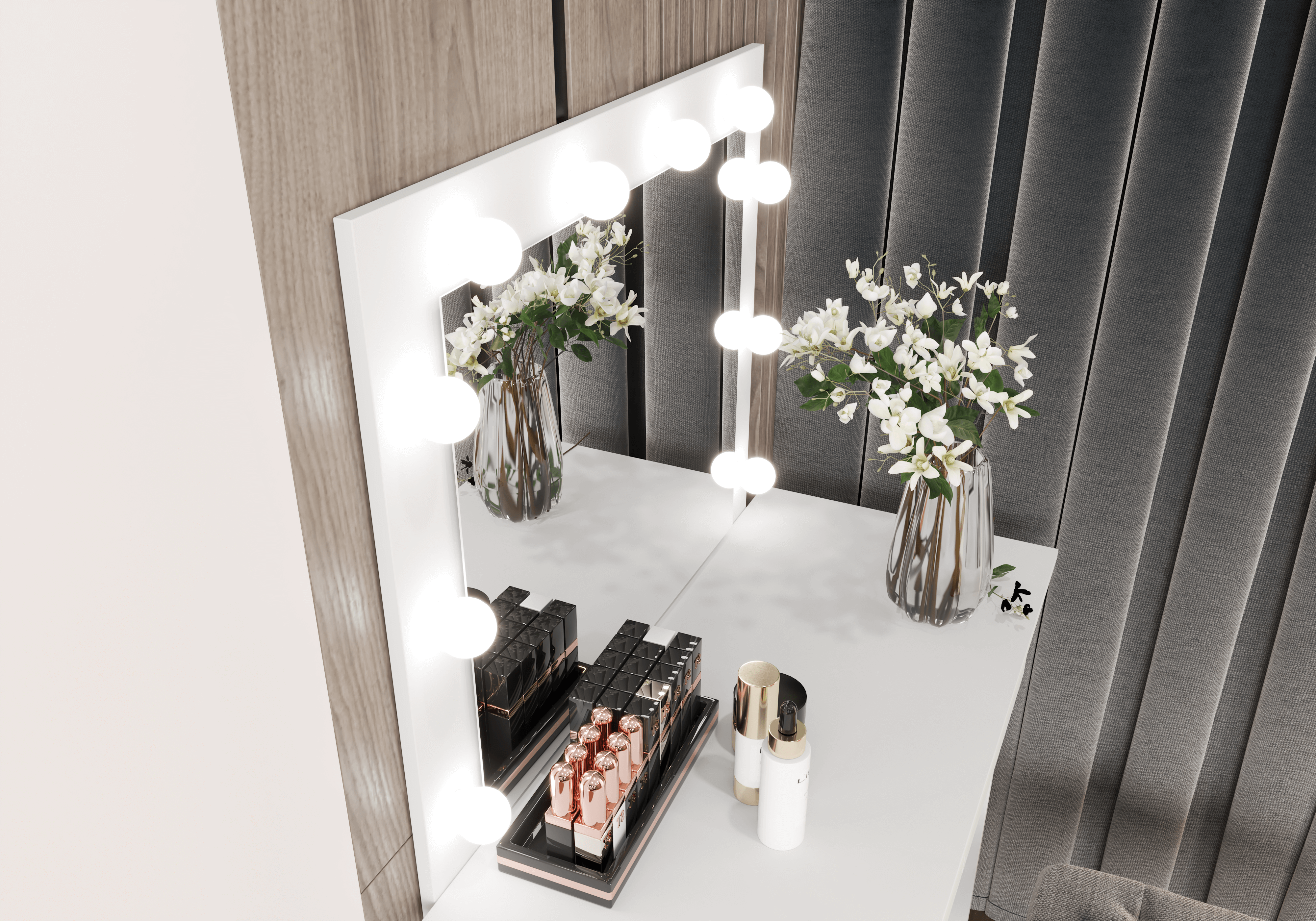 Wyjątkowe miejsce każdej kobiety… toaletka kosmetyczna Glamour, przy której czas płynie wolniej, a szykowanie do wyjścia staje się przyjemnością! Poznajcie model wyposażony w przestronny blat, lustro z profilem LED i szuflady, które dają wystarczająco dużo miejsca, by pomieścić kosmetyki, biżuterię, kremy, akcesoria i wiele innych gadżetów, a przy tym zadbać o porządek i estetykę sypialni. Opcją, która czyni ogromną różnicę jest zamontowany LED! Odpowiednio oświetlone lustro to większy komfort podczas wykonywania makijażu i fryzury, a przy okazji ciekawy aspekt wizualny.