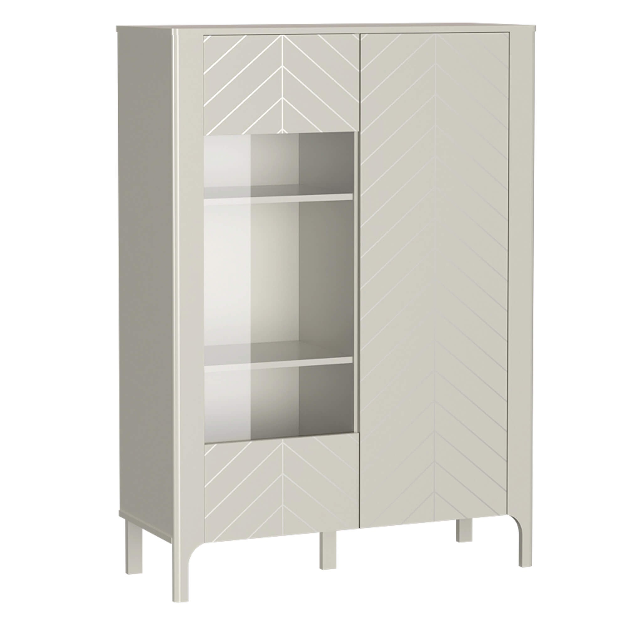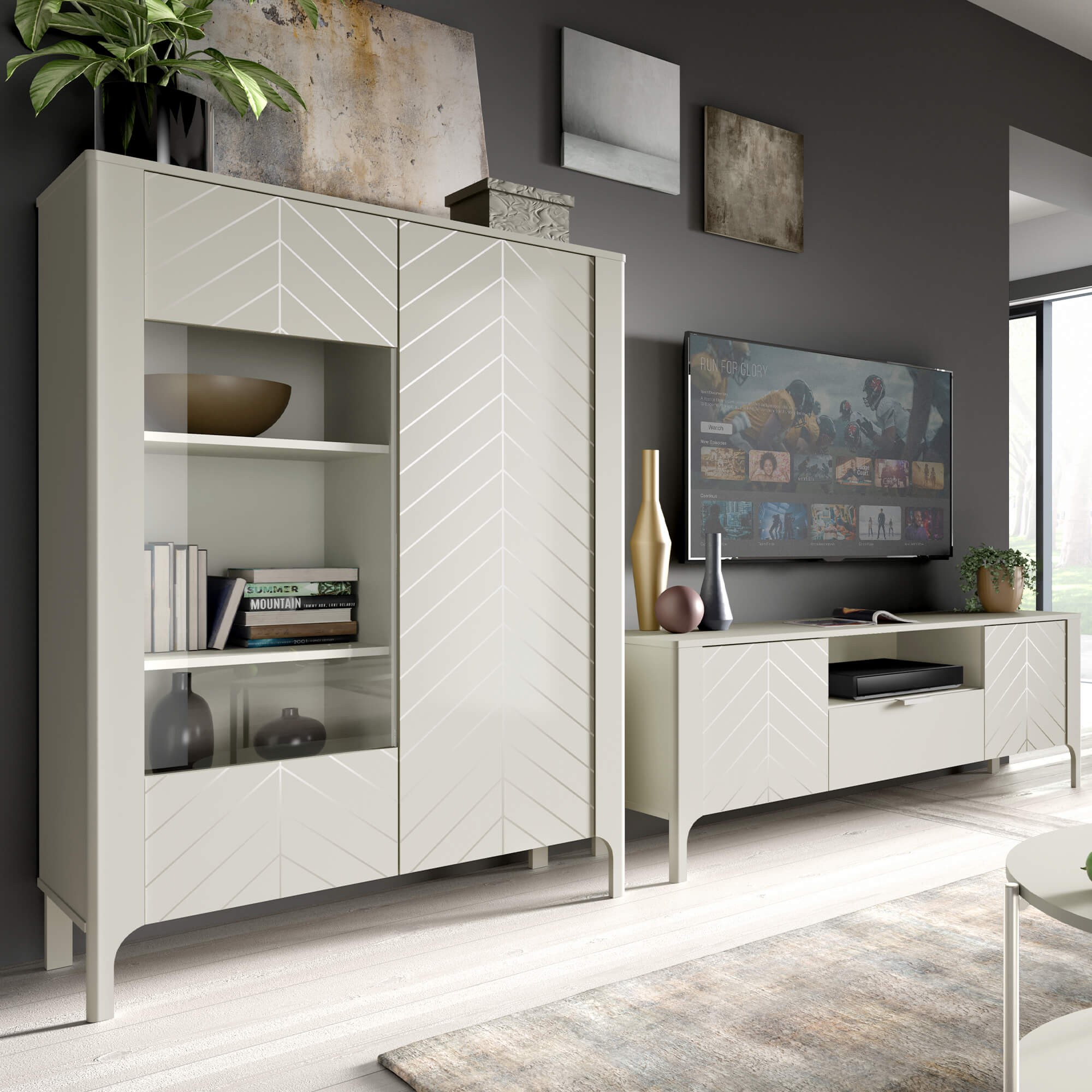 Witryna MM-3 to mebel, który łączy w sobie subtelną elegancję z nowoczesnym sznytem. Jej znakiem rozpoznawczym są fronty zdobione delikatnym wzorem w jodełkę, które w połączeniu z niezwykle modnym kolorem cashmere tworzą spójną i luksusową całość. To idealna propozycja dla osób poszukujących mebli z charakterem, które nie przytłaczają wnętrza, a nadają mu lekkości.