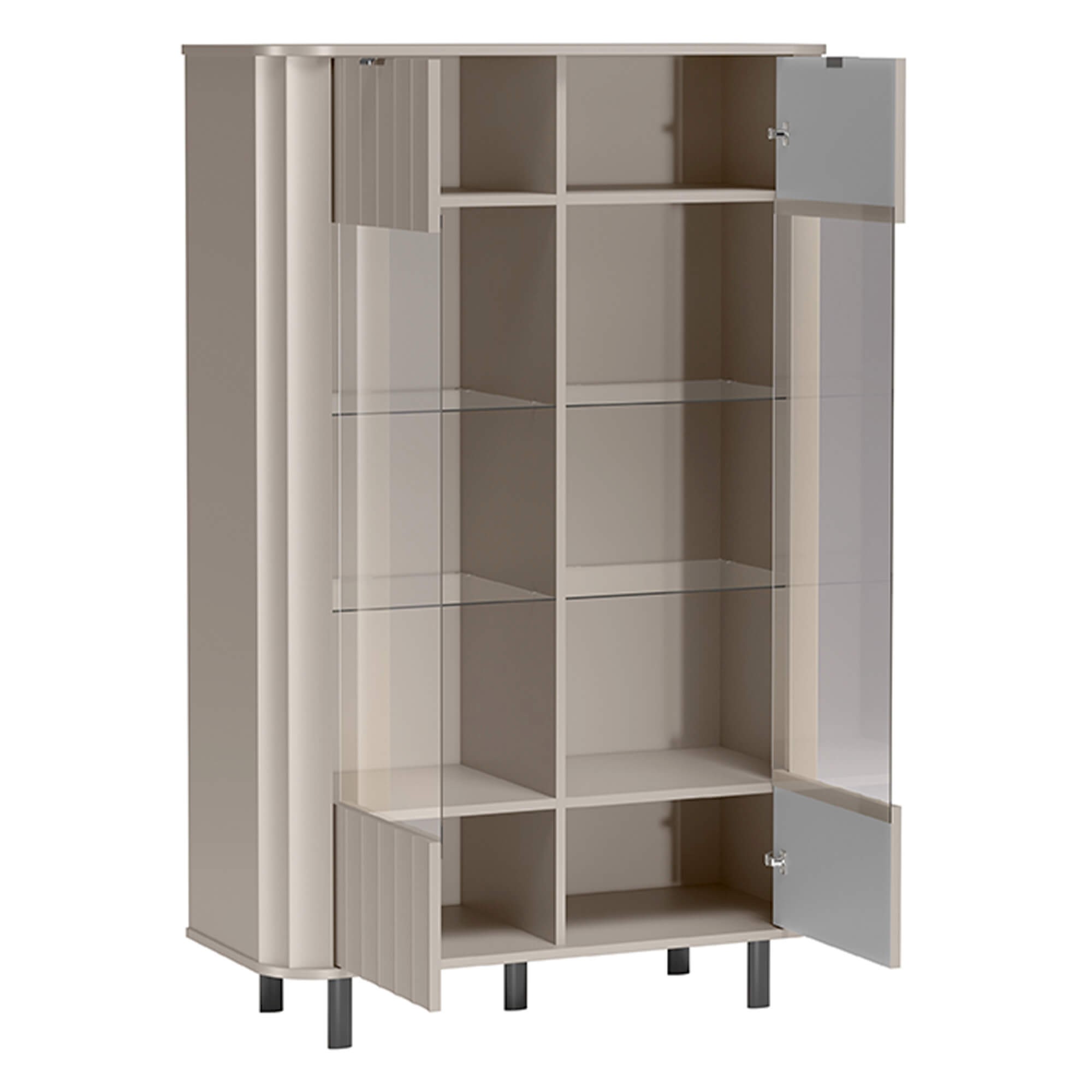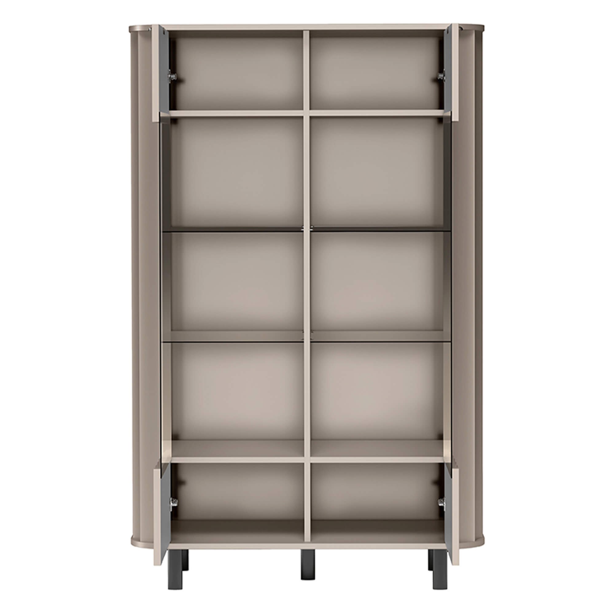 Mebel wyróżnia się charakterystycznymi dla serii NOVADO zaokrąglonymi krawędziami, które łagodzą bryłę i podnoszą bezpieczeństwo użytkowania. Wnętrze skrywa aż cztery szklane półki o grubości 5mm, które oferują mnóstwo miejsca do aranżacji, zachowując przy tym przejrzystość i blask. To idealne rozwiązanie dla osób, które chcą połączyć funkcję przechowywania z dekoracyjnym charakterem wnętrza.