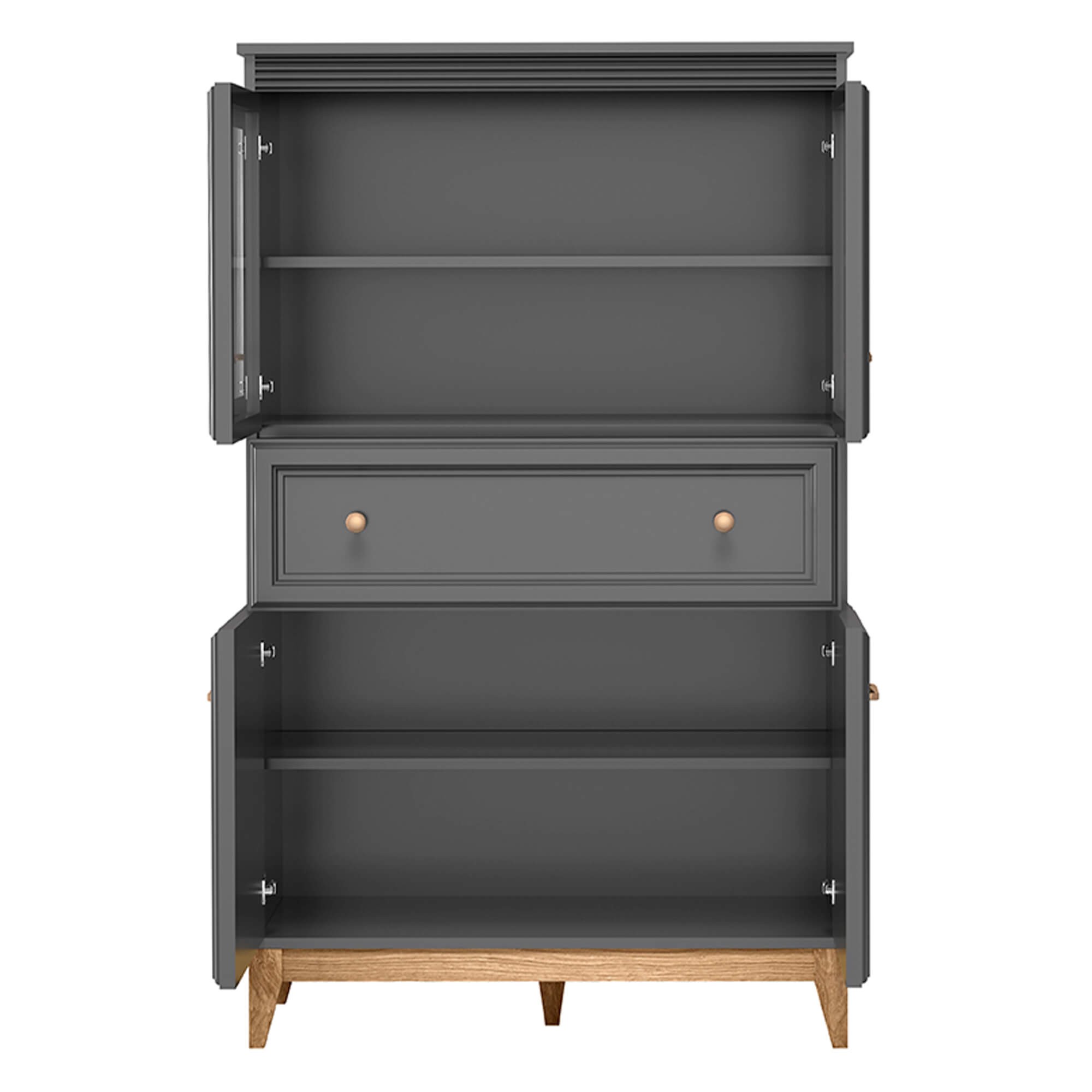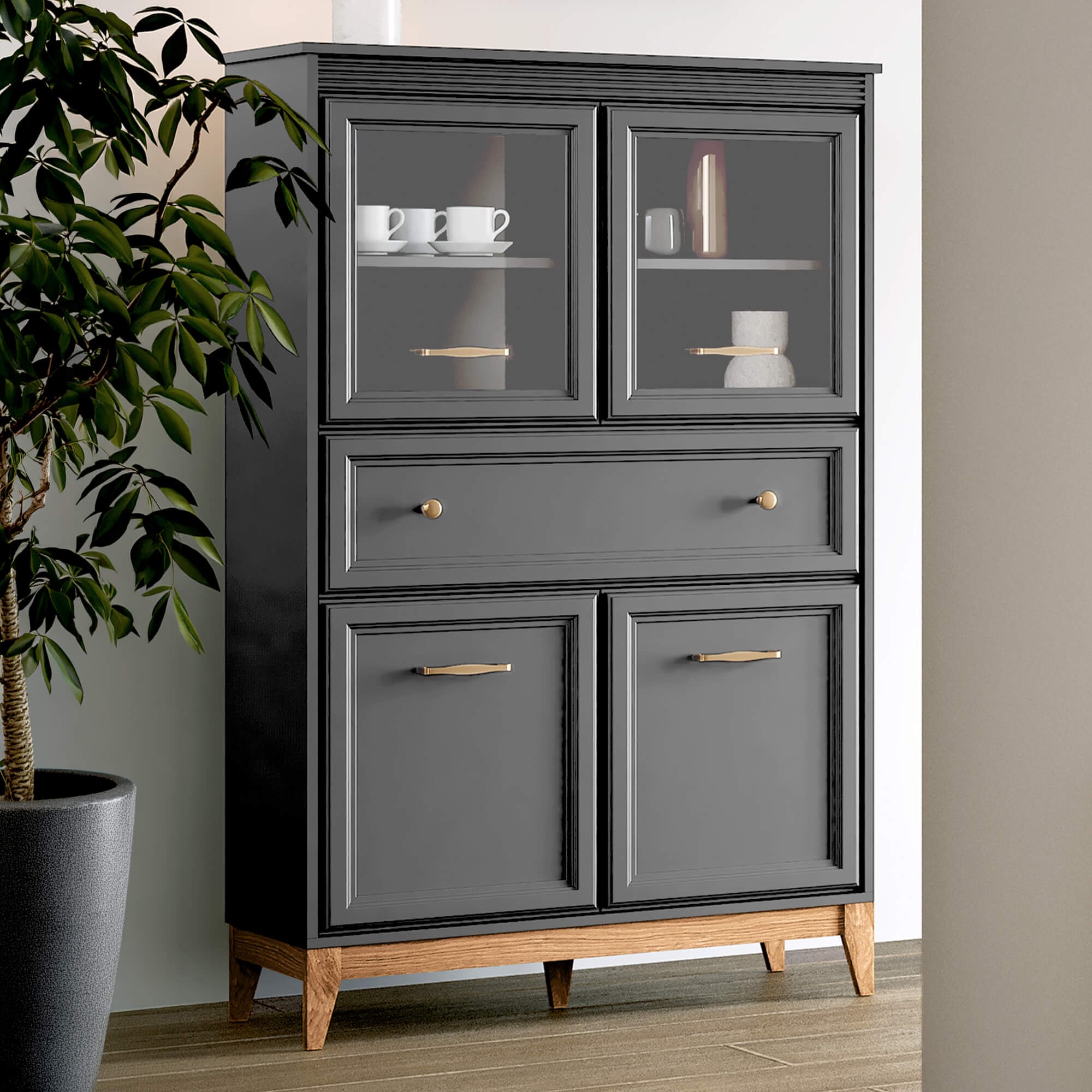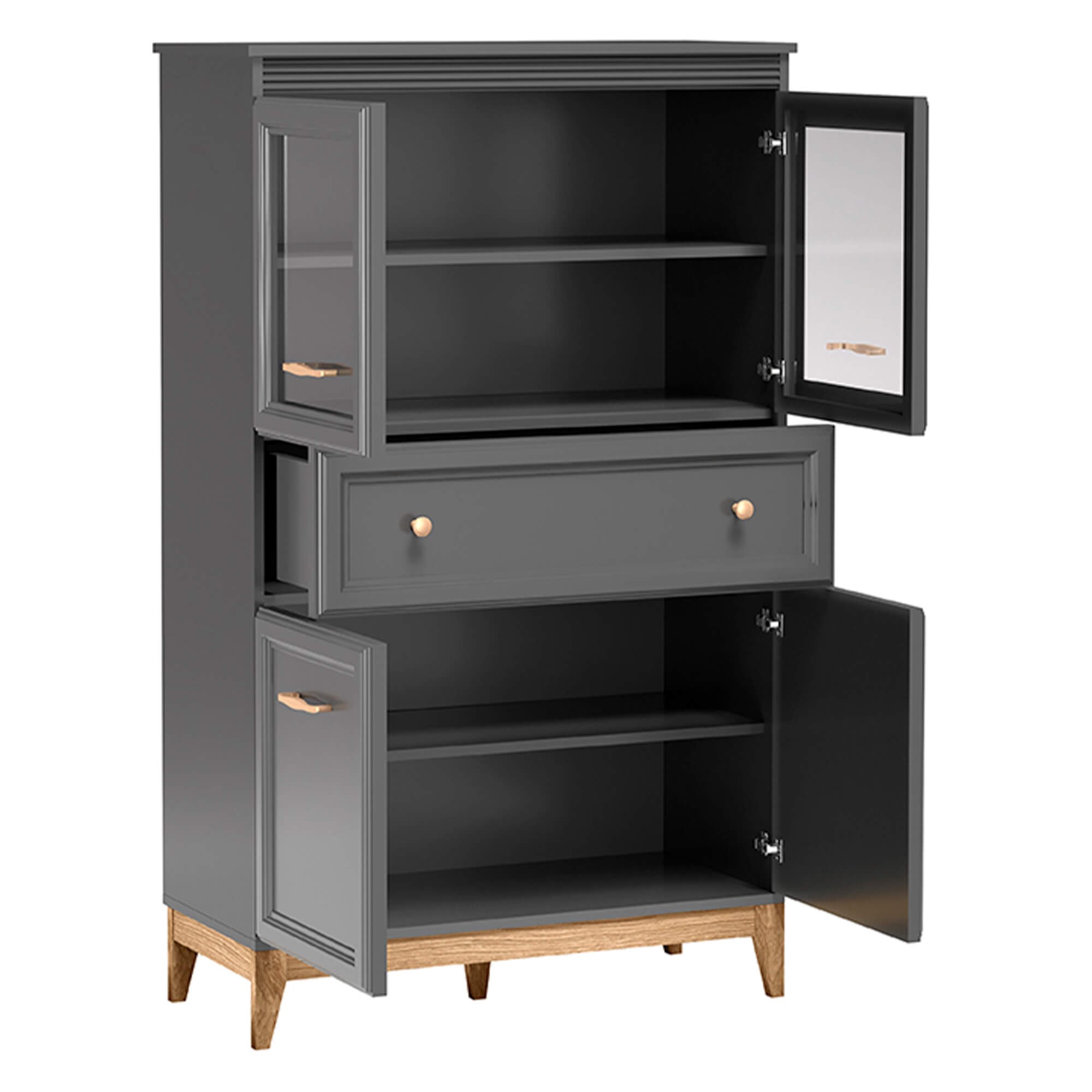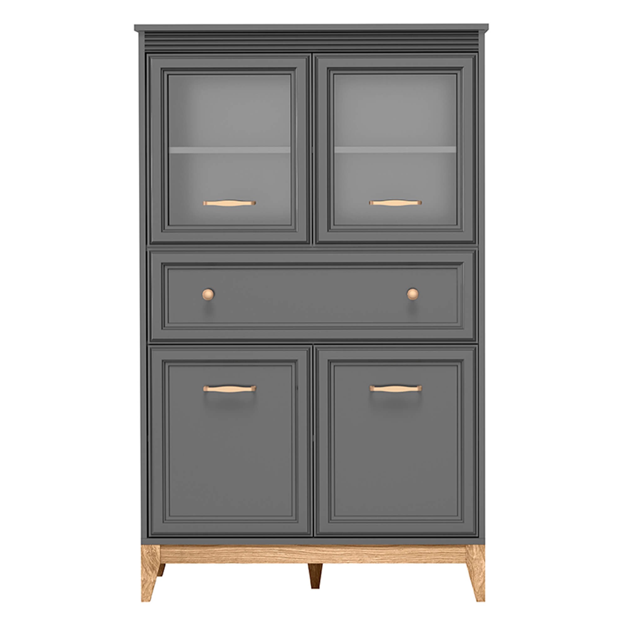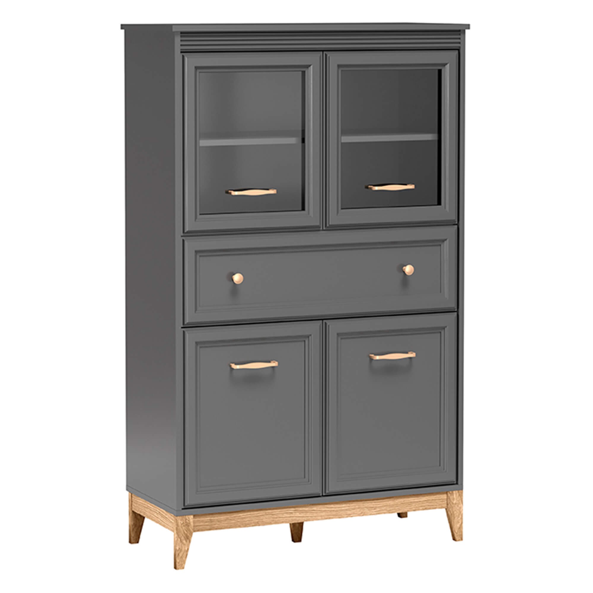 Witryna TERRA TA-5 to mebel stworzony dla miłośników elegancji i nowoczesnego szyku. Fronty w unikalnym kolorze szarego diamentu o matowym wykończeniu tworzą doskonałą bazę dla luksusowych dodatków. Subtelne akcenty w kolorze różowego złota oraz naturalne, dębowe nogi nadają bryle lekkości i wyrafinowanego charakteru, wpisując się w trend modern classic.