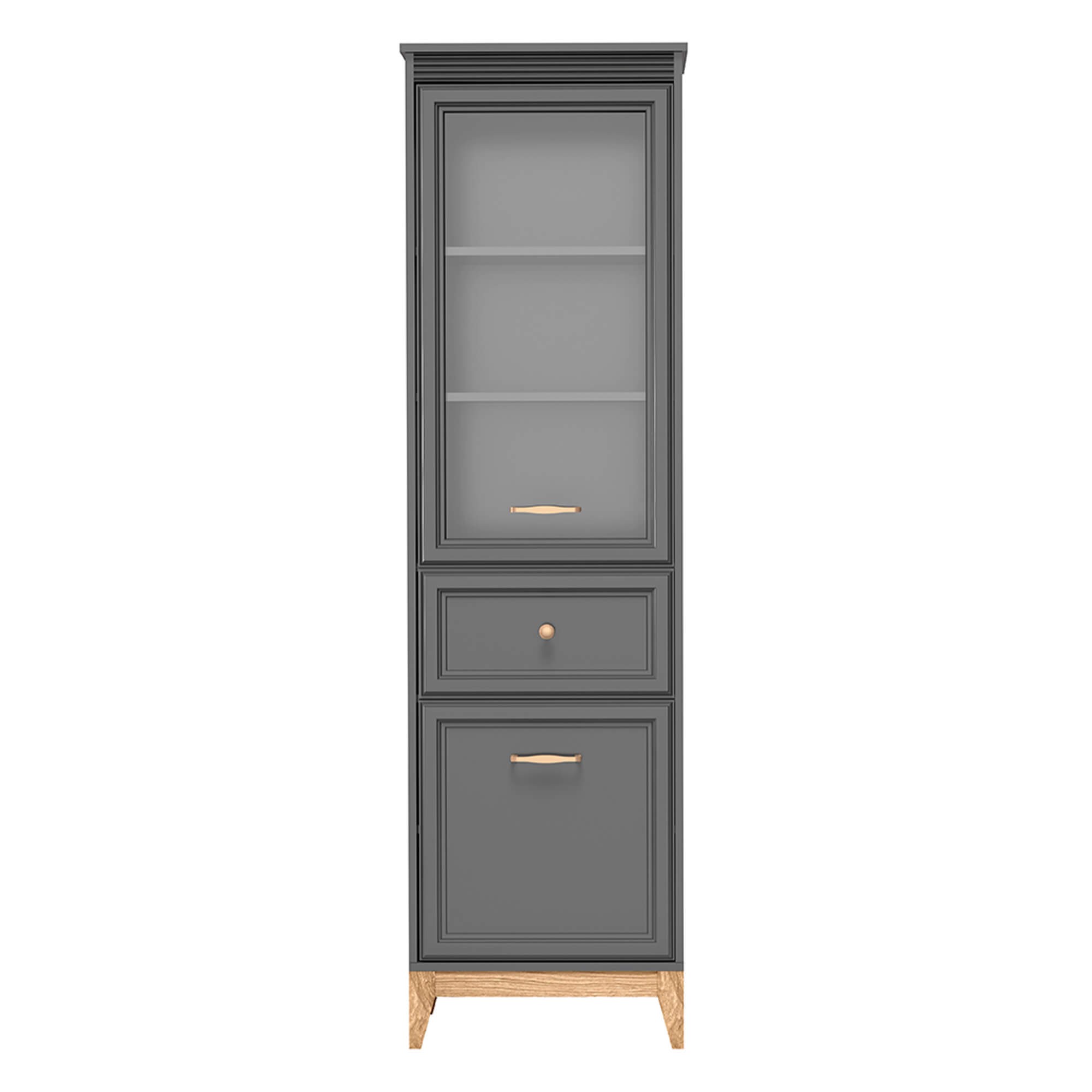 Witryna TERRA TA-6 to prawdziwy majstersztyk wykorzystania przestrzeni pionowej. Przy szerokości zaledwie 55 cm i imponującej wysokości 193 cm, ten mebel sprawdzi się wszędzie tam, gdzie centymetry są na wagę złota – w wąskim przedpokoju, przy ścianie w salonie czy w stylowym gabinecie. Szary, diamentowy odcień frontów w połączeniu z ciepłem naturalnego dębu tworzy kompozycję pełną klasy i nowoczesnego szyku.