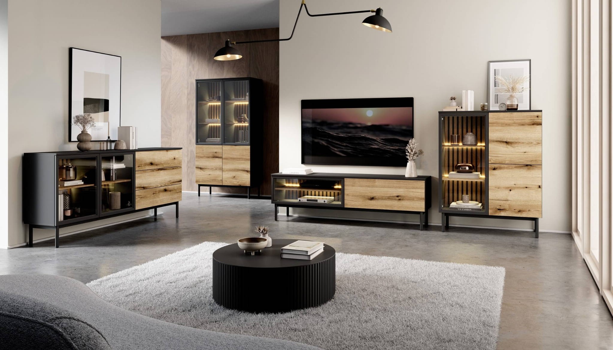 Witryna niska z oświetleniem LANG lamele / dąb evoke, czarny