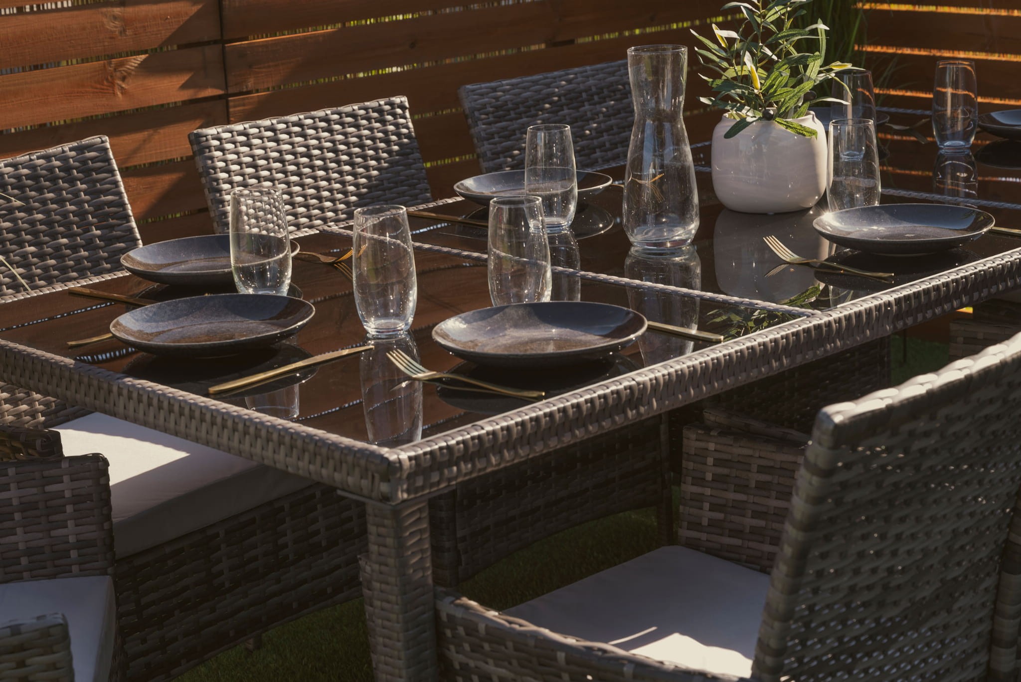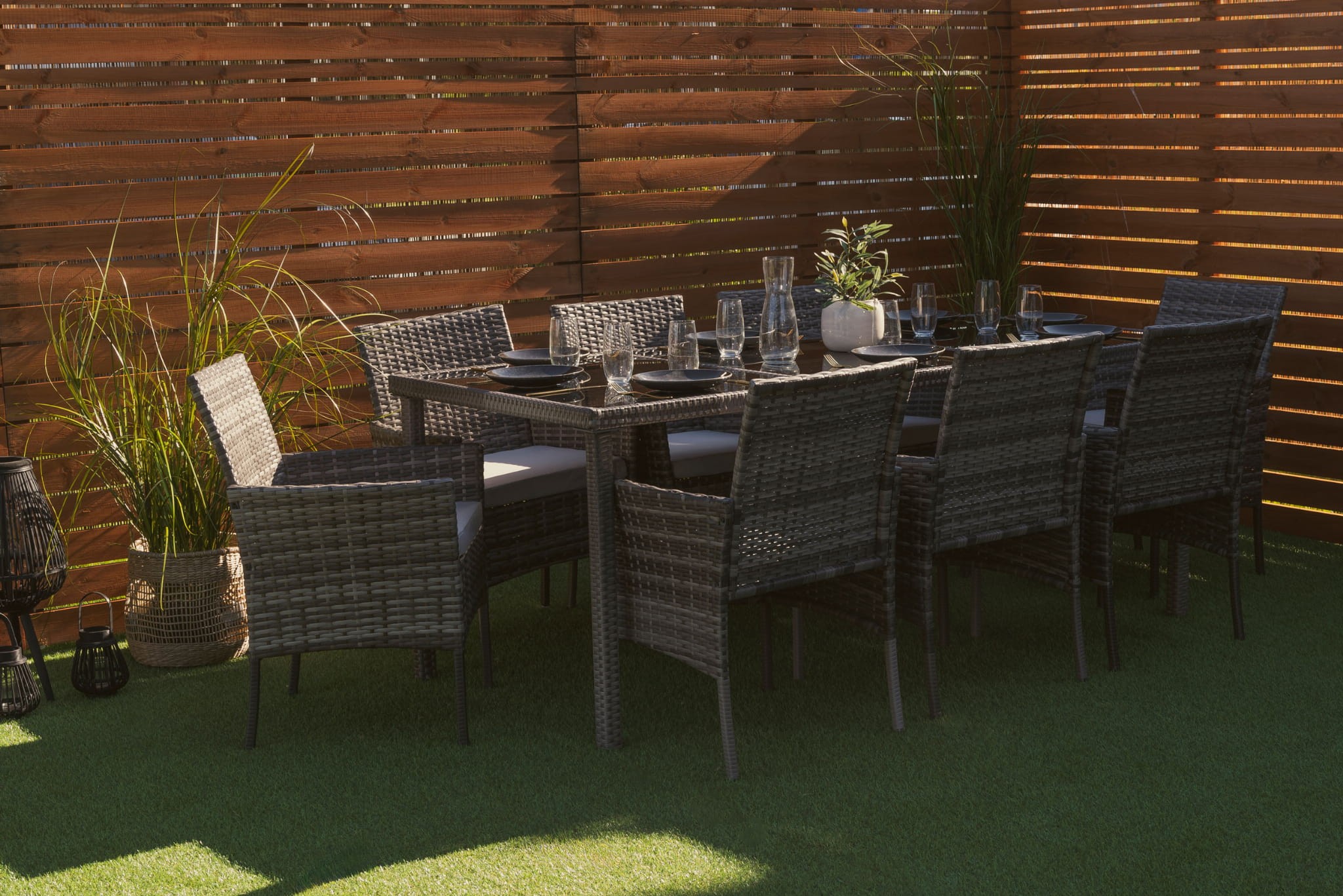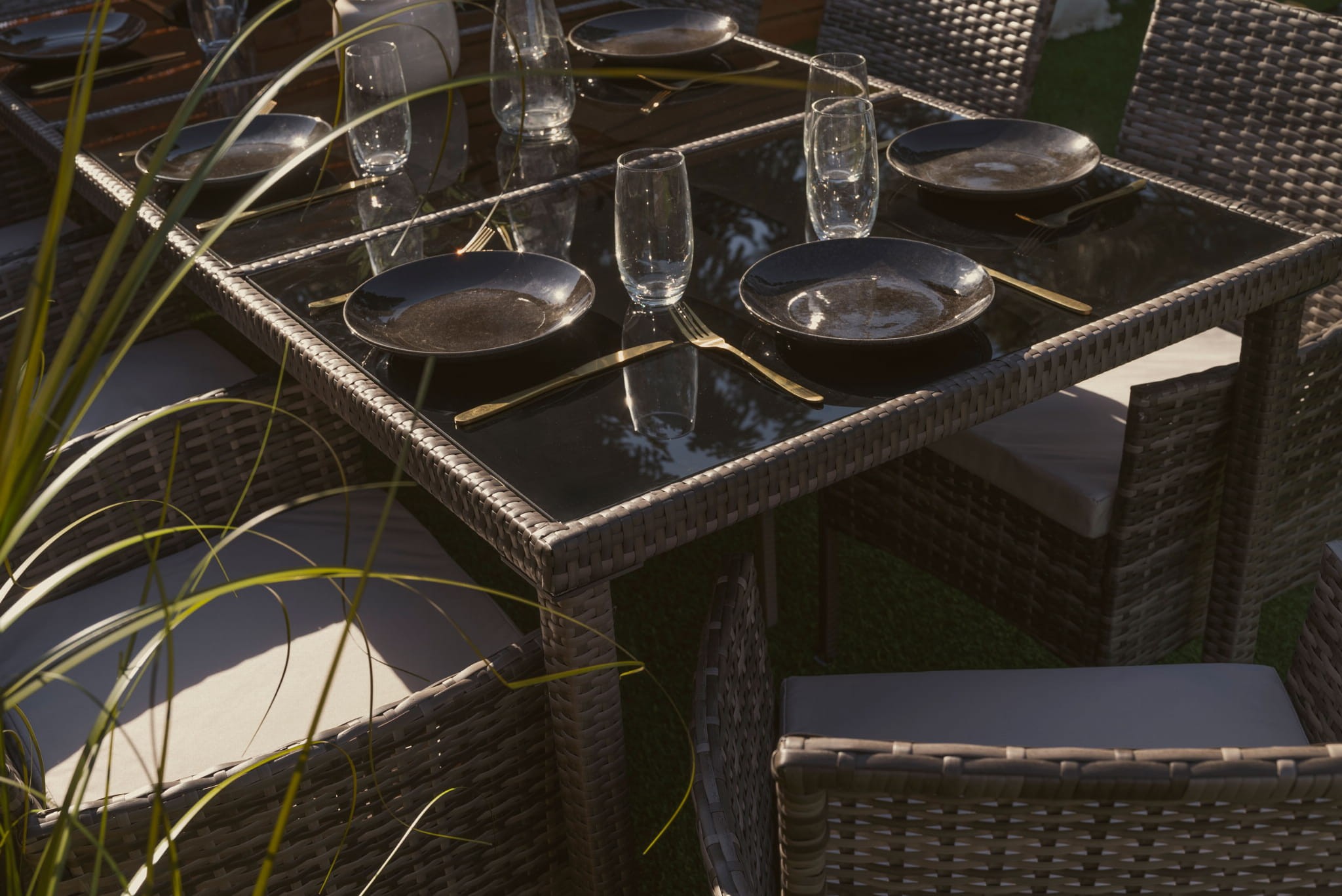 Niezwykle wygodny zestaw ogrodowy obiadowy dla 8 osób - MILOT to połączenie najwyższej jakości materiałów i precyzyjnego, bardzo starannego wykonania. To meble, które dzięki praktycznemu wykonaniu sprawdzą się jako wyposażenie ogrodu, tarasu, balkonu lub werandy. Komplet składa się z 8 wyprofilowanych i wygodnych krzeseł oraz stołu obiadowego, który umożliwia organizację rodzinnych przyjęć czy spotkań przy kawie i grillu. Każde siedzisko uzupełnione jest o wygodną i przytulną poduchę, która zapewnia wygodę podczas relaksu, a miłe w dotyku poszewki cechuje odporność na intensywne użytkowanie i zmienne warunki pogodowe. Zamki błyskawiczne umożliwiają zdejmowanie ich do prania. Przepiękne, szare wybarwienie bez trudu wkomponuje się w każdą aranżację, a zwłaszcza taką pełną drewna i naturalnych zielonych roślin. Konstrukcja mebli wykonana jest z metalu i ręcznie opleciona technorattanem – jego estetyczna plecionka dodaje elegancji i charakteru, zabezpiecza stal przed rdzewieniem, a do tego jest wytrzymała i odporna na intensywne użytkowanie. Tak wykonana podstawa mebli dodaje stabilności, gwarantuje wytrzymałą budowę wraz z odpornością na potencjalne uszkodzenia. Zestaw ogrodowy MILOT prezentuje się lekko, minimalistycznie, a ażurowa plecionka jest odporna na zbieranie kurzu i wilgoci.