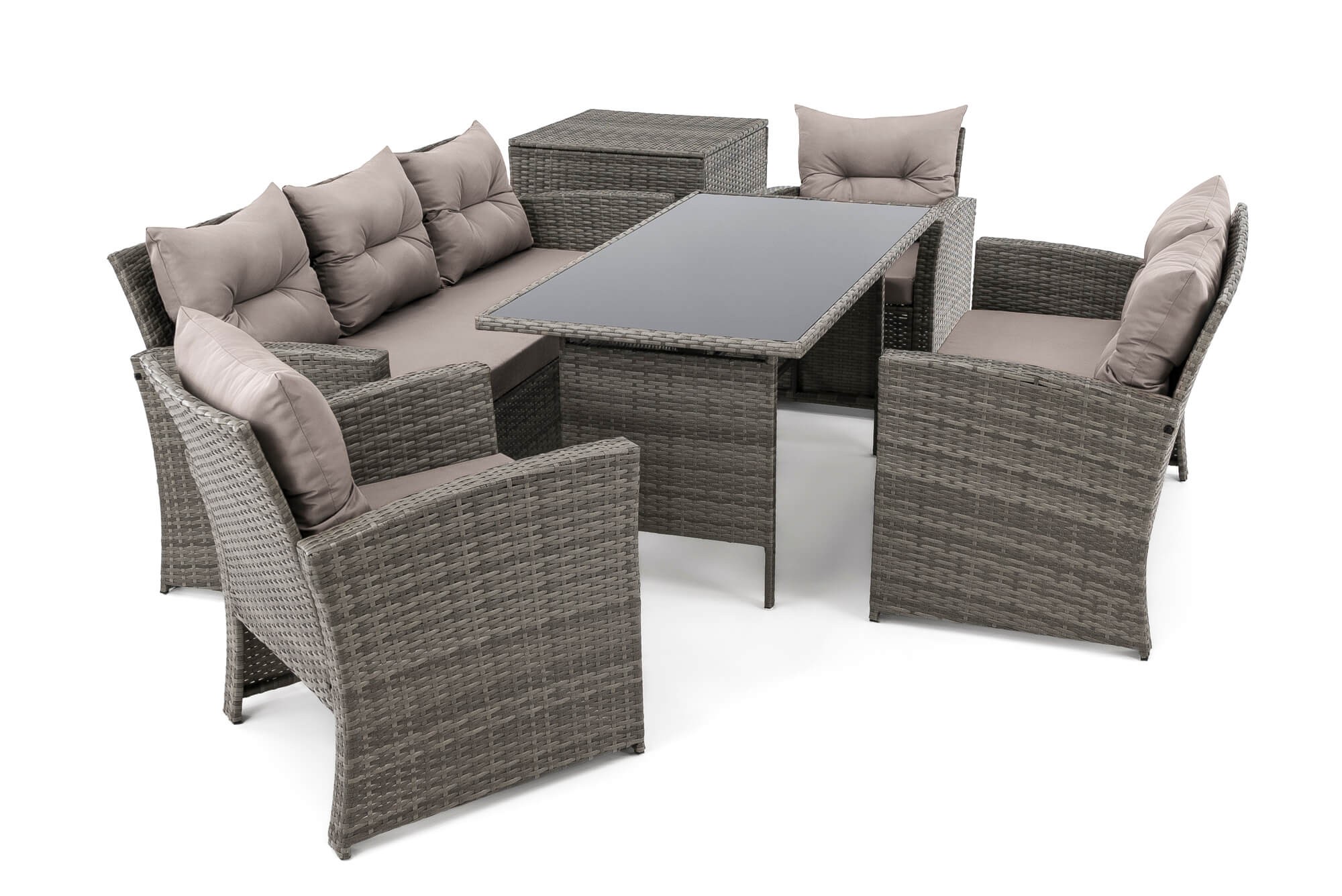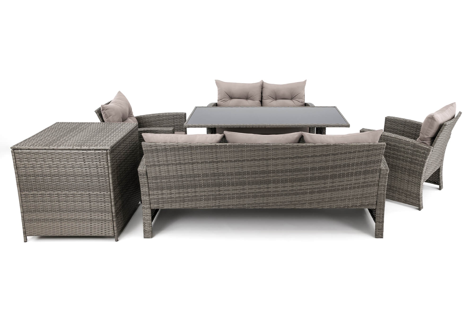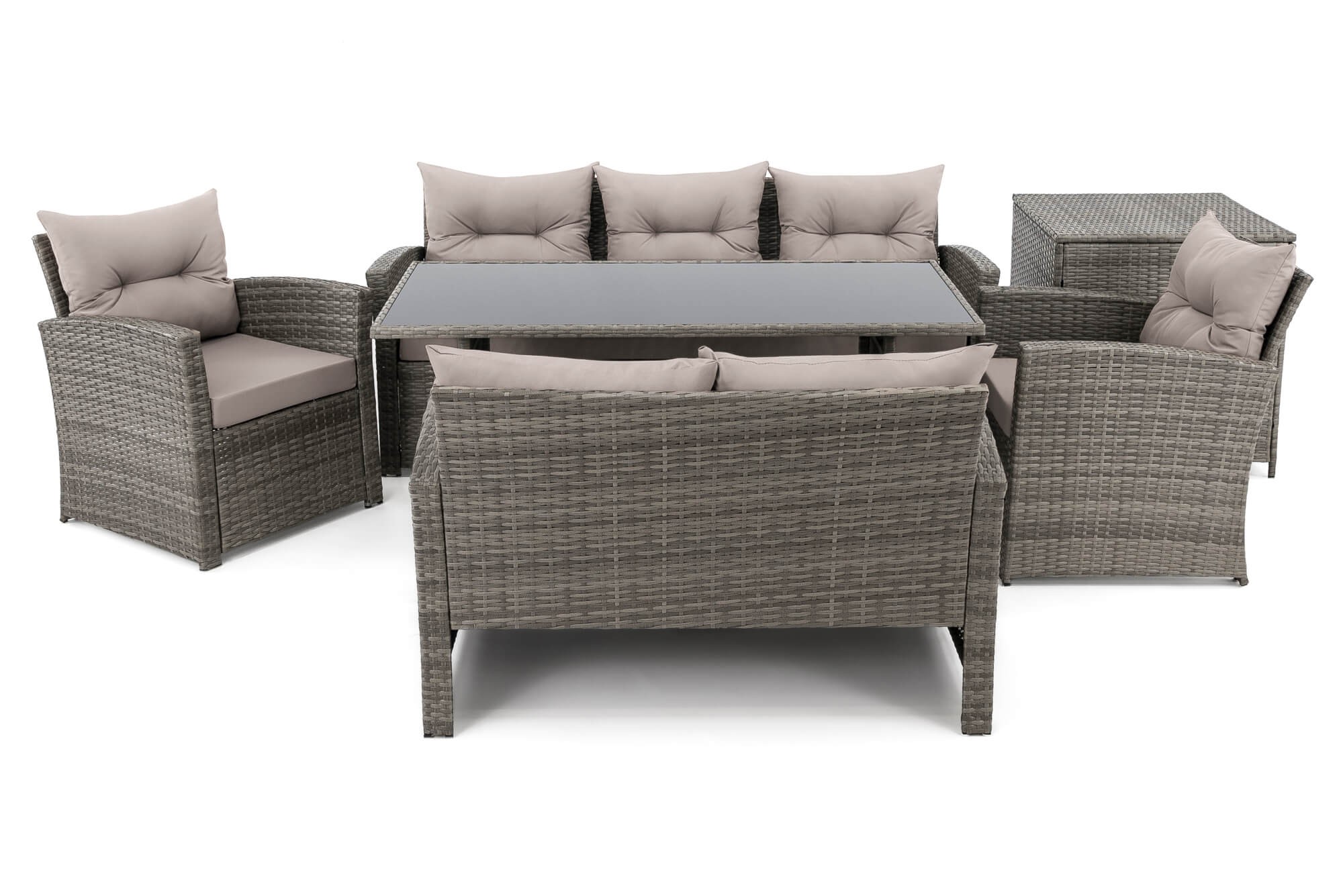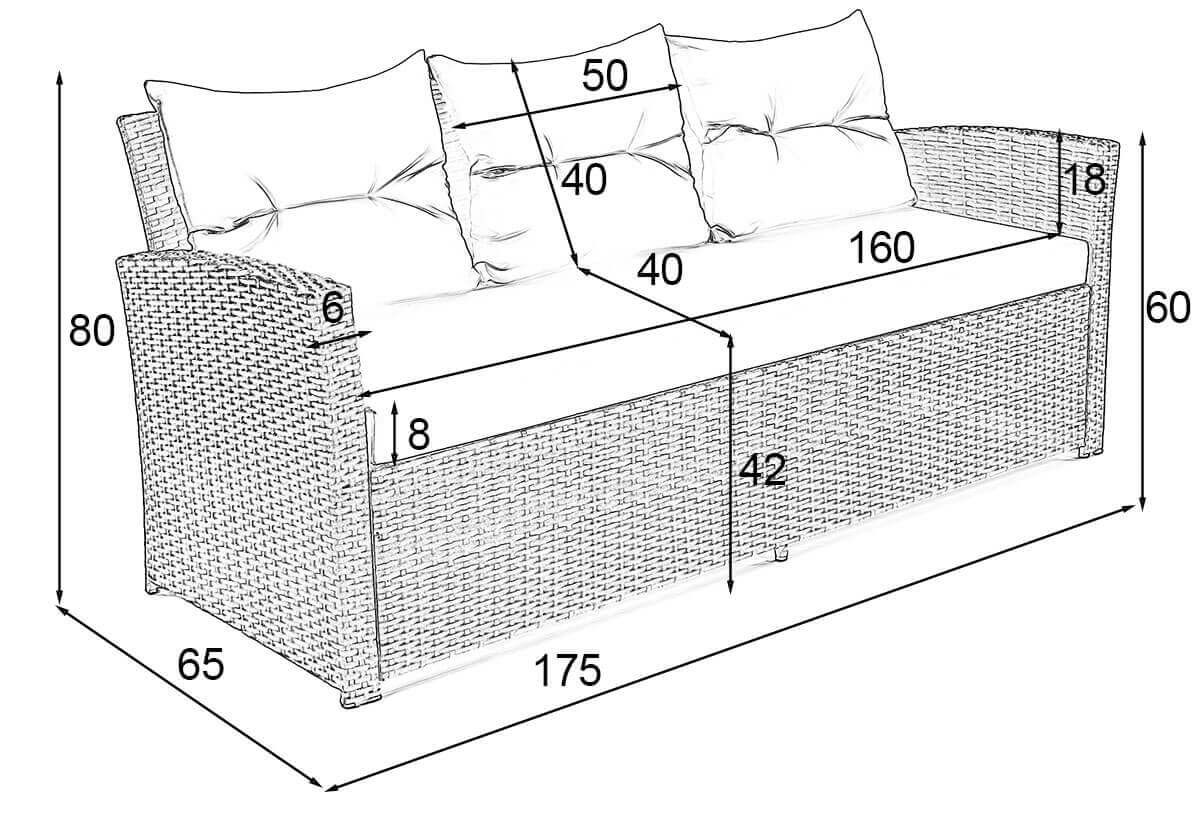 • Zestaw składa się z sofy trzyosobowej, sofy dwuosobowej, 2 foteli, pojemnika na poduszki i dużego stołu