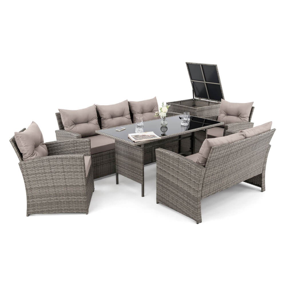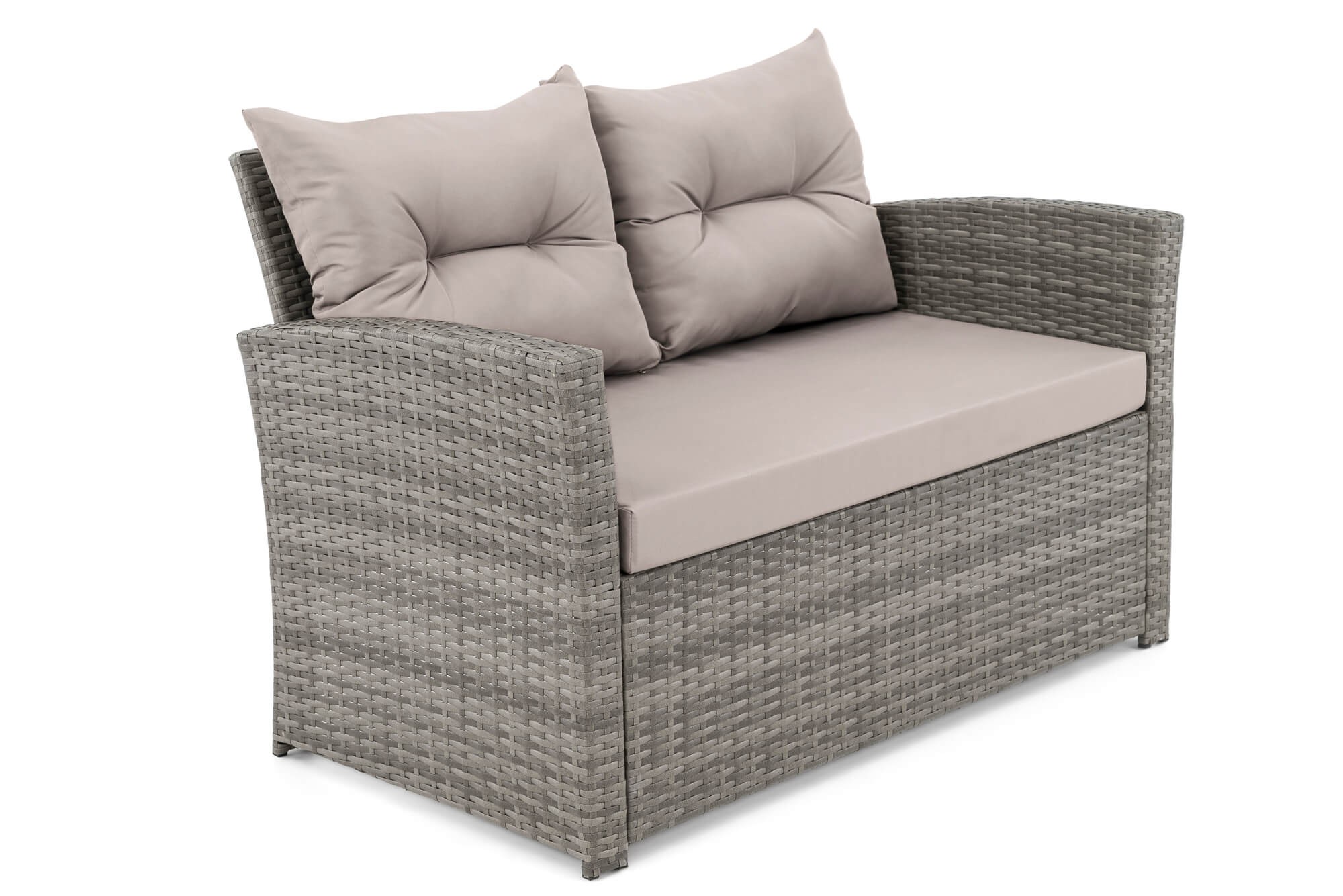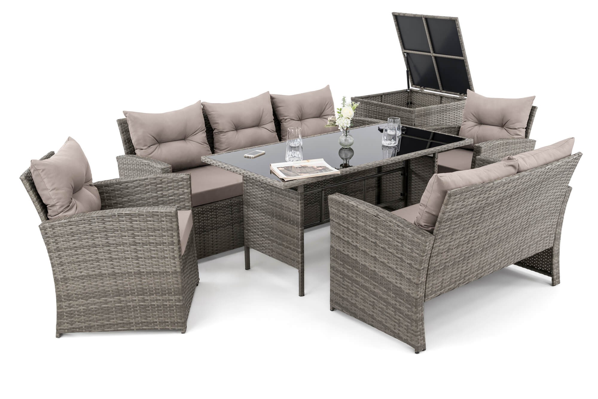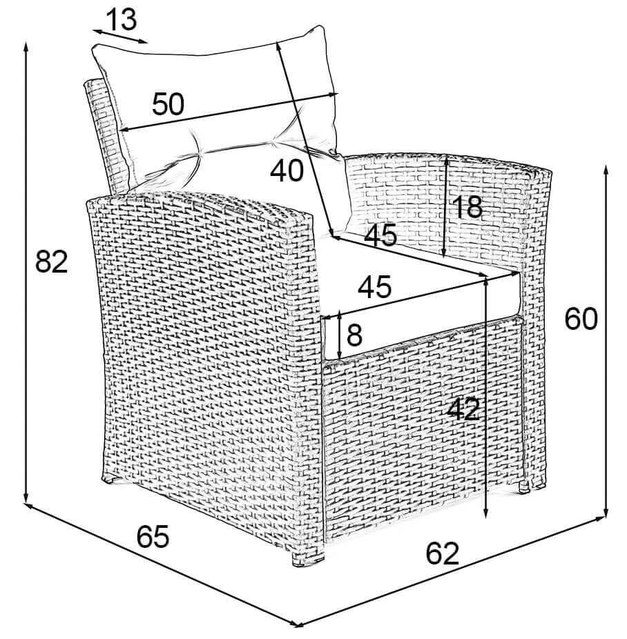 • Zestaw składa się z sofy trzyosobowej, sofy dwuosobowej, 2 foteli, pojemnika na poduszki i dużego stołu