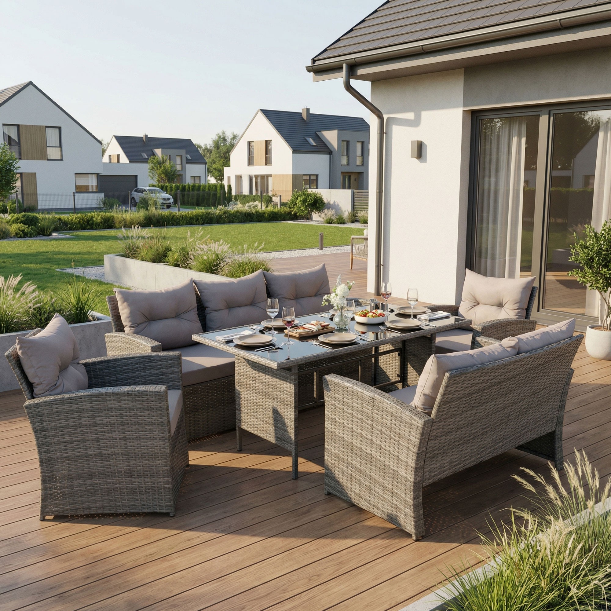 • Praktyczny komplet mebli do ogrodu dla 7 osób
