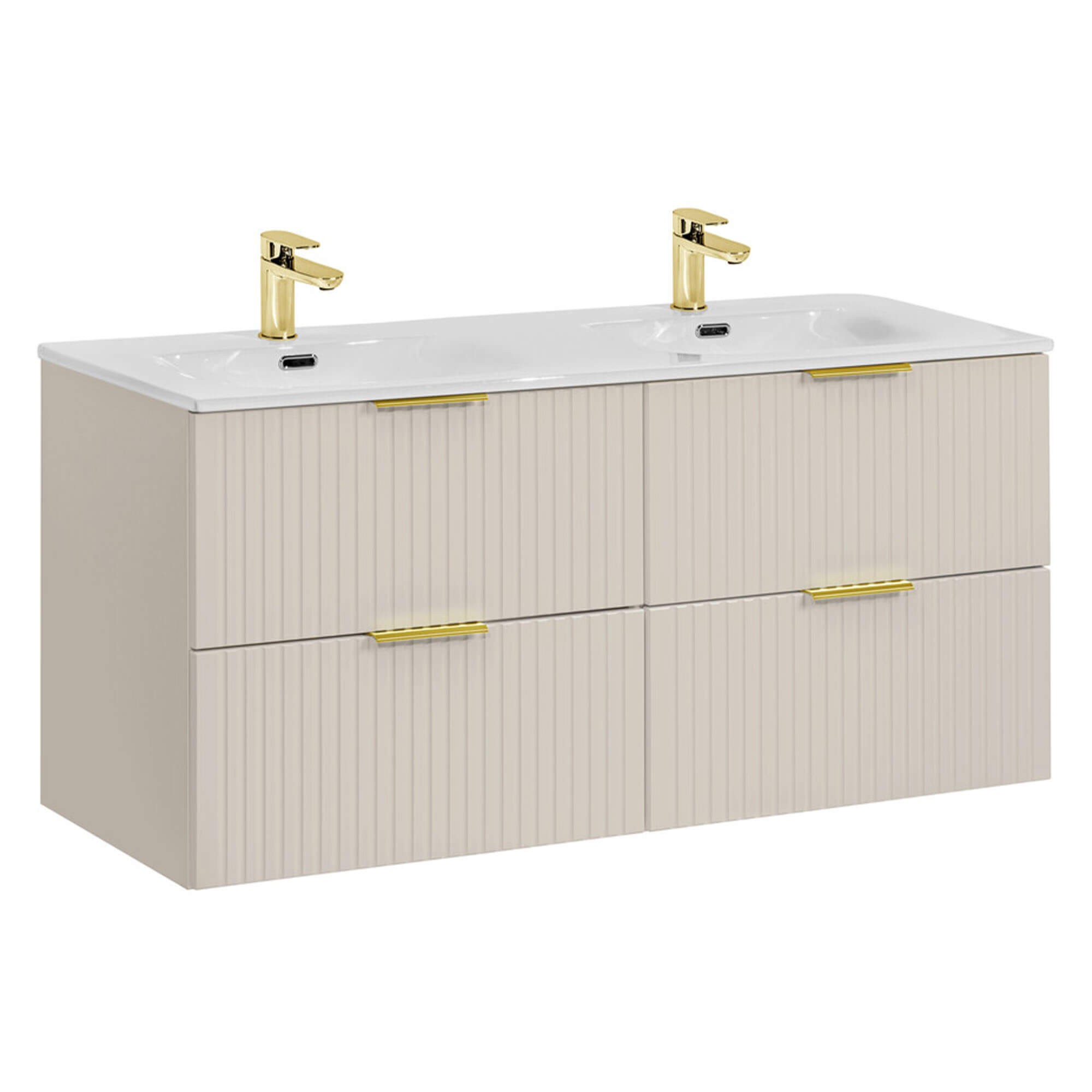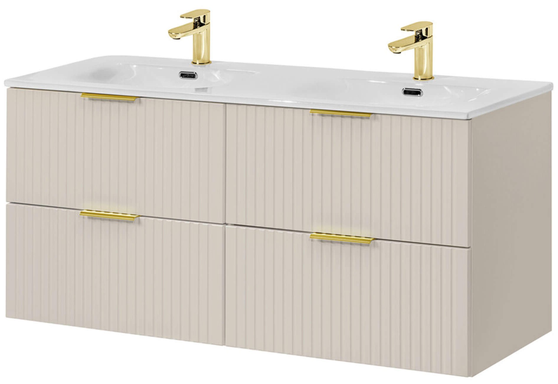 Zestaw meblowy 120 cm z umywalką meblową SKY z Kolekcji ADEL CASHMERE to połączenie niezwykłej elegancji i funkcjonalności, które odmieni każdą łazienkę. Fronty wykonano z wilgocioodpornej płyty MDF, pokrytej luksusowym, matowym laminatem w odcieniu kaszmiru, a precyzyjne frezowanie CNC tworzy subtelne pionowe ryfle, które grają światłem i dodają bryle lekkości. Górny blat oraz dekoracyjne elementy wykończono laminatem imitującym naturalne usłojenie dębu Wotan, co wprowadza do wnętrza ciepły, przytulny akcent drewna. Obrzeża zabezpieczono odporną na wilgoć taśmą ABS, chroniącą mebel przed uszkodzeniami podczas codziennego użytkowania. Szuflady i szafki osadzono na prowadnicach soft-close z cichym domykaniem, a ukryte zawiasy podkreślają minimalistyczny, nowoczesny design. Metalowe uchwyty dostępne są w wykończeniach złotego połysku, chromu lub czarnego matu, co pozwala na indywidualne dopasowanie stylu. Solidna konstrukcja i najwyższej jakości materiały gwarantują trwałość i łatwość w utrzymaniu czystości, dzięki czemu Zestaw meblowy 120 cm z umywalką SKY stanie się sercem Twojej łazienki na lata. Zamów już dziś i odkryj, jak kaszmirowy mat przemieni Twoją przestrzeń!