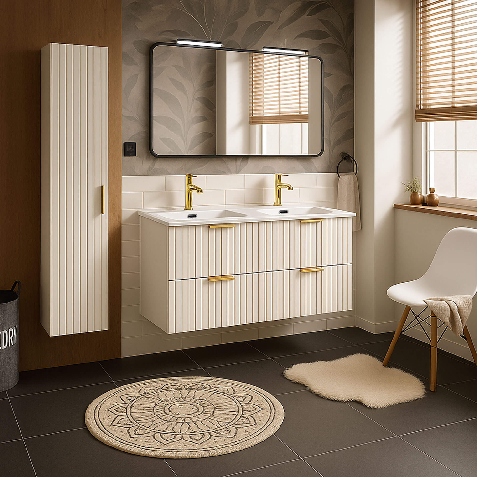 Zestaw meblowy 120 cm z umywalką meblową SKY i szafką wysoką z kolekcji ADEL CASHMERE w eleganckim wykończeniu Kaszmirowy Mat to idealne rozwiązanie dla nowoczesnej łazienki, łączące styl i funkcjonalność. Solidna konstrukcja z wilgocioodpornej płyty MDF o grubości 18 mm gwarantuje trwałość i odporność na wilgoć, a fronty pokryte matową okleiną w modnym odcieniu kaszmiru z precyzyjnym, pionowym frezowaniem dodają meblom luksusowego charakteru. Dzięki modułowej budowie zestaw składa się z dwóch szafek podumywalkowych oraz wysokiego słupka, które można dowolnie zestawiać i dopasować do przestrzeni o standardowej głębokości 46 cm. Umywalka meblowa SKY wykonana z ceramiki najwyższej jakości została wyposażona w dwie wtopione misy, co podkreśla nowoczesny design i ułatwia codzienne użytkowanie. Szuflady z metalowymi prowadnicami pełnego wysuwu i wzmocnionymi dnami oferują obszerną przestrzeń do przechowywania, a system soft-close zapewnia ciche i płynne domykanie. Do wyboru są eleganckie uchwyty w trzech wykończeniach – złoty połysk, czarny mat lub chrom połysk – dzięki czemu każdy może dopasować zestaw ADEL CASHMERE do swojego stylu. Gotowe otwory montażowe oraz czytelna instrukcja sprawiają, że montaż mebli jest szybki i bezproblemowy. Postaw na wyjątkowy komfort i ponadczasową estetykę – wybierz Zestaw meblowy 120 cm z umywalką meblową SKY i szafką wysoką z kolekcji ADEL CASHMERE w kolorze Kaszmirowy Mat.