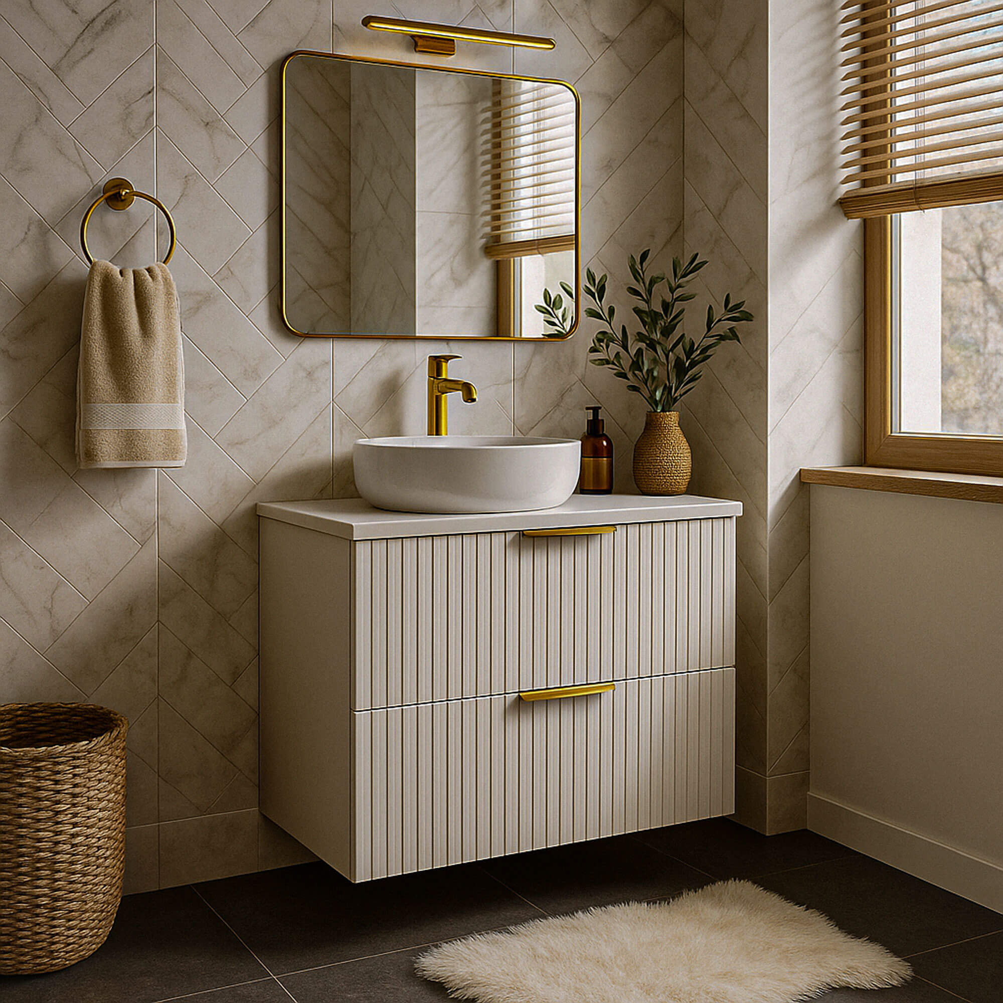 Zestaw meblowy 60 cm z blatem z kolekcji ADEL CASHMERE w wykończeniu Kaszmirowy Mat to synonim nowoczesnego designu i niezawodnej funkcjonalności w Twojej łazience. Solidna konstrukcja z wilgocioodpornej płyty MDF o grubości 18 mm gwarantuje trwałość nawet w najbardziej wymagających warunkach, a eleganckie fronty z pionowym frezowaniem podkreślają minimalistyczny, a zarazem luksusowy charakter mebla. Blat z ceramiki o wymiarach 60 × 46 cm zachwyca odpornością na zarysowania i prostotą utrzymania czystości, dzięki czemu codzienne użytkowanie staje się jeszcze przyjemniejsze. Dwupoziomowa szafka 60 × 46 cm z dwiema pojemnymi szufladami pozwala na wygodne przechowywanie wszystkich niezbędnych akcesoriów łazienkowych, a system soft-close oraz ciche zawiasy gwarantują płynne i bezgłośne domykanie frontów. Metalowe prowadnice pełnego wysuwu i wzmocnione dna szuflad zwiększają nośność i wytrzymałość mebla, a możliwość wyboru uchwytów w trzech stylowych wariantach – złoty połysk, czarny mat lub chrom połysk – pozwala dopasować zestaw do każdego wnętrza. Wybierz Zestaw meblowy 60 cm z blatem ADEL CASHMERE Kaszmirowy Mat i wprowadź do swojej łazienki harmonię, elegancję oraz najwyższą jakość wykonania.