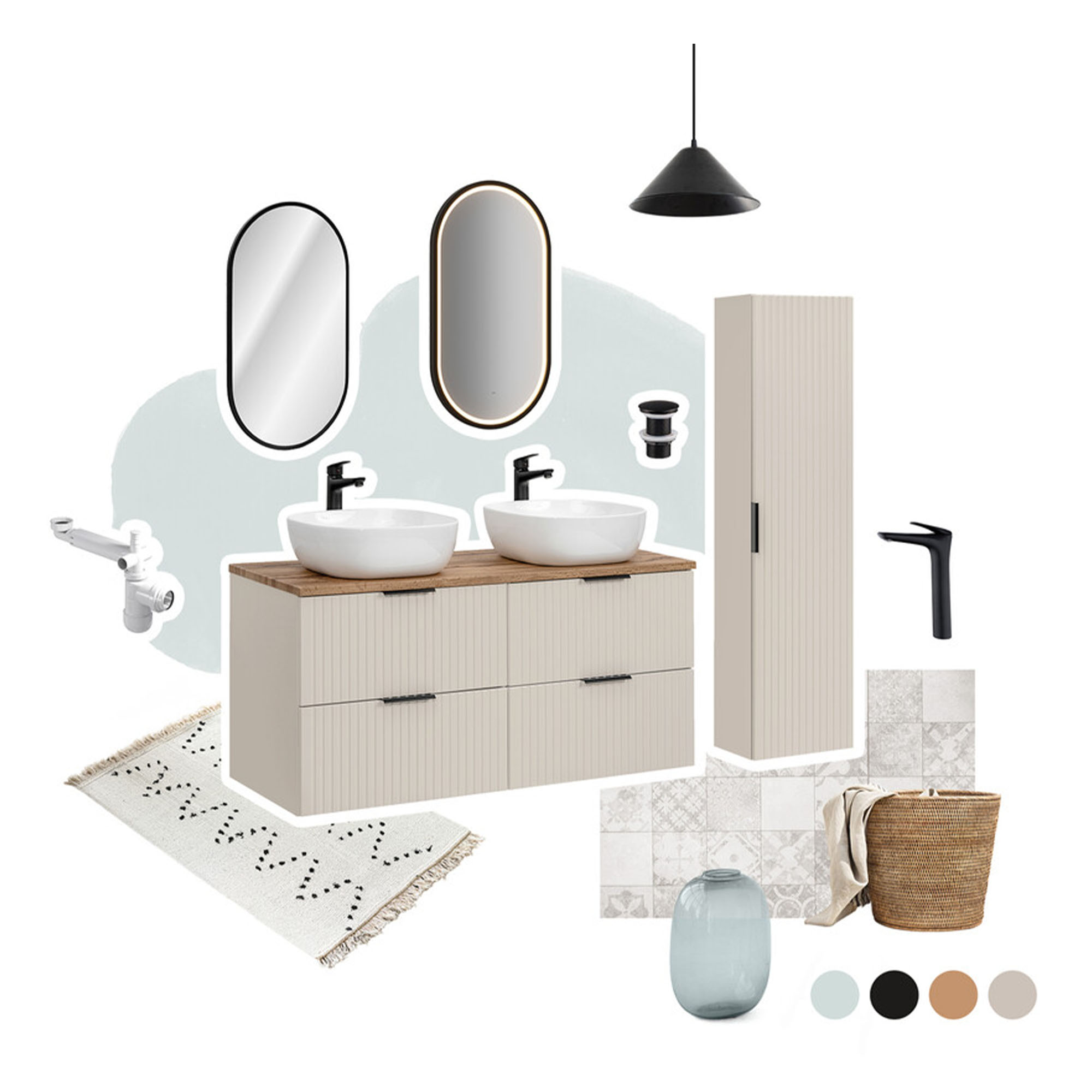 Zestaw meblowy 80 cm z blatem, umywalką nablatową Smile 40 i wysoką szafką z kolekcji Adel Cashmere w dekorze Dąb Wotan i Kaszmirowy Mat to propozycja dla miłośników harmonii stylu i funkcjonalności. Subtelny odcień kaszmiru mat na korpusach i frontach harmonijnie stapia się z naturalną fakturą dębu Wotan, którą prezentuje solidny blat. Centralnym punktem aranżacji jest elegancka umywalka Smile 40 DP z najwyższej klasy białej ceramiki, subtelnie osadzona na blacie, co nadaje całości lekkości i nowoczesnego charakteru. Pionowe frezowania na frontach dodają meblom głębi i wysmakowanej struktury, a metalowe uchwyty w wykończeniu czarnego matu, złotego połysku lub chromu pozwalają na personalizację według Twojego gustu. Przemyślane wnętrze szafki pod umywalkę i wysokiej kolumny z półkami zapewnia miejsce na kosmetyki i ręczniki, a solidny montaż ścienny na stalowych wspornikach podkreśla wrażenie “lewitujących” mebli. Obrzeża i powierzchnie zabezpieczono powłoką odporną na wilgoć, zarysowania i promieniowanie UV, dzięki czemu zestaw zachowa niezmiennie elegancki wygląd przez lata. Wybierz zestaw Adel Cashmere 80 cm i ciesz się łazienką, która łączy luksusowe wykończenia z codzienną wygodą użytkowania.